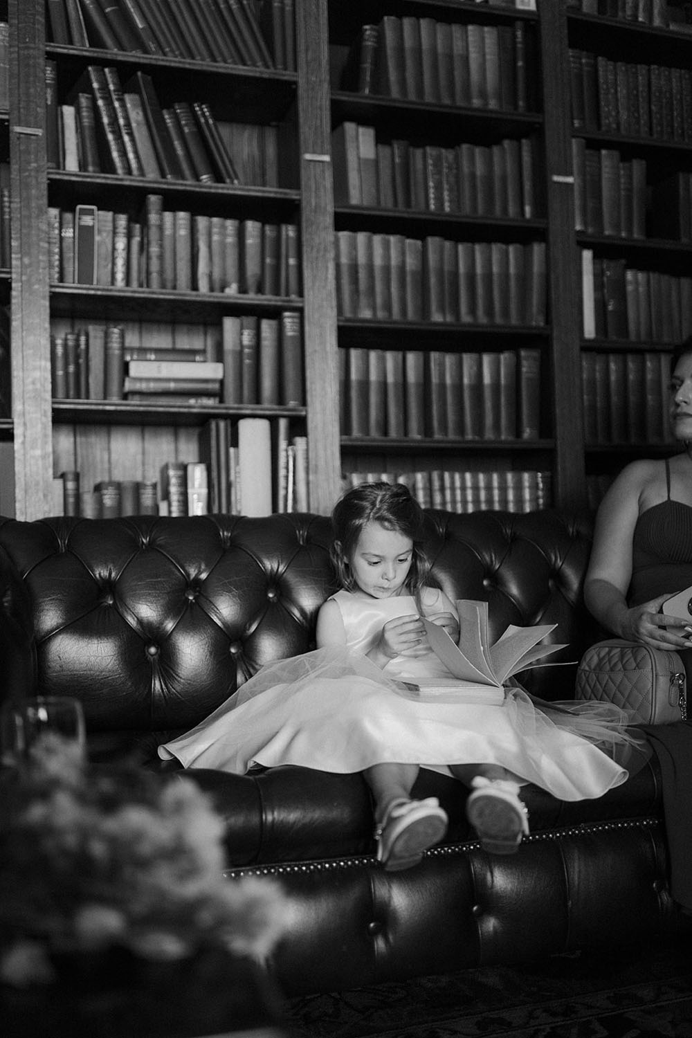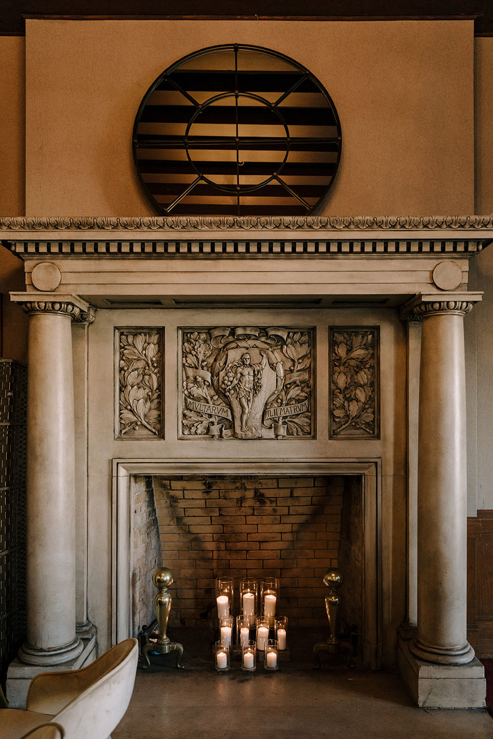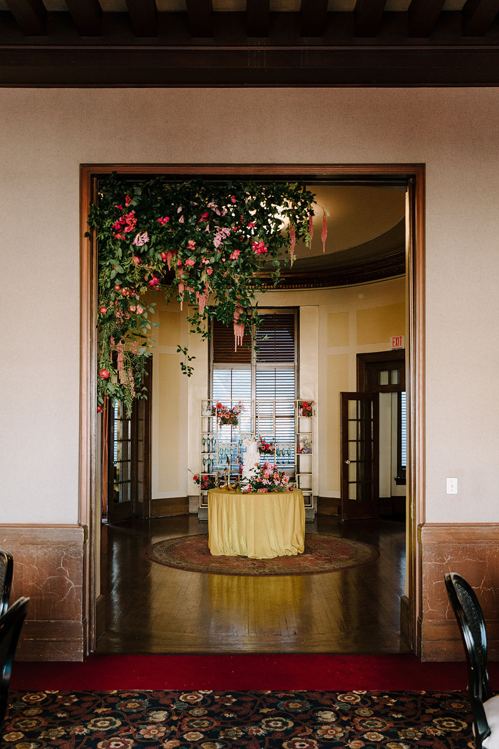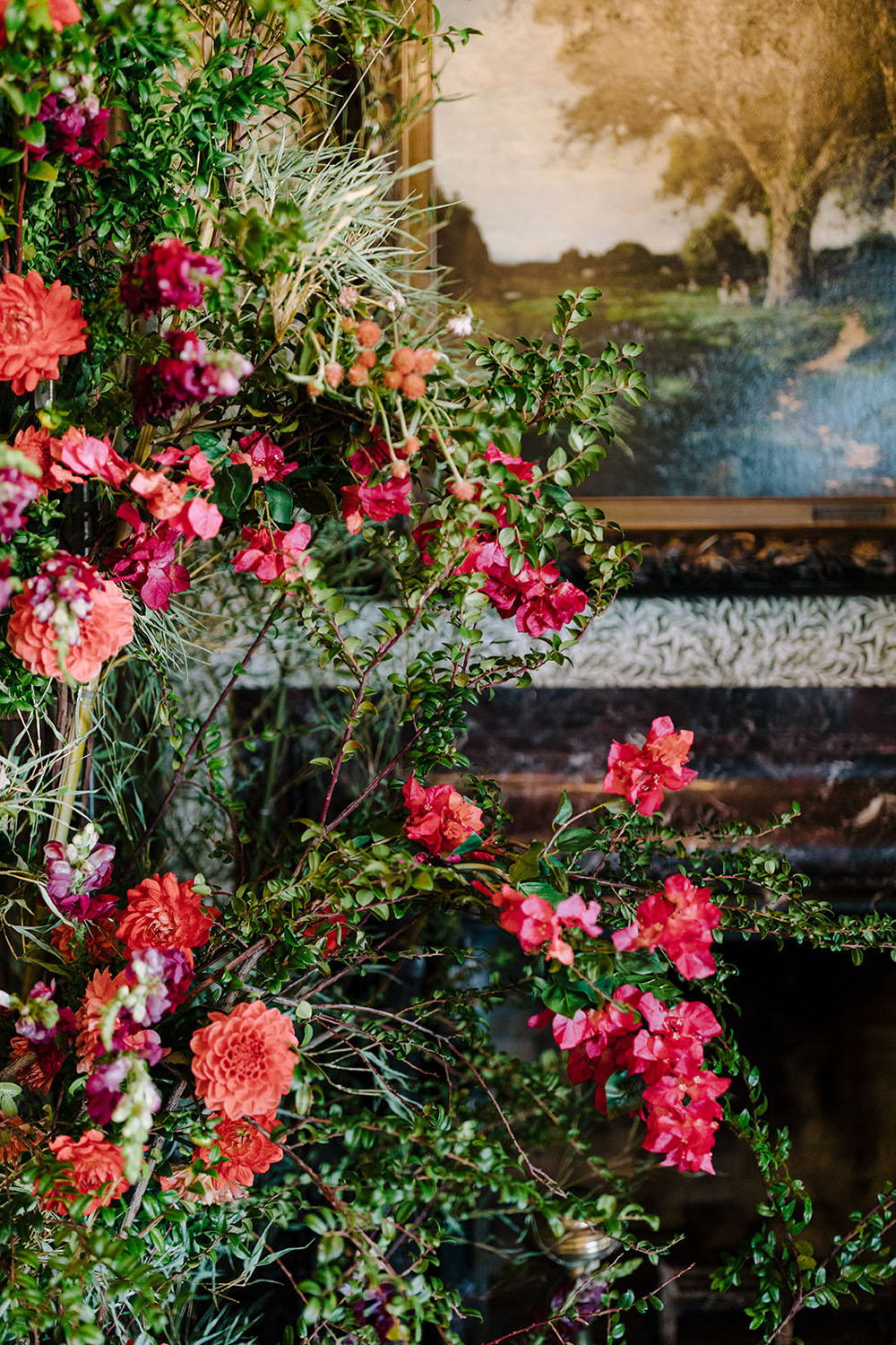 One of the most impressive design elements of the wedding was a floor-to-ceiling wall of red dahlias designed by Duet Botanical to complement the moody historic architecture surrounding them.