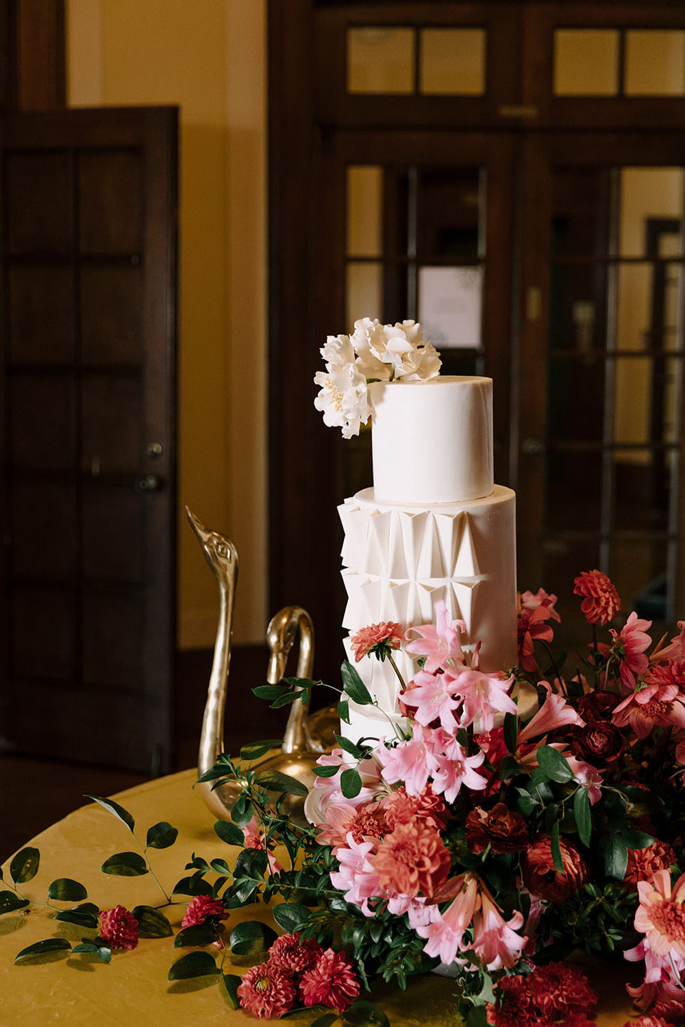Love how the couple chose a chic, modern all-white wedding cake by Daniel Saravia to contrast the maximalist vibes.