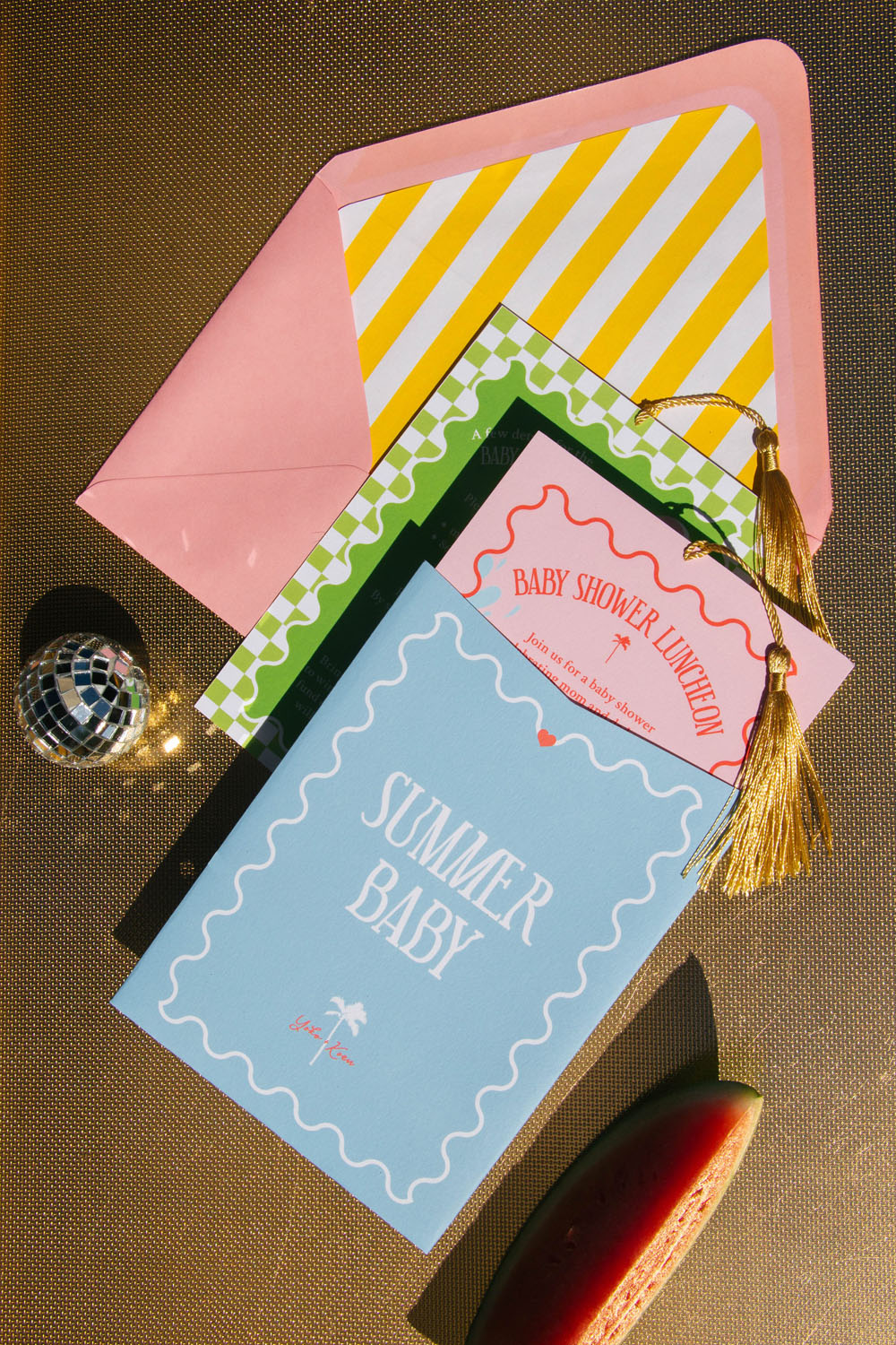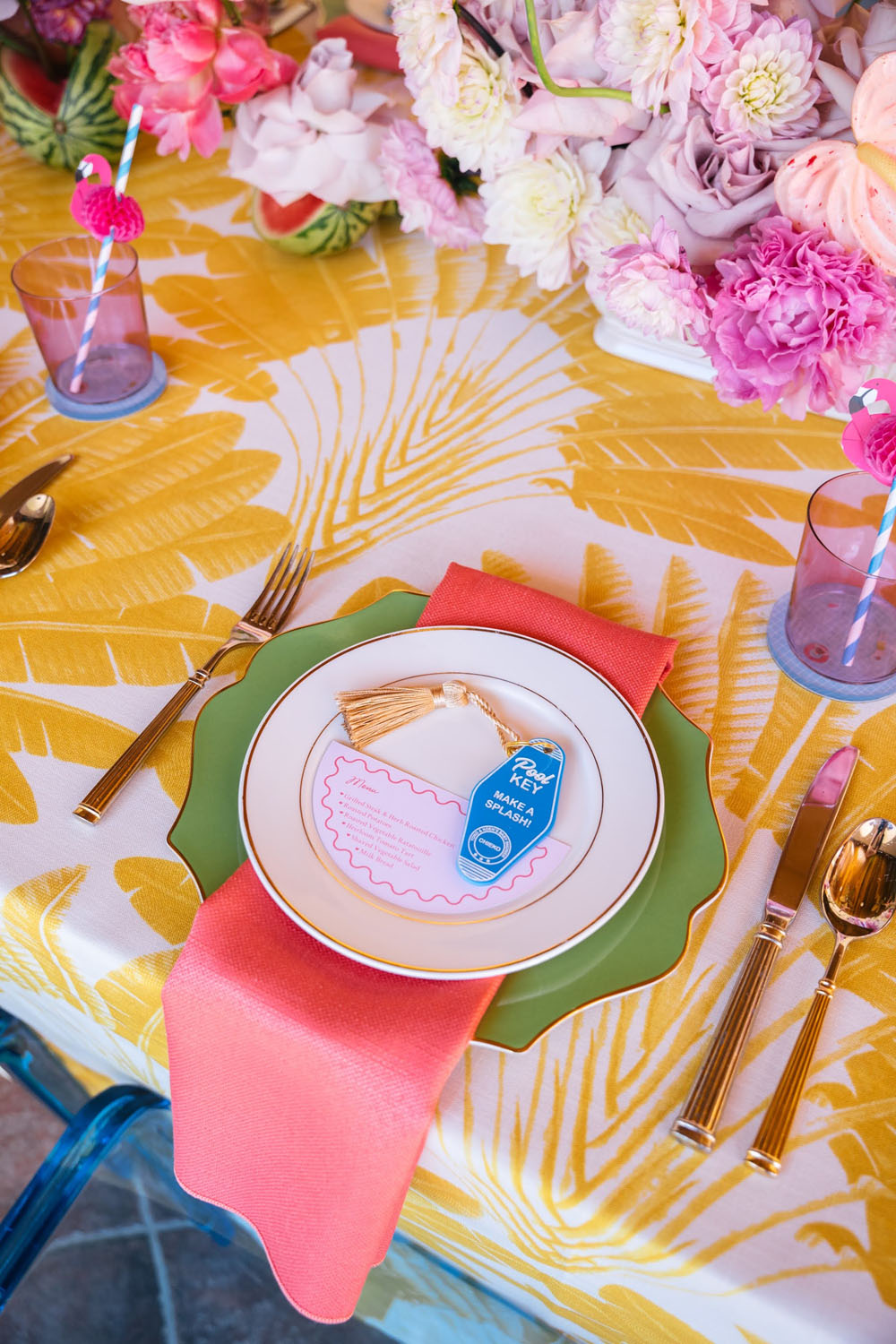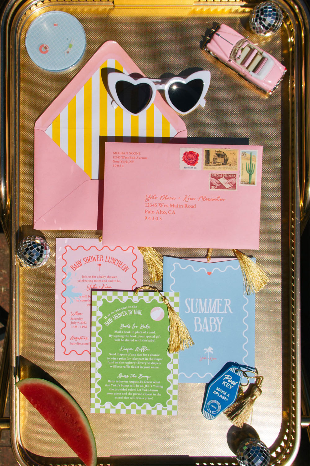 Our designer mama-to-be is also a stationer, so she had a blast dreaming up the invites for their Palm Springs baby shower luncheon. A pool-blue envelope sleeved housed the colorful, double-sided checkerboard invitation, topped with a gold tassel. They were mailed in pink envelopes with yellow cabana striped envelope liners. Everything at the baby shower matched both the colors of the invitation as well as the designs.