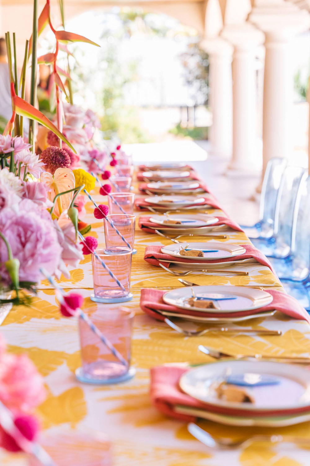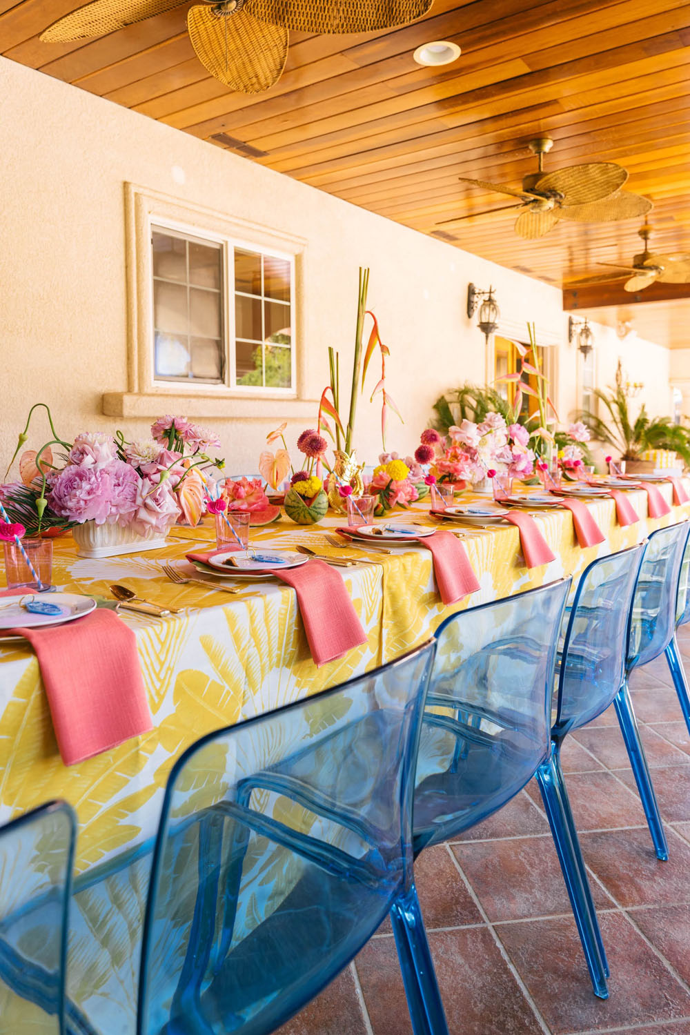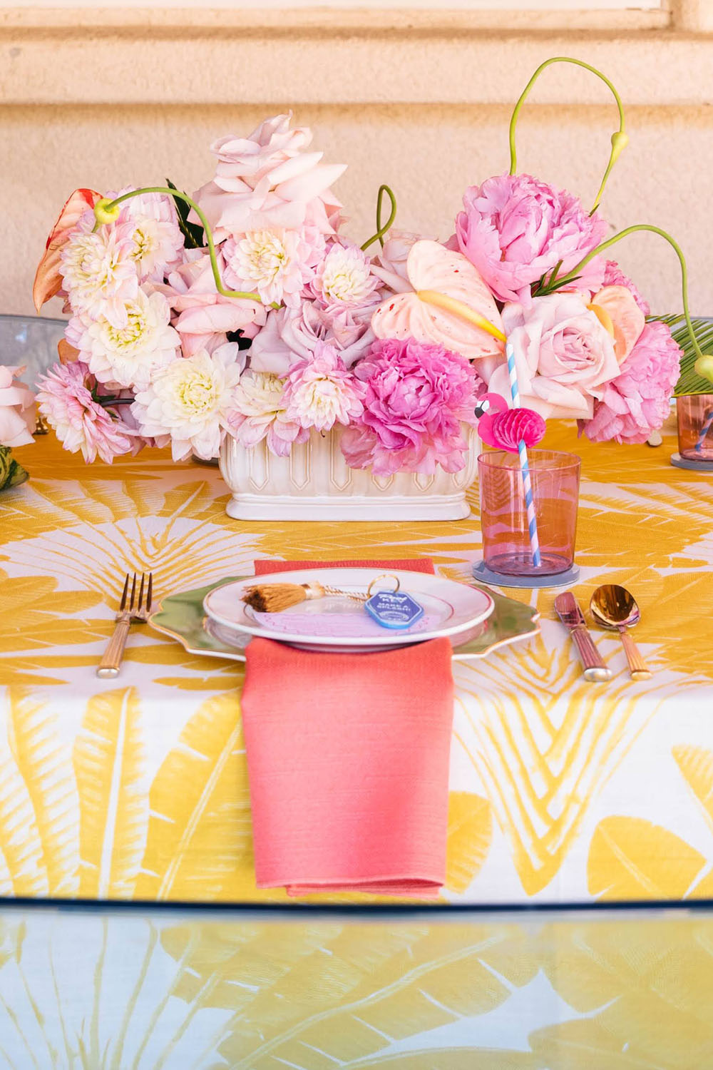 Our designer mama-to-be is also a stationer, so she had a blast dreaming up the invites for their Palm Springs baby shower luncheon. A pool-blue envelope sleeved housed the colorful, double-sided checkerboard invitation, topped with a gold tassel. They were mailed in pink envelopes with yellow cabana striped envelope liners. Everything at the baby shower matched both the colors of the invitation as well as the designs.