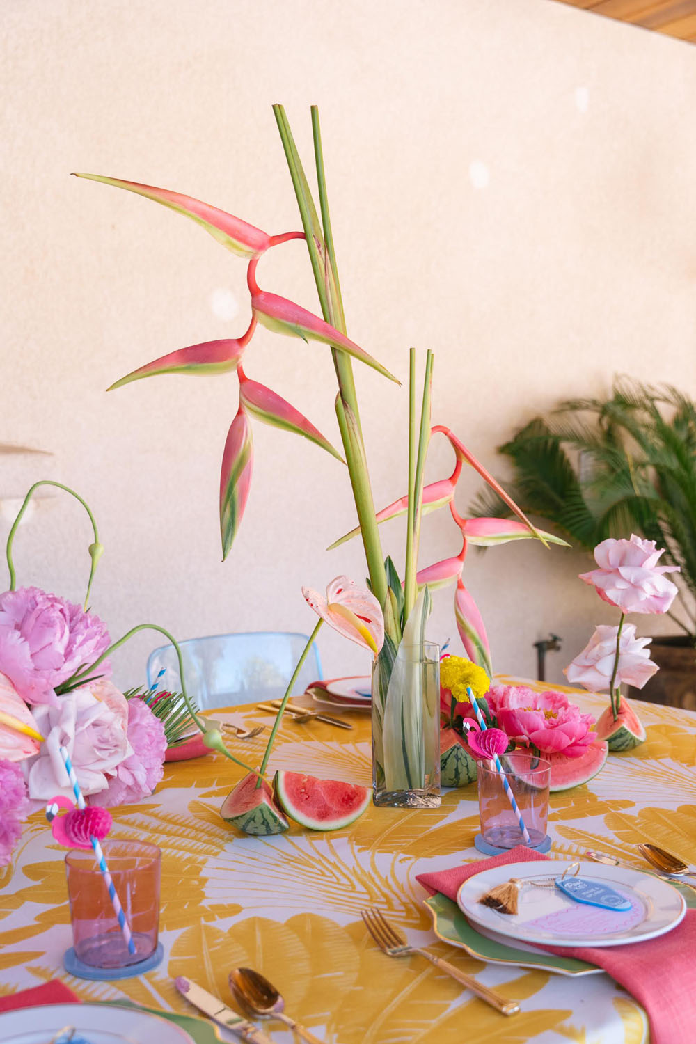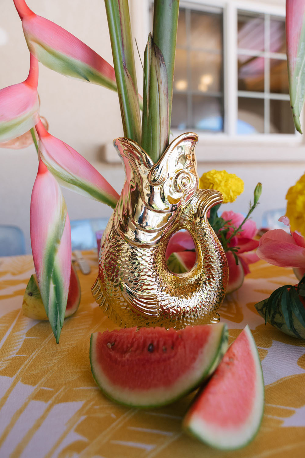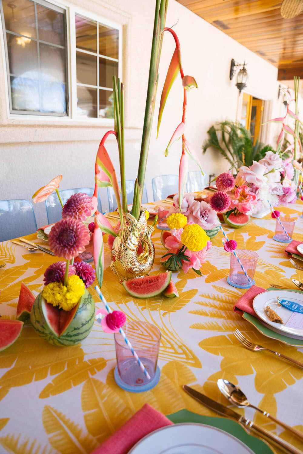 Yoko explains, The tables were adorned with the most beautiful and playful florals designed by Mister Lee Designs. The arrangements consisted of an array of flowers that included my favorite flower, the anthurium shibori. Some flowers were displayed in cut watermelon slices and the pink dahlia tuber flowers matched the pink flamingo straws.