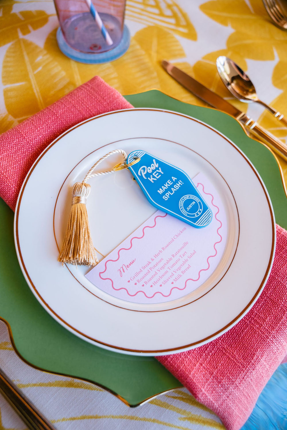 Guests found their seats via the custom designed motel keychains and got to take home their own coasters designed and made by the Two Perfect Events team, which depicted two swimmers in a pool.