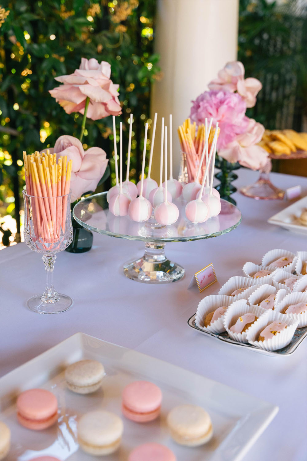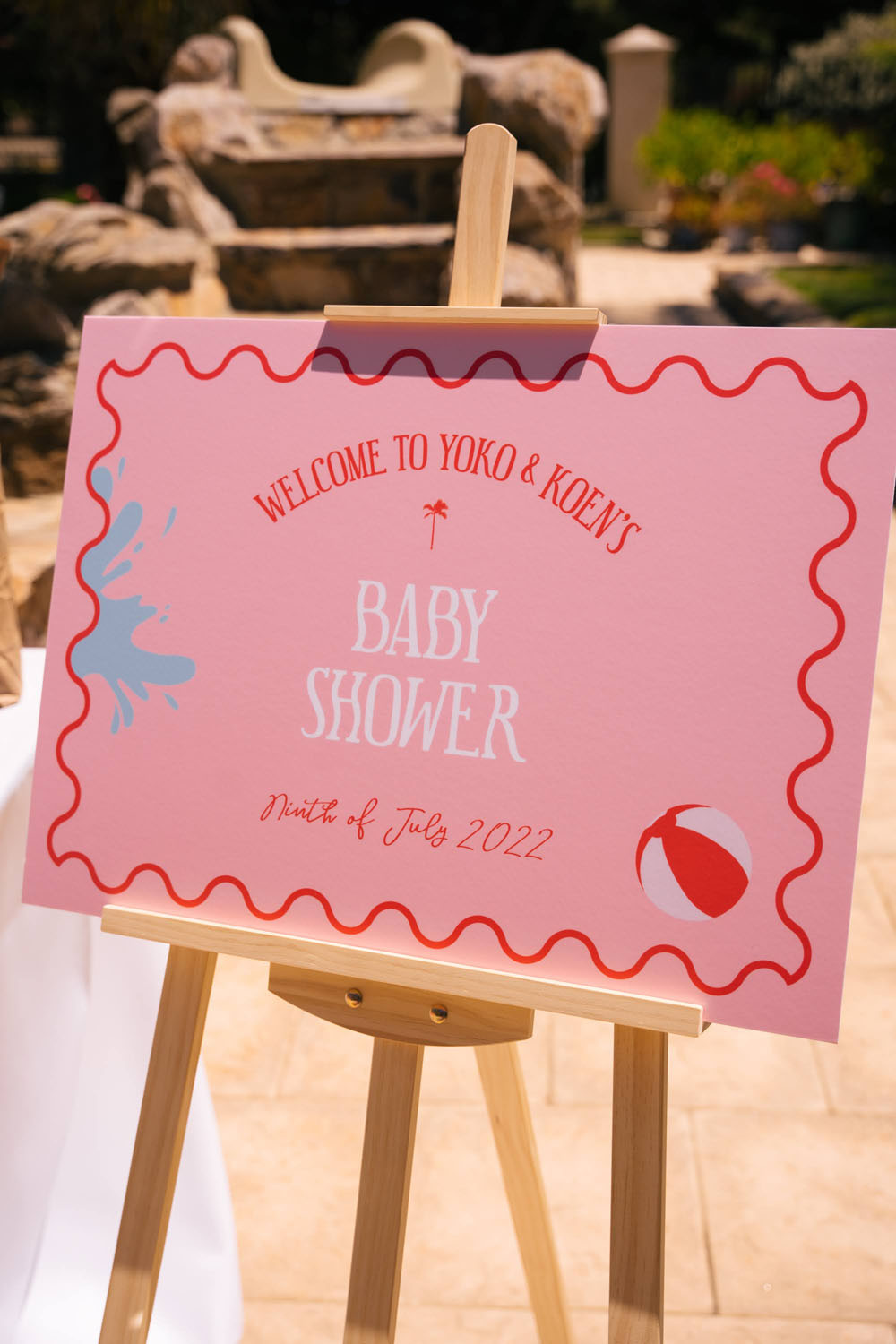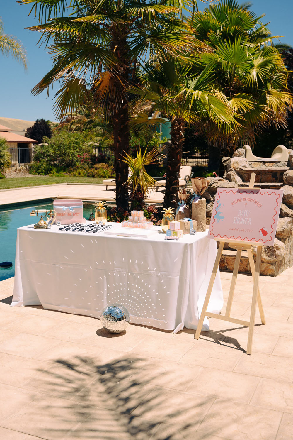 Guests were welcomed with a “mom-osa” bar cart with both alcoholic and non-alcoholic beverage options. TÖST was a big hit as a non-alcoholic champagne option that still felt like an adult drink. The dessert table was filled with cute mini desserts including a cake pop designed to be a pink beach ball, made by La Vie Douce Designs. I of course also had to have my favorite Japanese snack called Pocky – strawberry cream covered biscuit sticks. The dessert labels were all custom designed to fit with the theme. We also brought in a Bliss Pops popsicle cart for guests to stay cool, decorated with a menu that said ‘Ready to Pop!’.