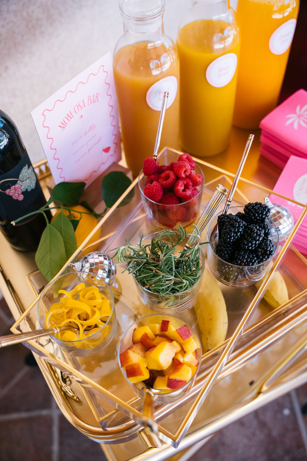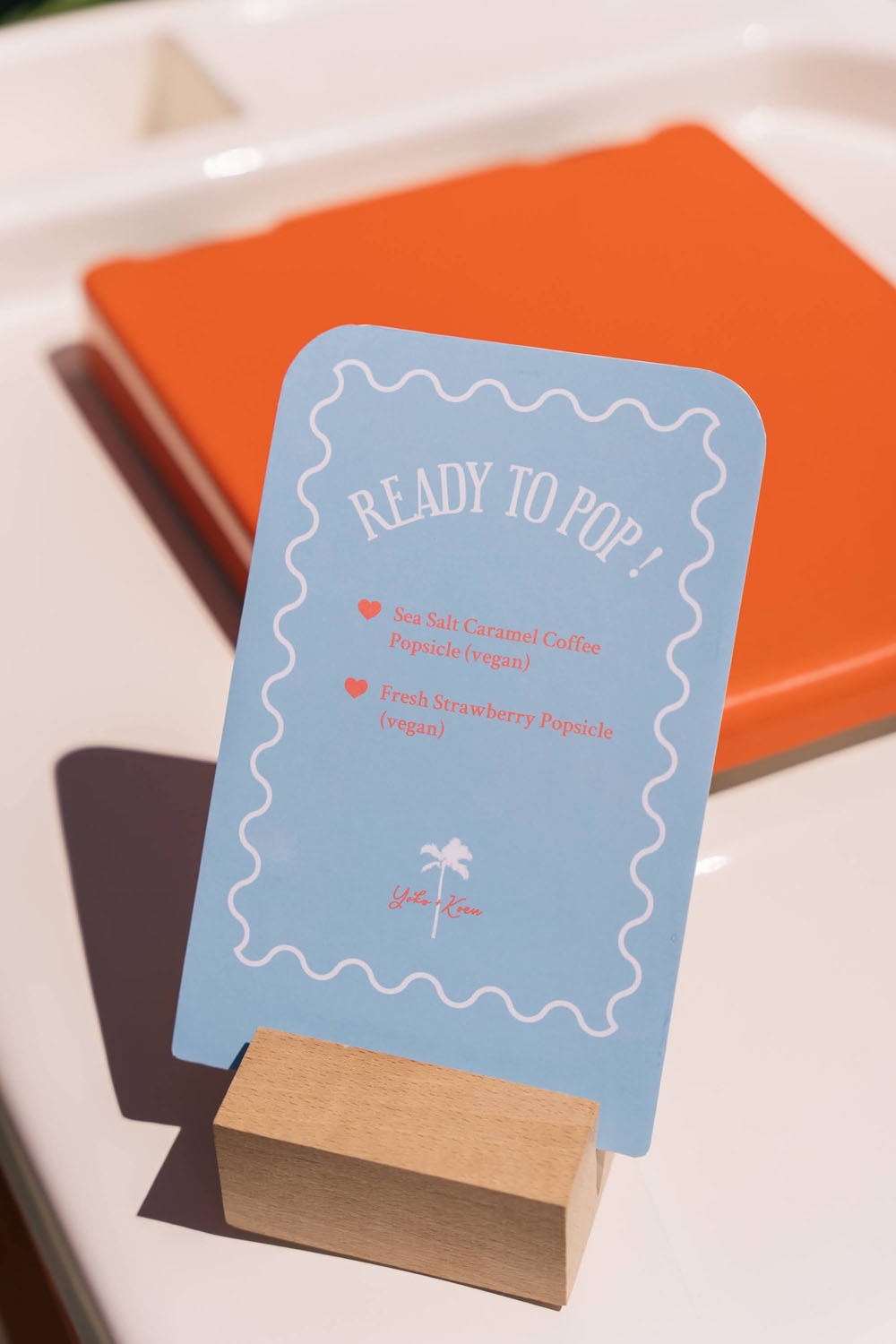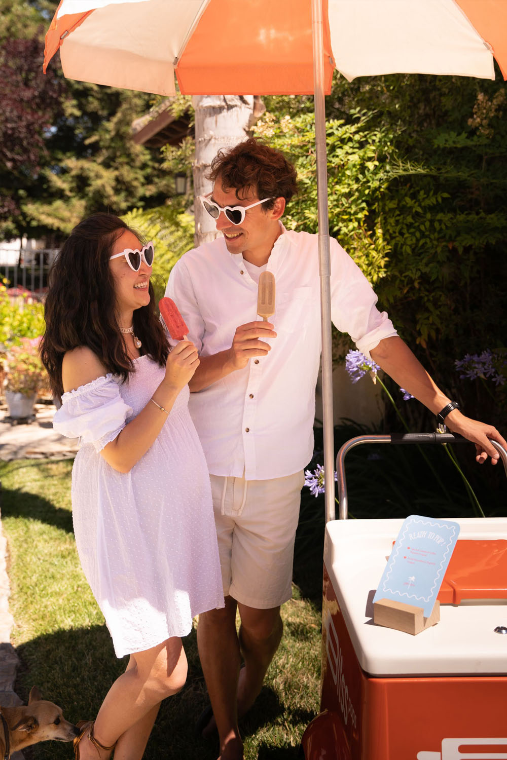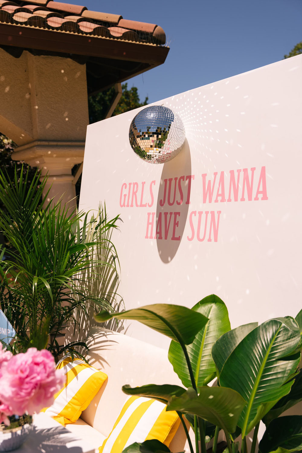 Guests were welcomed with a “mom-osa” bar cart with both alcoholic and non-alcoholic beverage options. TÖST was a big hit as a non-alcoholic champagne option that still felt like an adult drink. The dessert table was filled with cute mini desserts including a cake pop designed to be a pink beach ball, made by La Vie Douce Designs. I of course also had to have my favorite Japanese snack called Pocky – strawberry cream covered biscuit sticks. The dessert labels were all custom designed to fit with the theme. We also brought in a Bliss Pops popsicle cart for guests to stay cool, decorated with a menu that said ‘Ready to Pop!’.