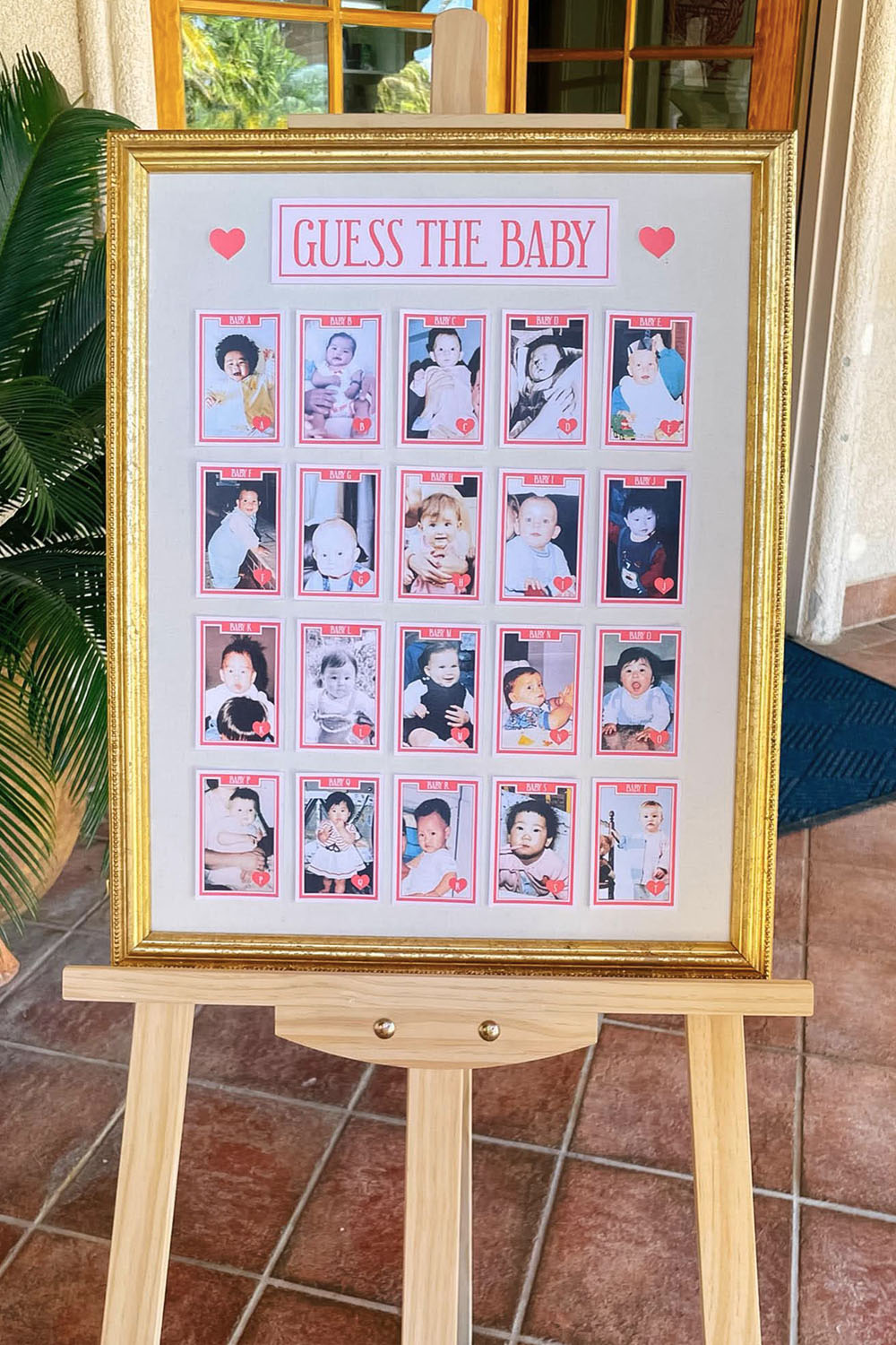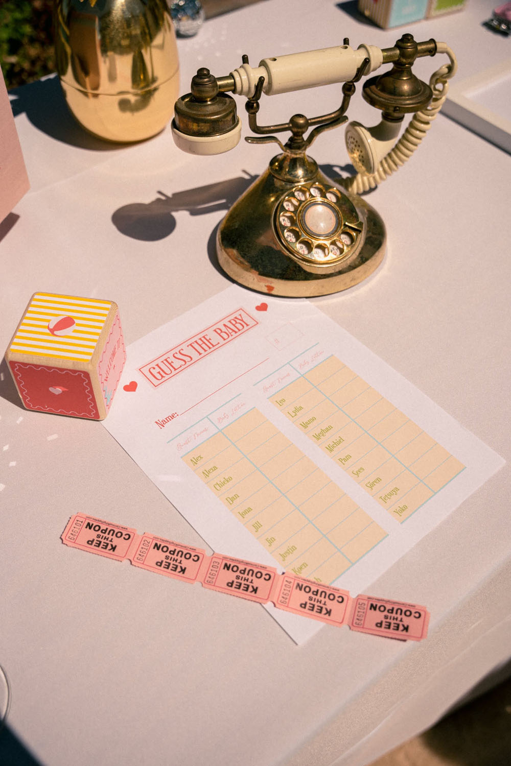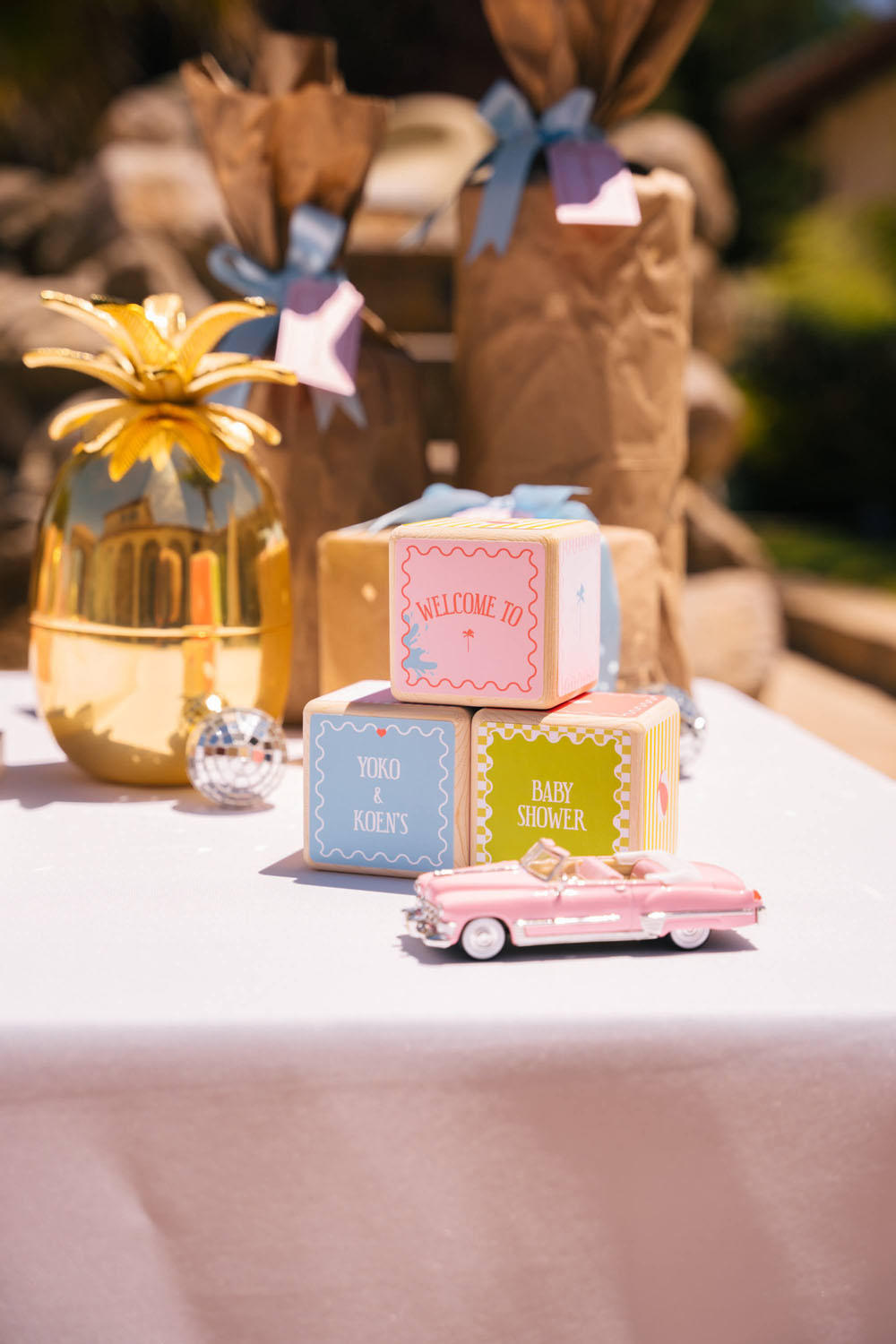 The welcome table was decorated with favors, guestbook, box for baby books, and prizes for games. The favors were heart shaped sunglasses and Sugarfina’s famous Champagne gummy bears. The guestbook was a frame with a mat that the guests signed, and a group photo taken from the baby shower would be later displayed in the frame. As for the baby books, I loved the idea of having books from the guests (which they signed) in place of a card. I also had retro car toys around as decoration because I loved Gray Malin’s photos of dogs in those types of cars.