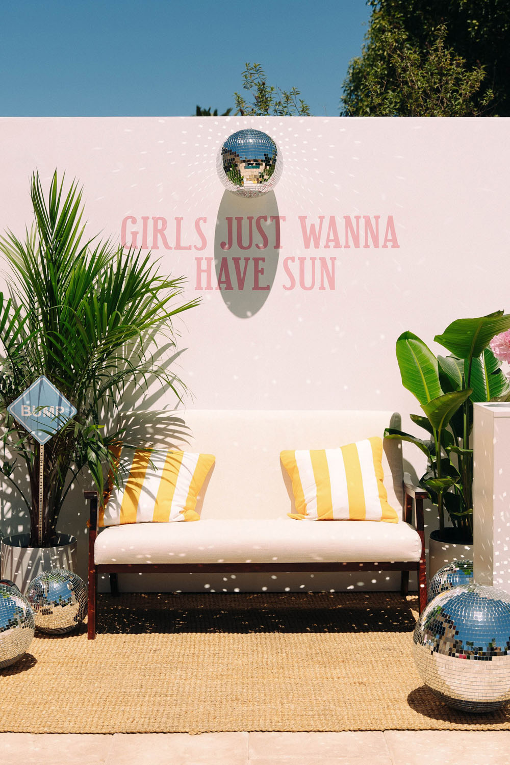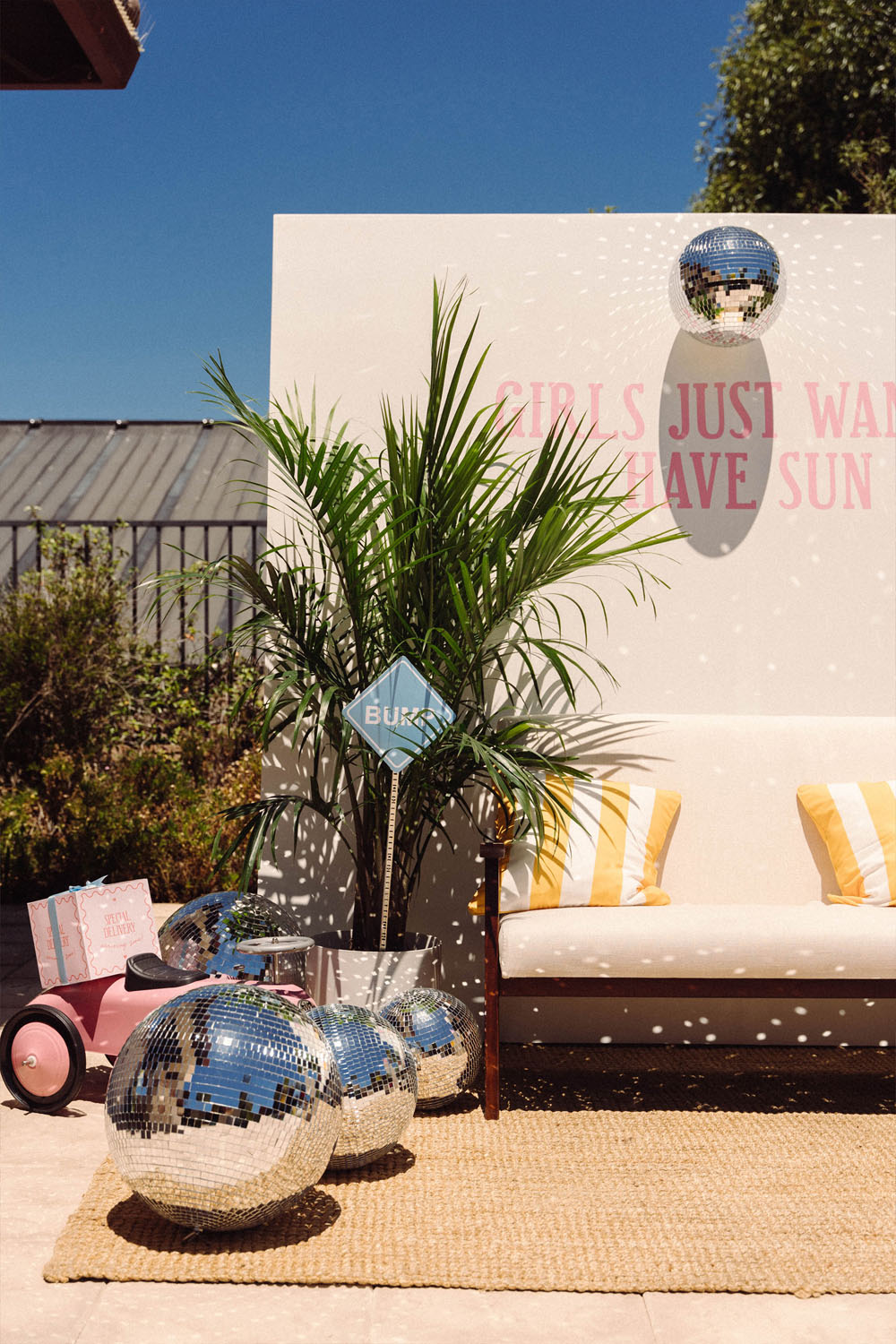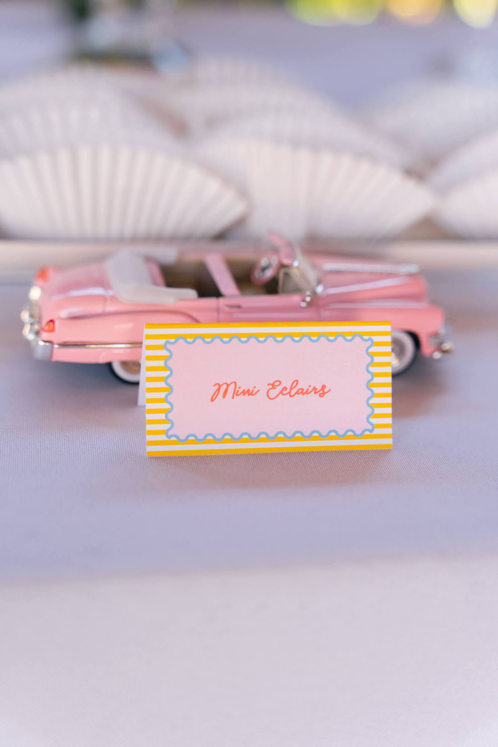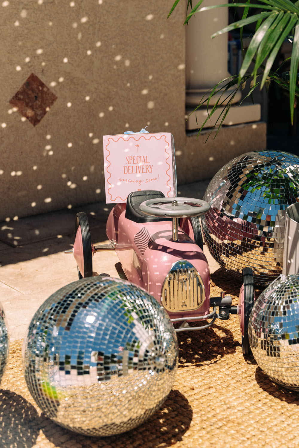 They designed a custom photo backdrop to both allude to mama expecting a baby girl and follow the summer baby shower theme. They decorated it with large live plants rented from Leafy, a custom “Bump” street sign, large pink car, and jumbo disco balls. The pink car carried a cute box labeled ‘Special delivery arriving soon’. The design was inspired by Wes Anderson’s Mendl’s patisserie packaging from the movie, The Grand Budapest Hotel. Disco balls were also sprinkled through out the venue which refracted fun little specks of light everywhere.