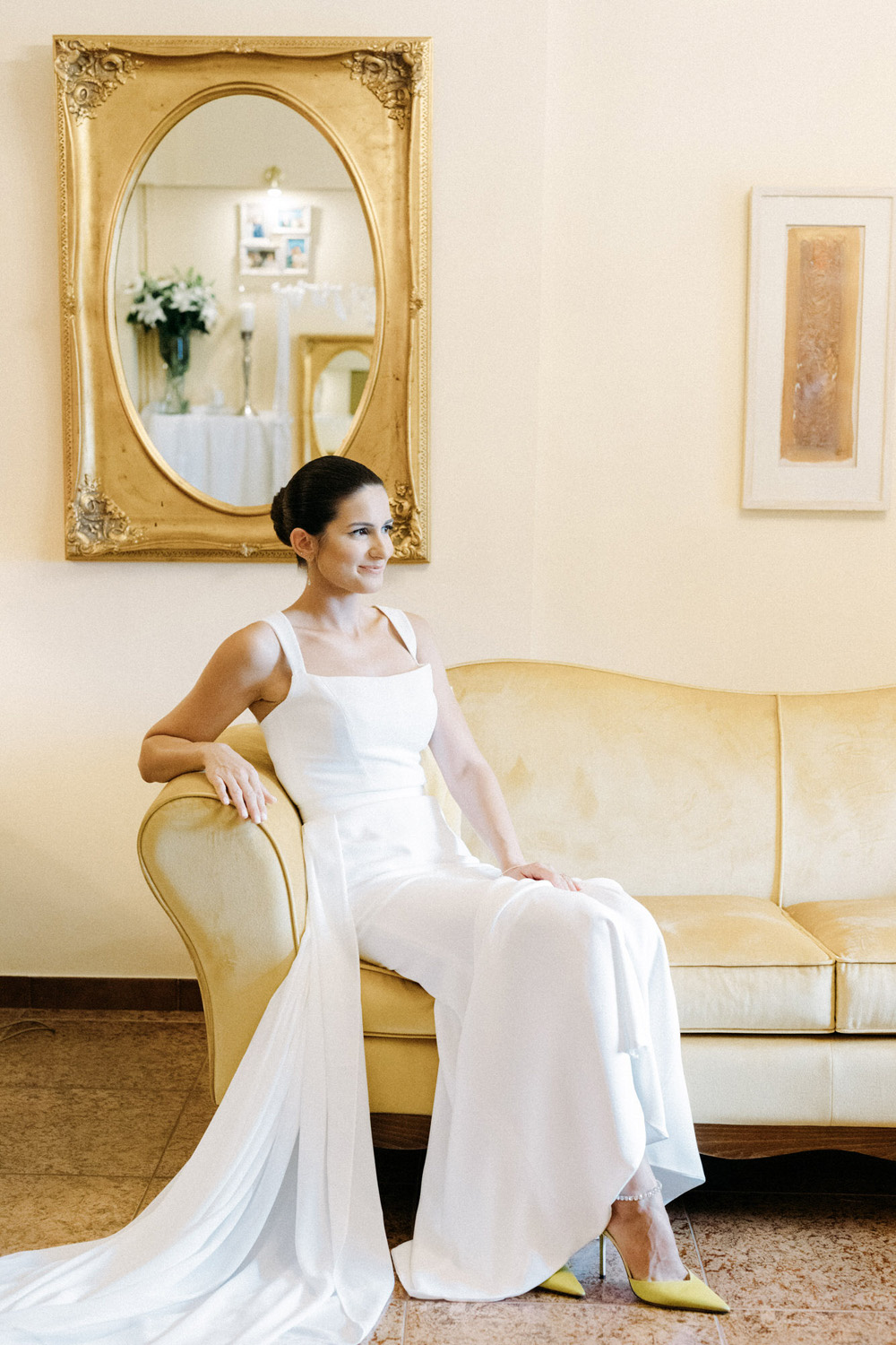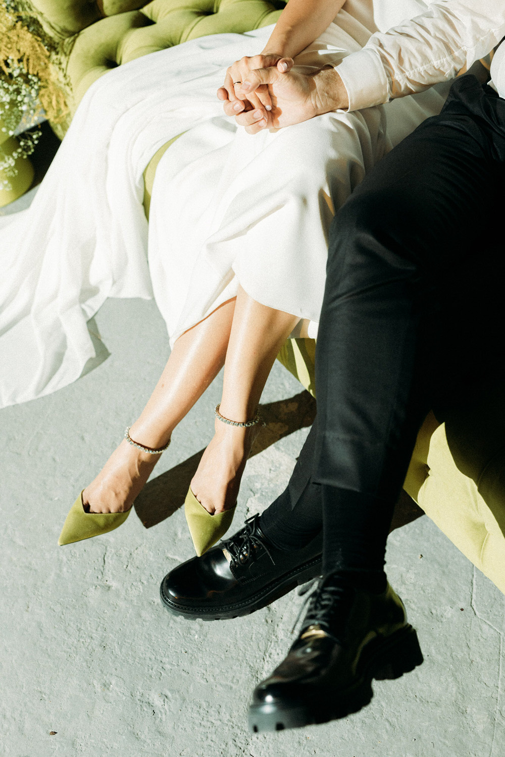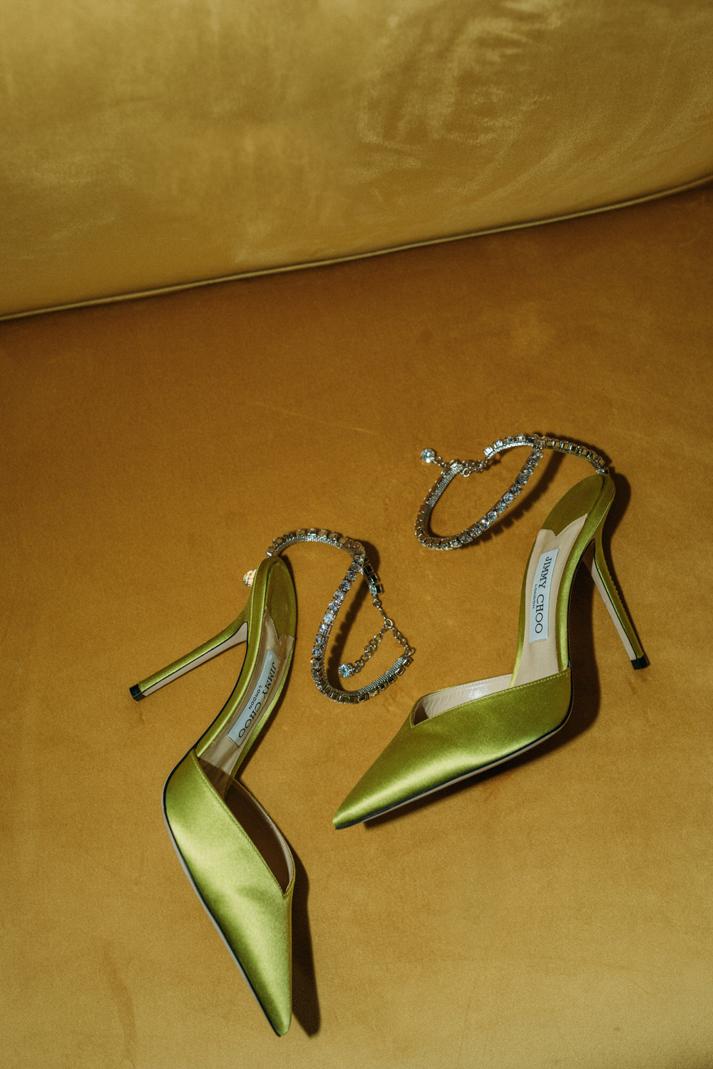 The lime pair of high heeled mules by Jimmy Choo for the bride is the perfect finishing touch to this modern and chic wedding look. The ‘limes’ project reminds us that sometimes, less is truly more, and that minimalism can bring out the true beauty and elegance in any concept.