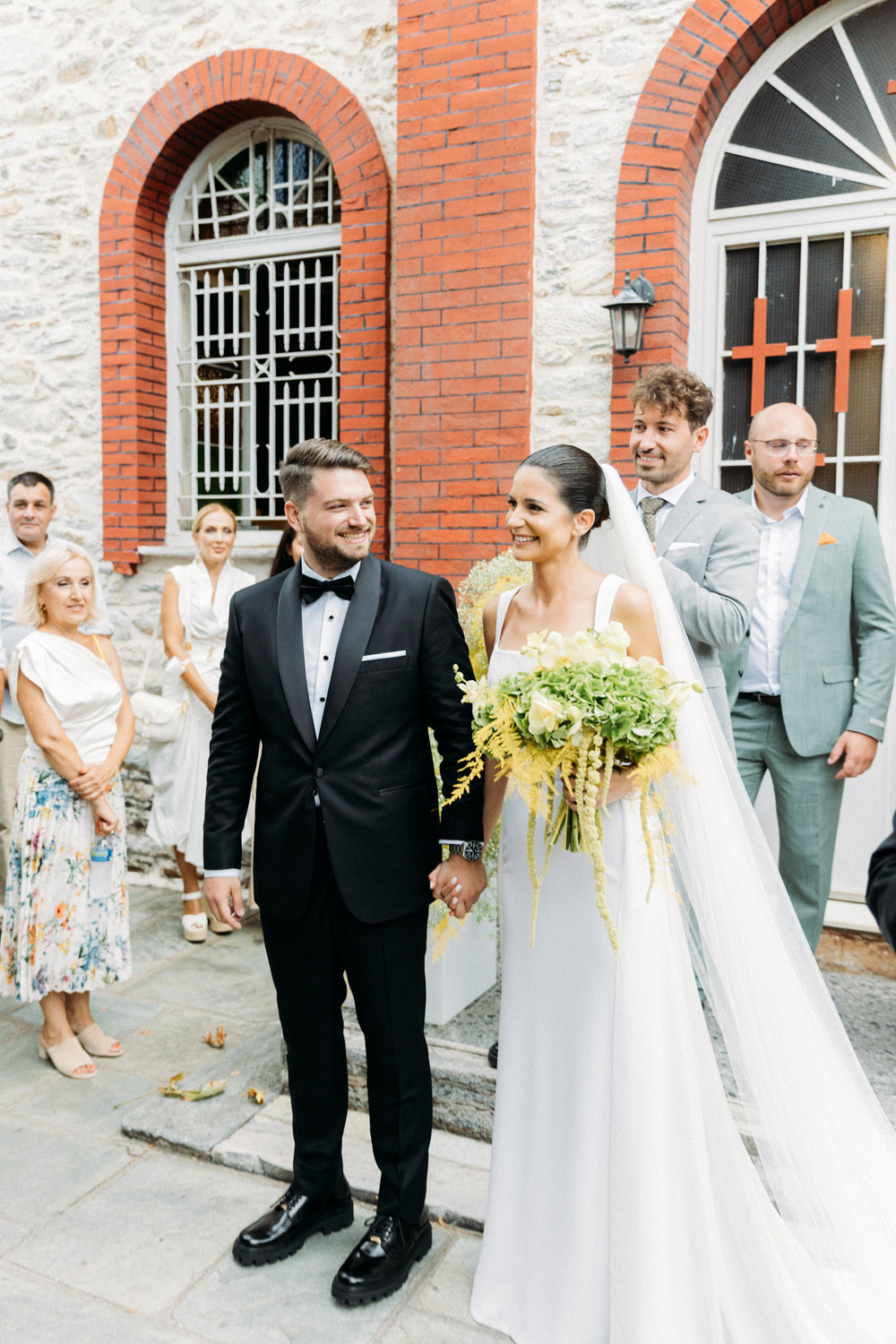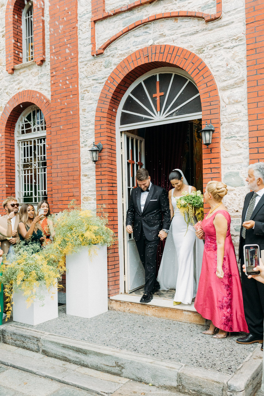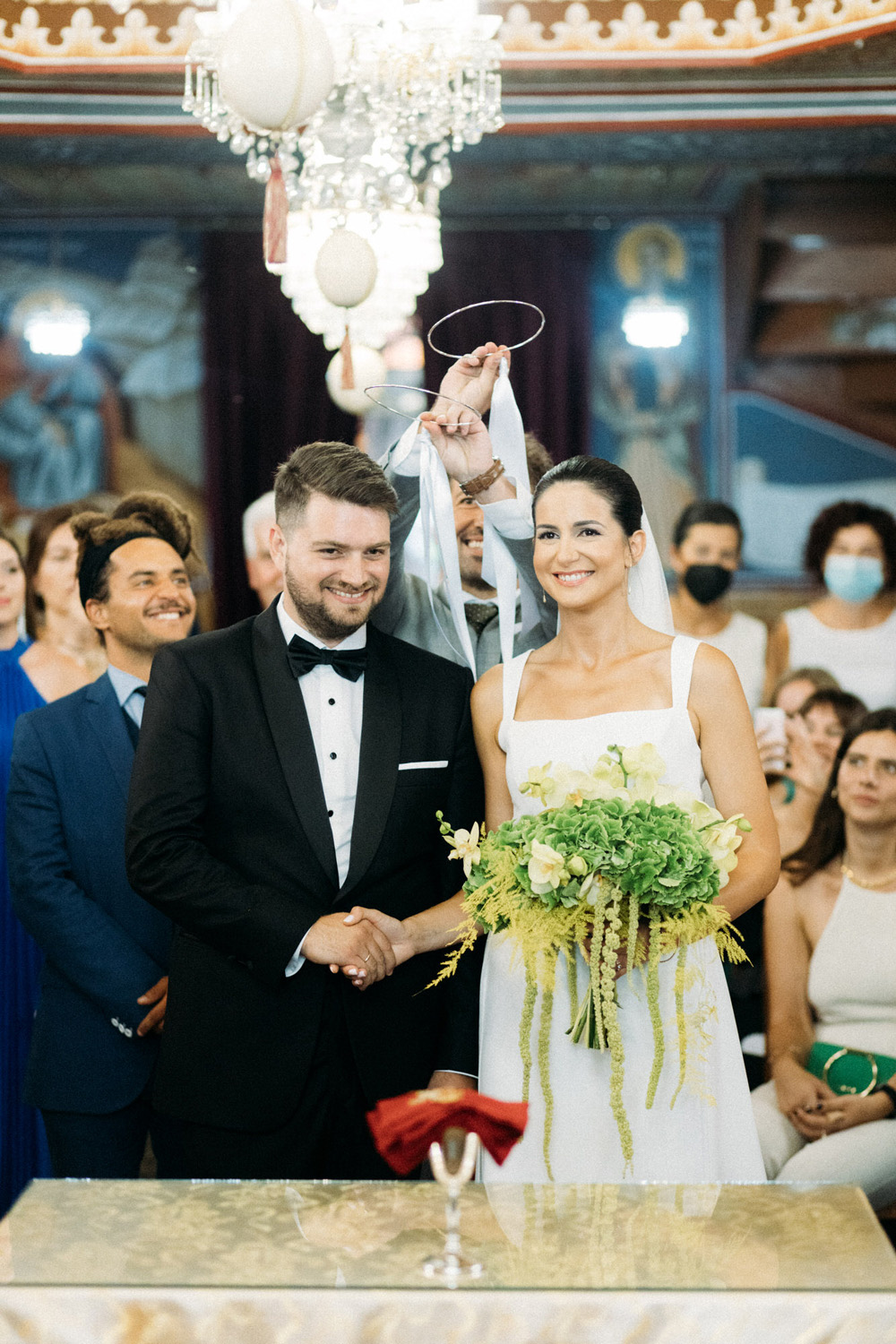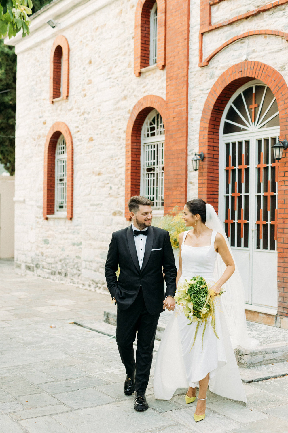 The monochromatic color scheme of the bridal bouquet and the lime clouds of babies breath are a beautiful representation of the simplicity and elegance that minimalism can offer. The contemporary design of the wedding, paired with the stylish attire by Papadogamvros for the groom and the elegant bridal dress by Laskos, truly showcase the couple’s unique personality and style.