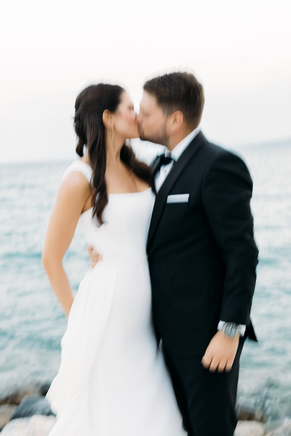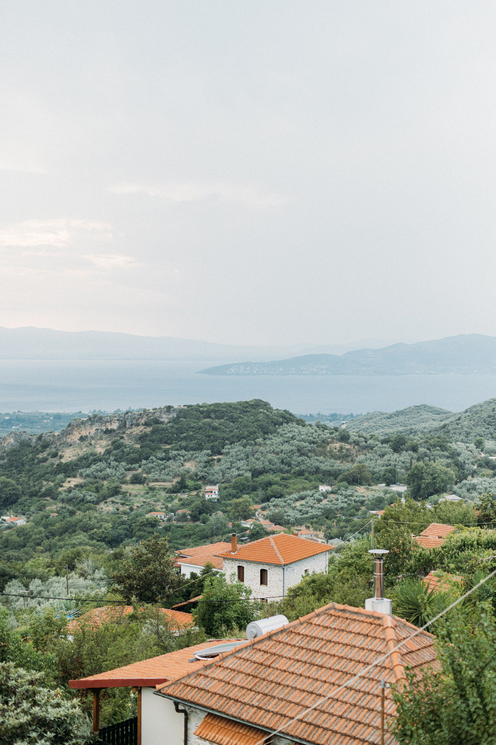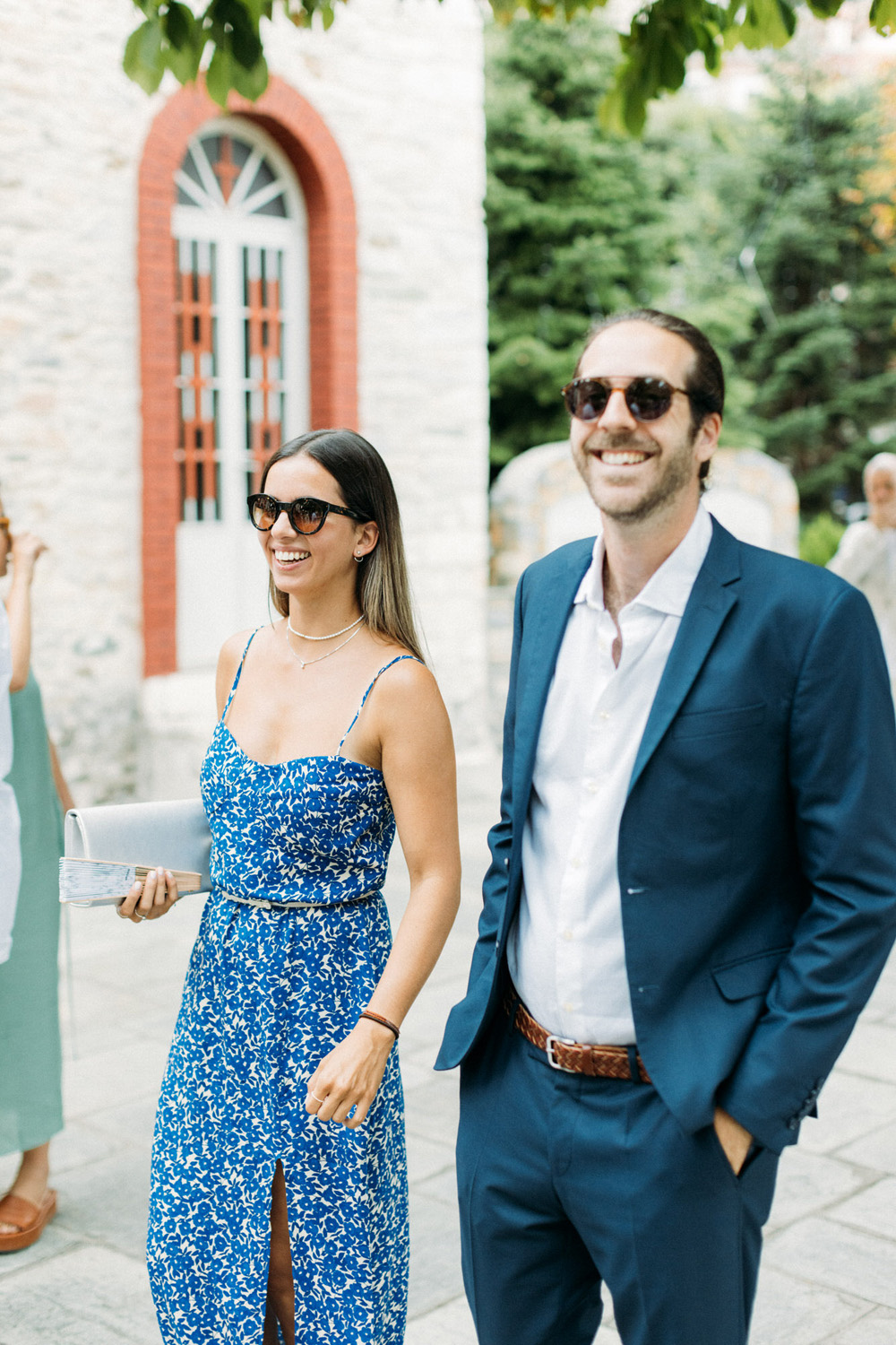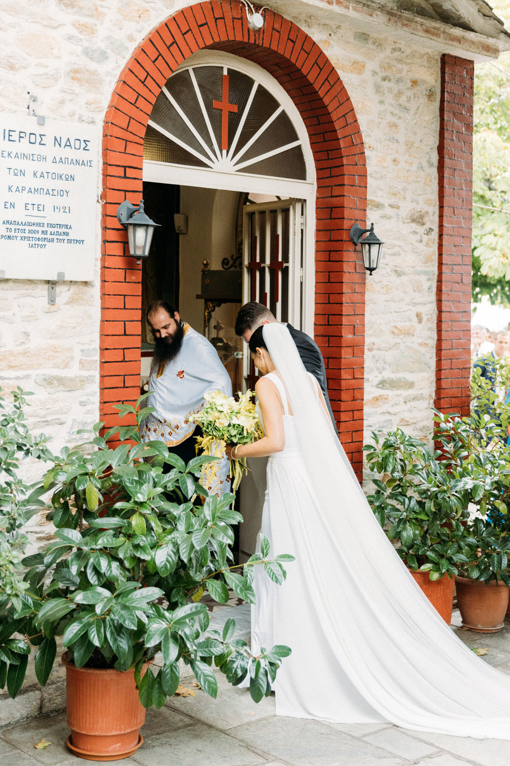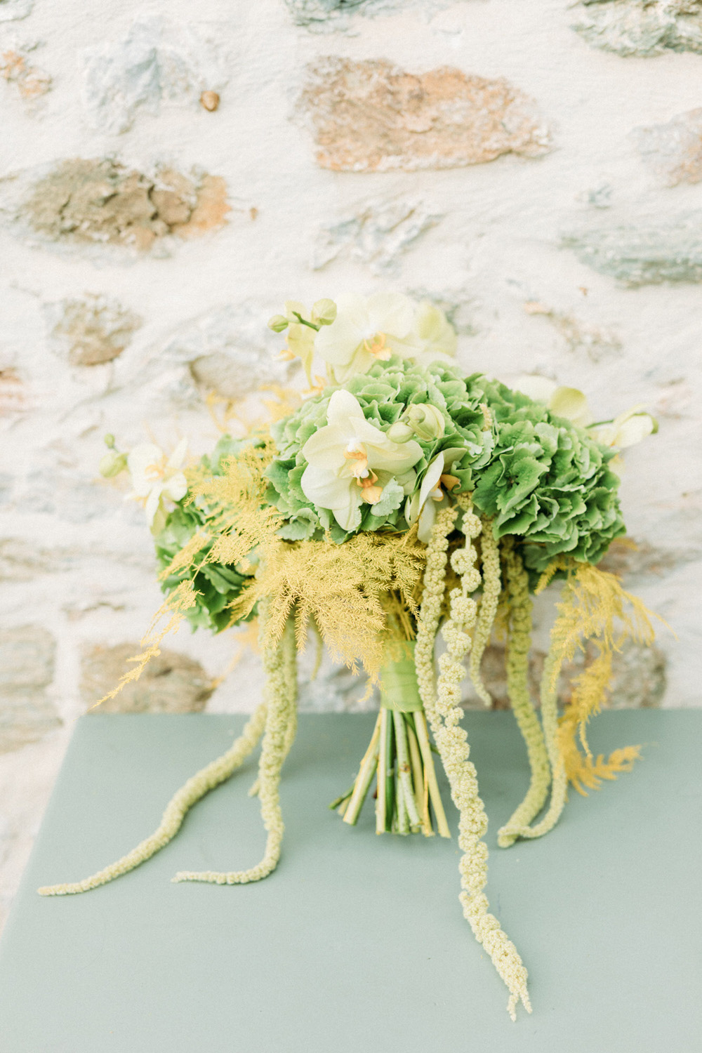 The monochromatic color scheme of the bridal bouquet and the lime clouds of babies breath are a beautiful representation of the simplicity and elegance that minimalism can offer. The contemporary design of the wedding, paired with the stylish attire by Papadogamvros for the groom and the elegant bridal dress by Laskos, truly showcase the couple’s unique personality and style.