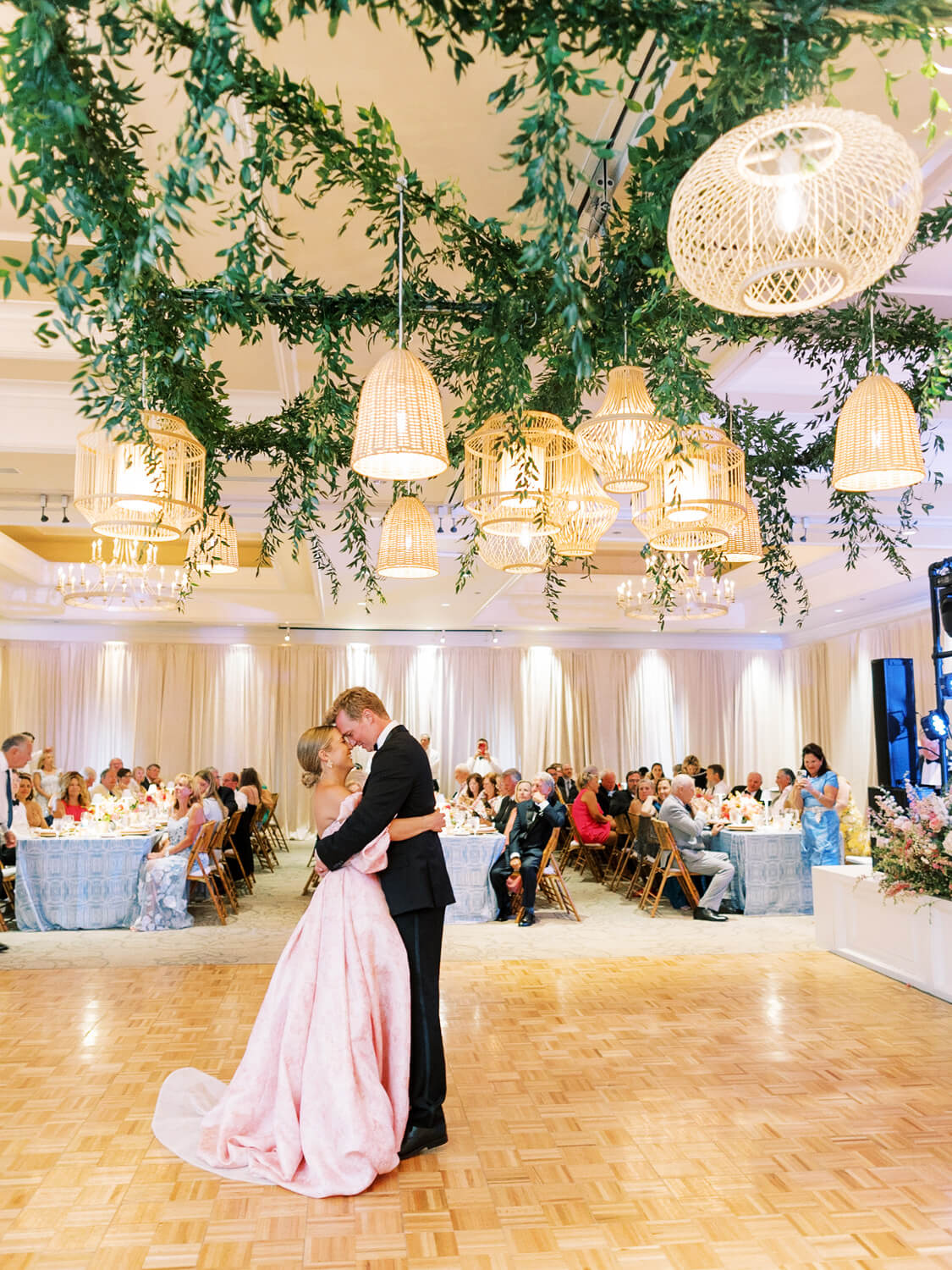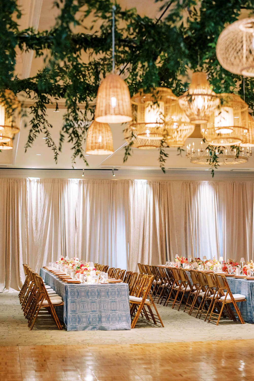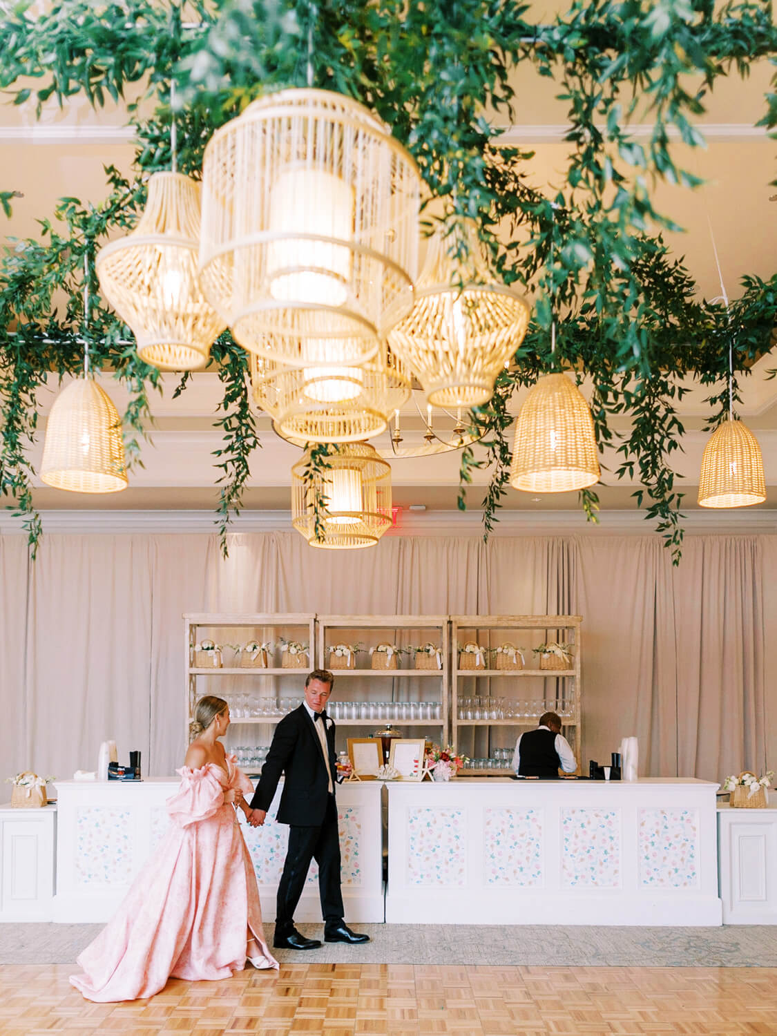 While the ceremony took place at 18th Lawn at Harbour Town Golf Links, they used Sea Pine’s Champions Ballroom for a classically elegant indoor reception. The team transformed the space into a modern, romantic coastal celebration with woven accents, rattan lightings and greenery hanging overhead, a luxe bar (love those little floral baskets on display!) and formal tablescape. Pink floral centerpieces tied in the bride’s dress, while blue watercolor inspired table linens spoke to their beachy invitation suite.