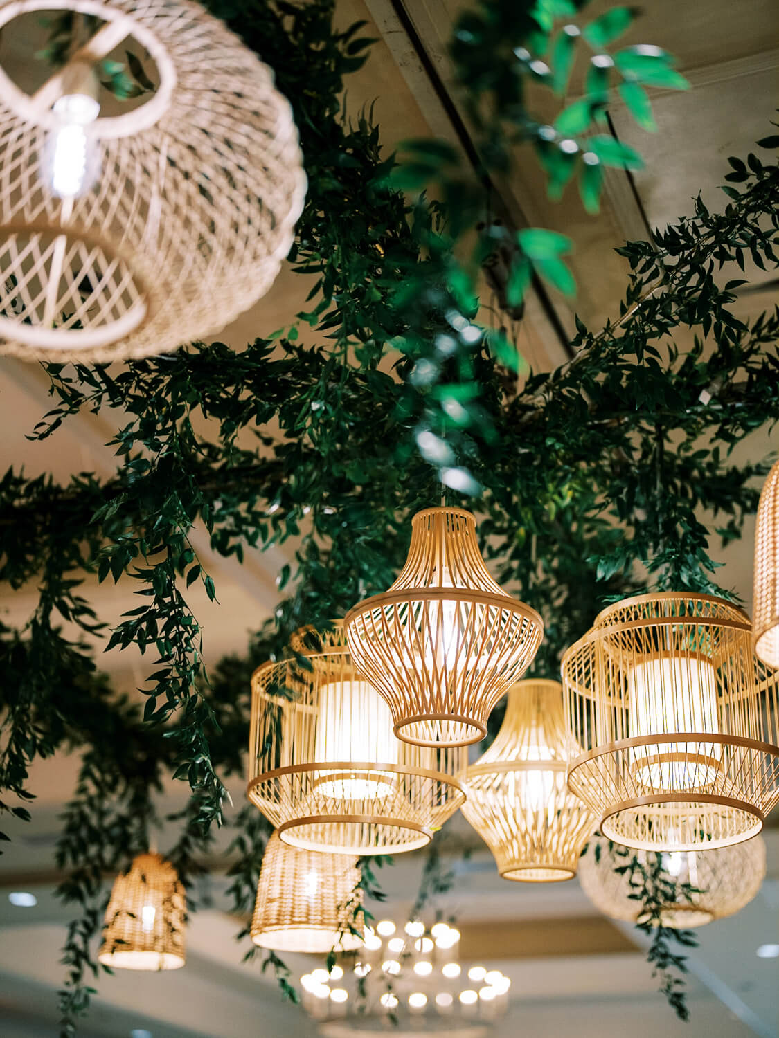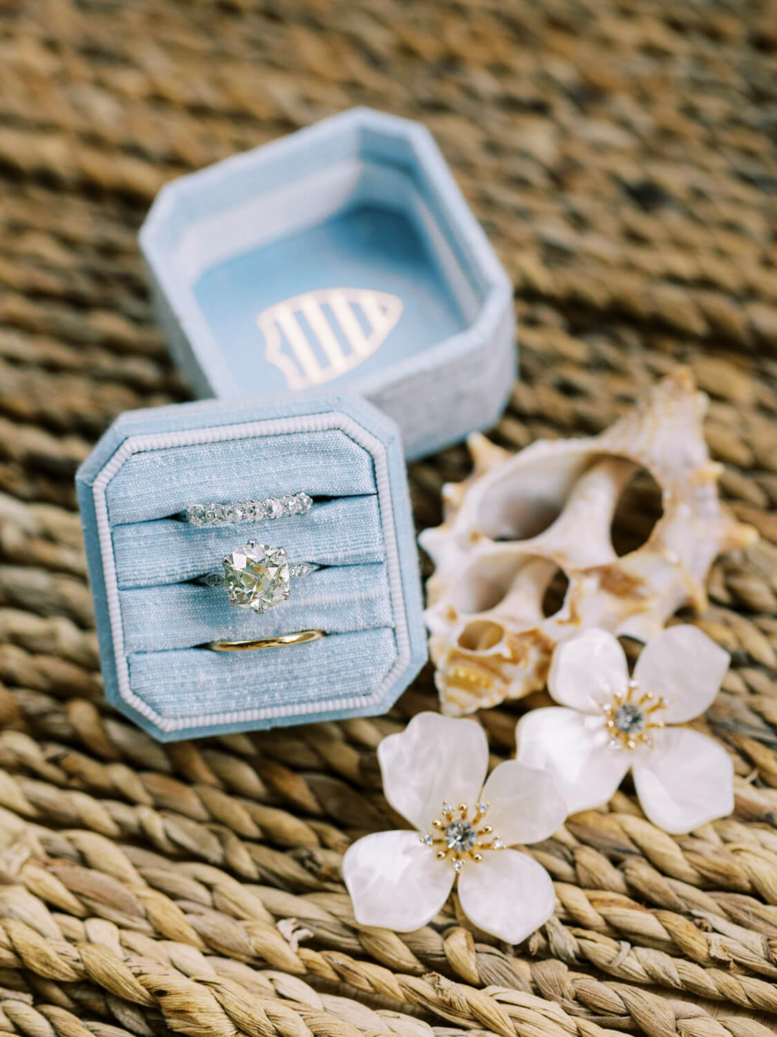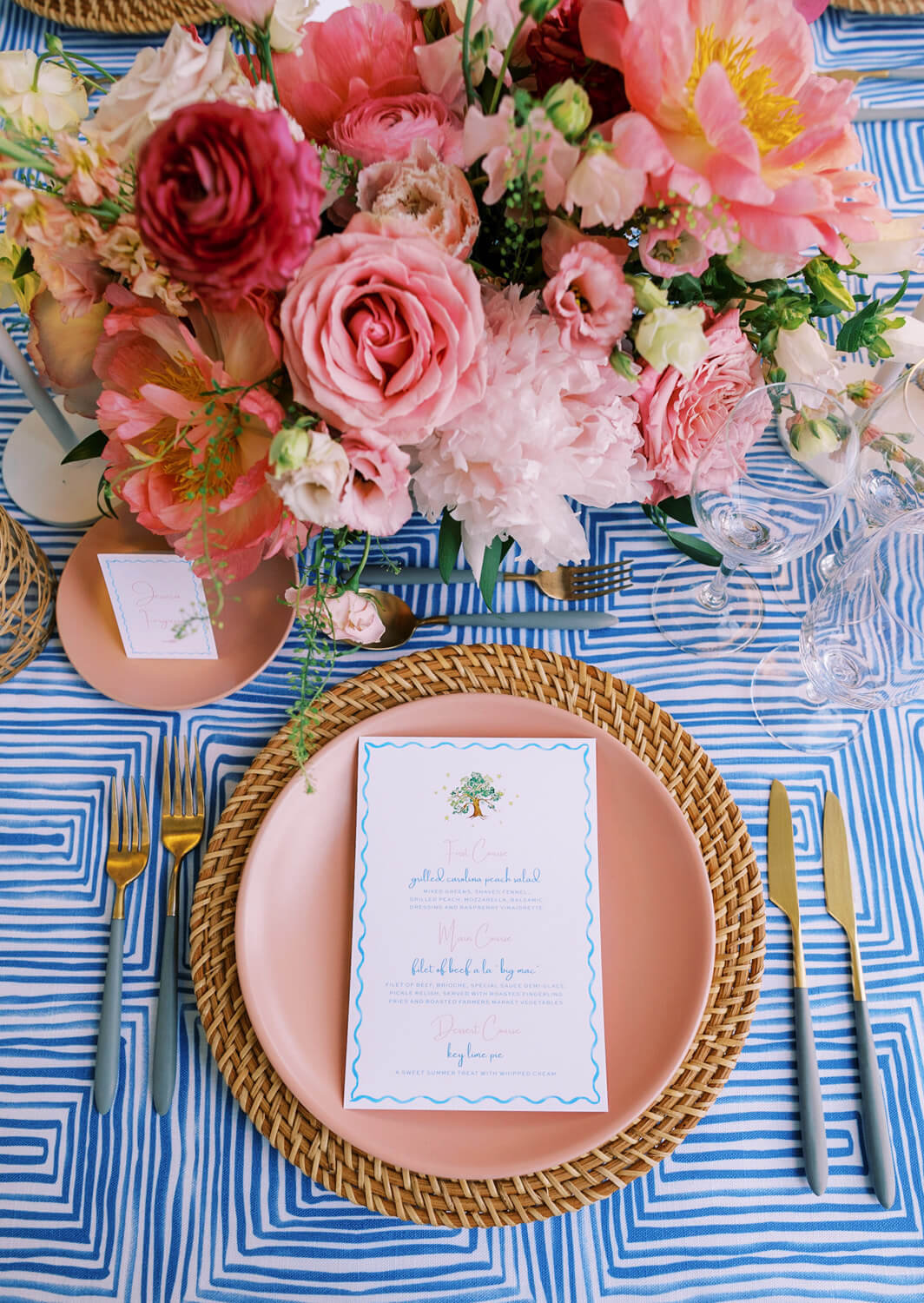 While the ceremony took place at 18th Lawn at Harbour Town Golf Links, they used Sea Pine’s Champions Ballroom for a classically elegant indoor reception. The team transformed the space into a modern, romantic coastal celebration with woven accents, rattan lightings and greenery hanging overhead, a luxe bar (love those little floral baskets on display!) and formal tablescape. Pink floral centerpieces tied in the bride’s dress, while blue watercolor inspired table linens spoke to their beachy invitation suite.