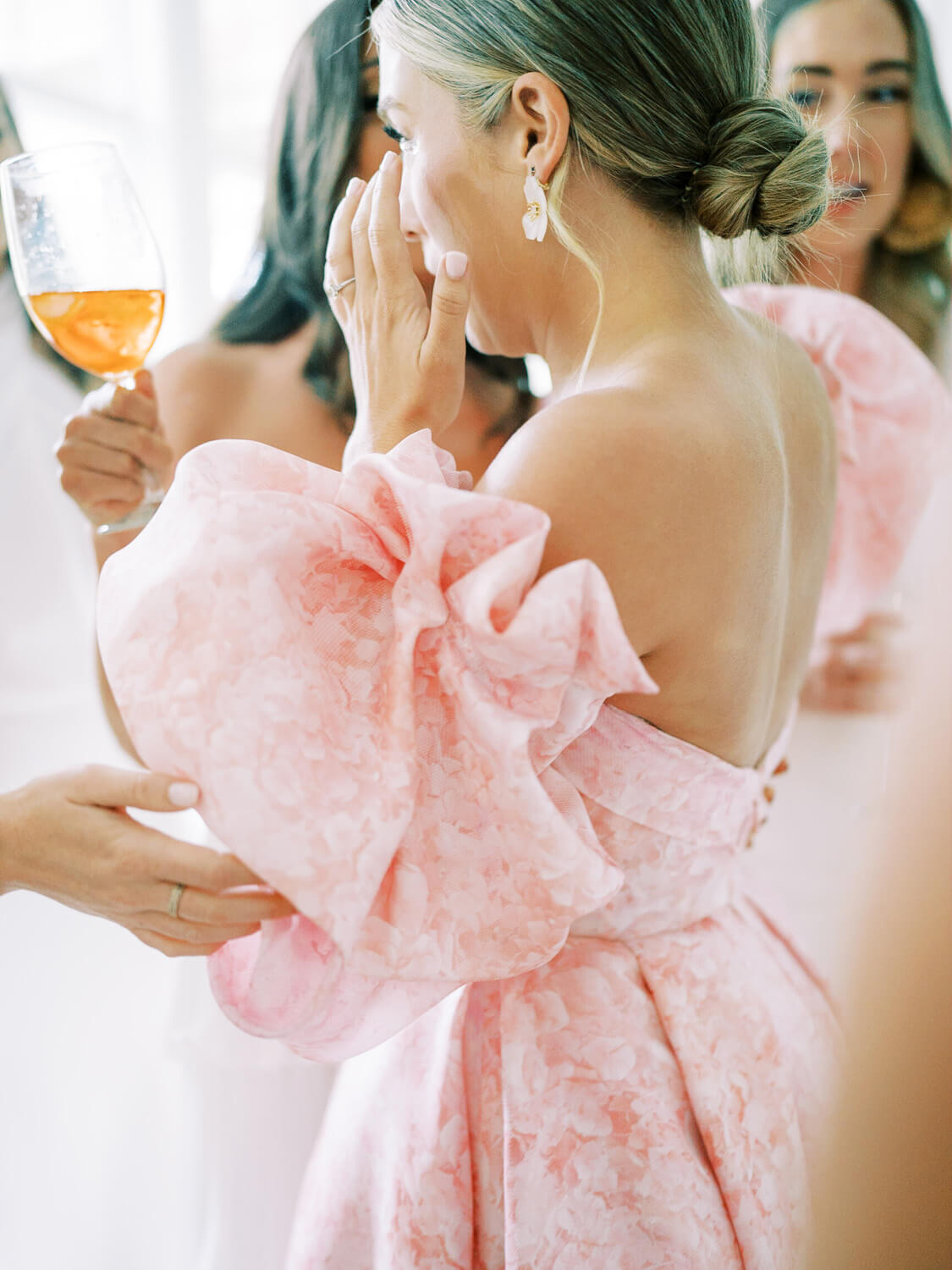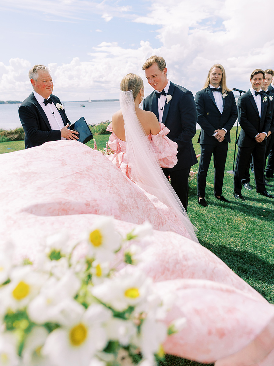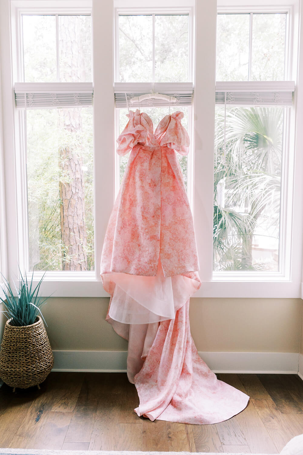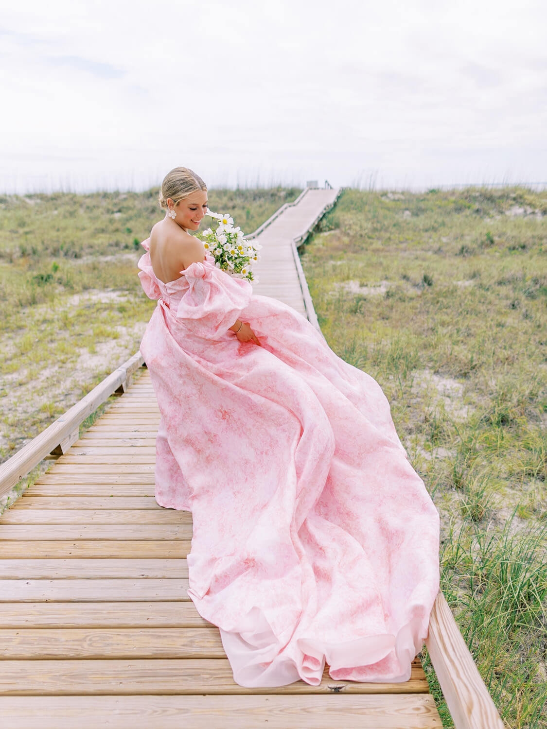 Anyone recognize this pink Monique Lhuillier wedding dress from the botanical inspired Fall ’22 line? ‘Petal’ can actually be a full length or mini dress with its detachable skirt and trailing cape. Truly a vision!! The dreamy petal print was one of many watercolor elements used throughout the day as a not back to the invites and coastal locale.
