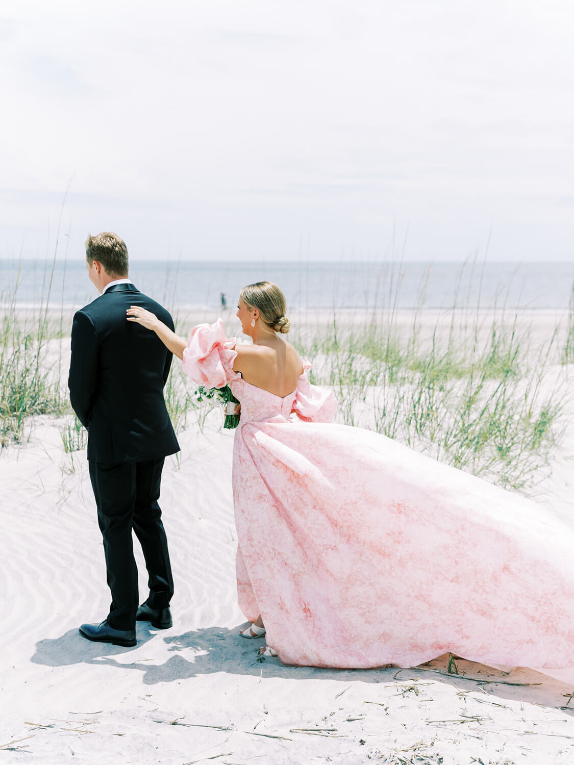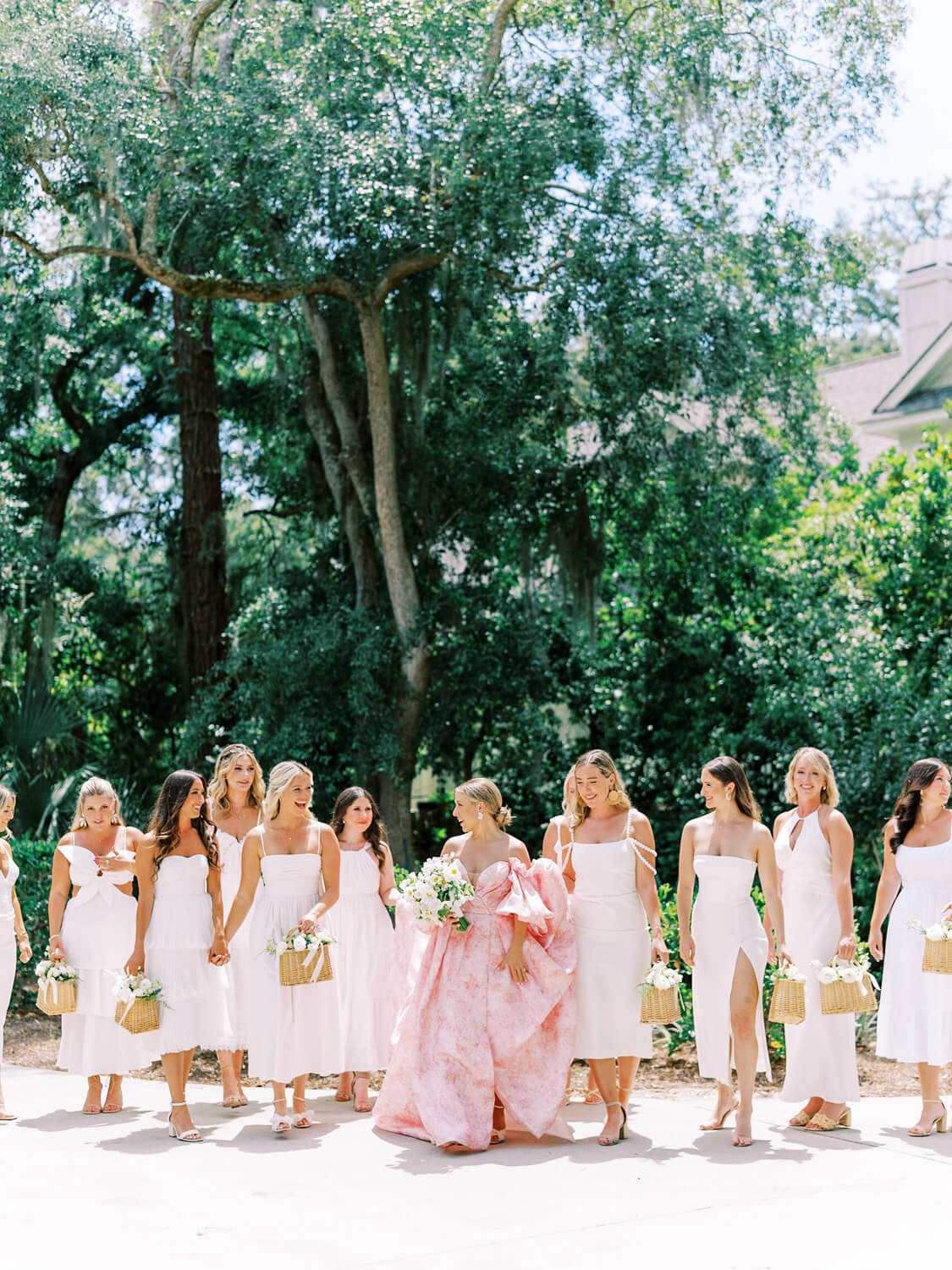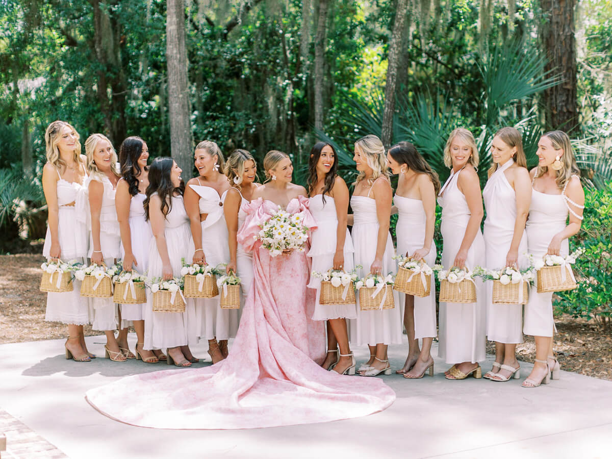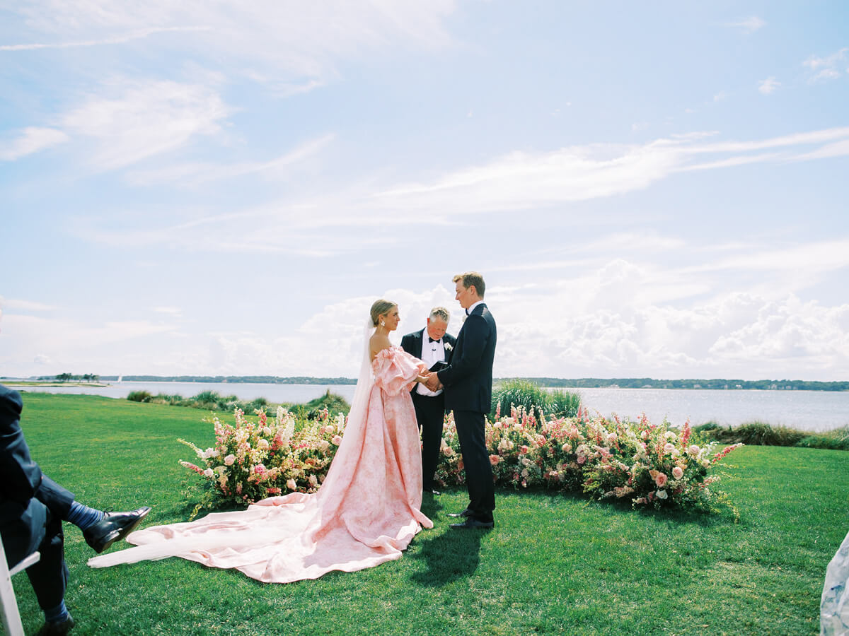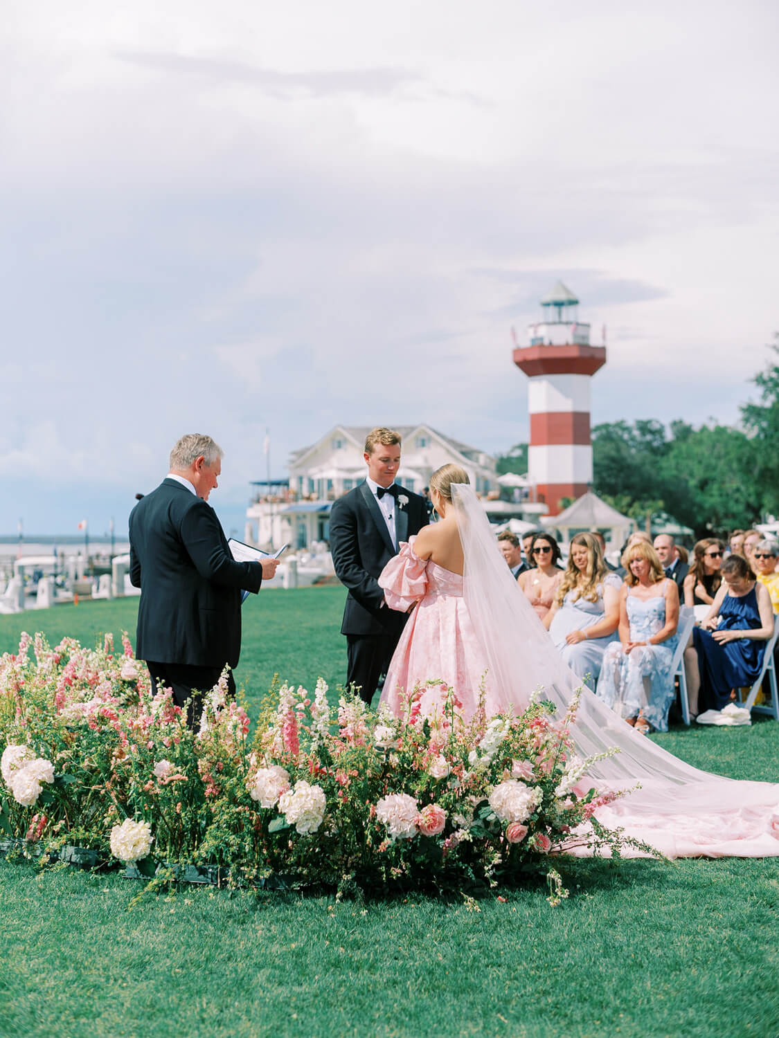 We love it when a couple flips the script, and that’s exactly what our bride Marisa did by outfitting her bridesmaids in white and donning (an absolutely gorgeous, show-stopping) pink wedding dress herself. Très chic! They worked with Grit & Grace Inc to bring a happy summer vibe to their luxe Hilton Head wedding venue Sea Pines—a beachside resort, golf course, and ballroom—achieving a relaxed elegance rarely done so well. Lots of images and pretty details below, captured by Perry Vaile Photography!