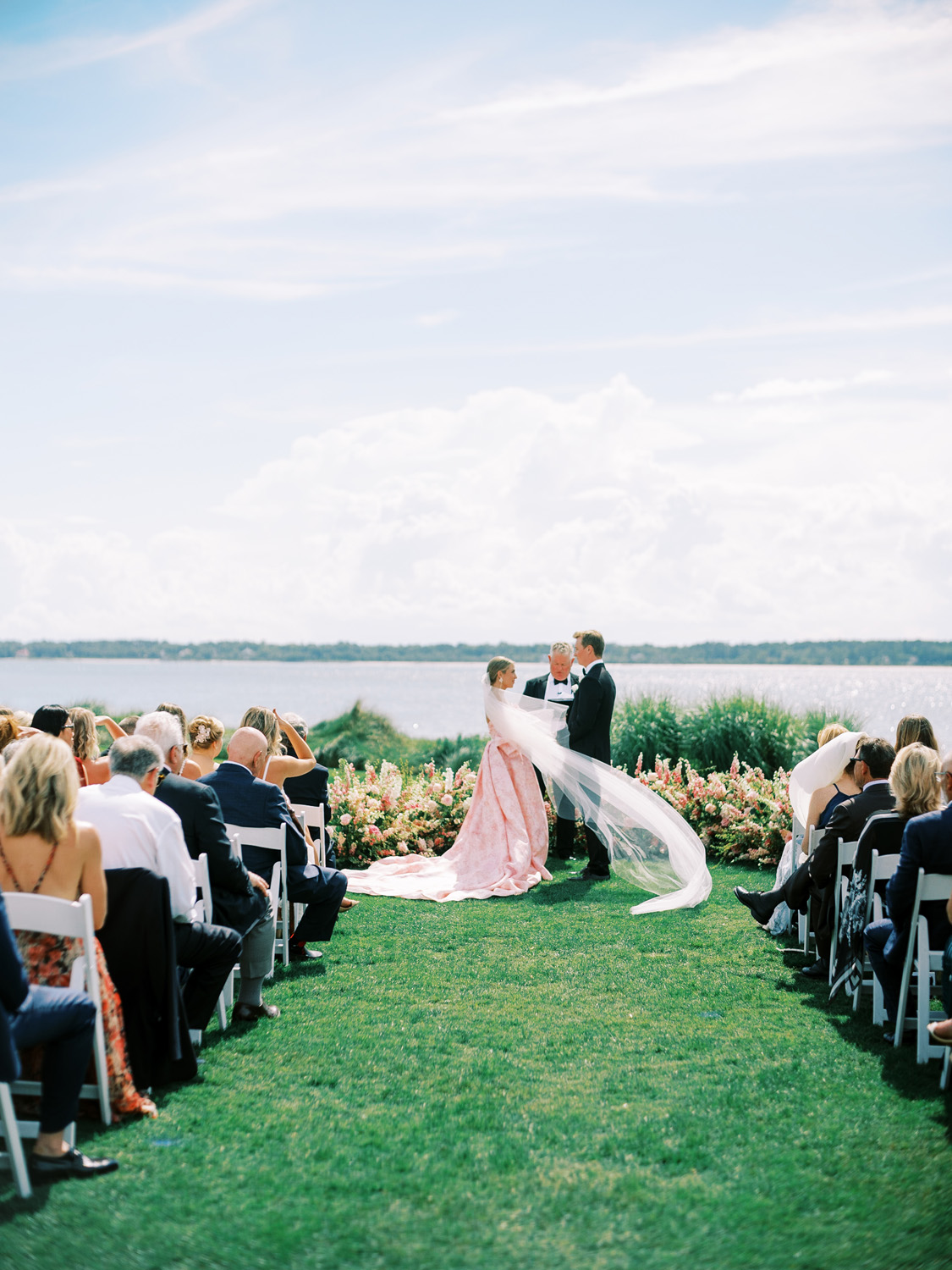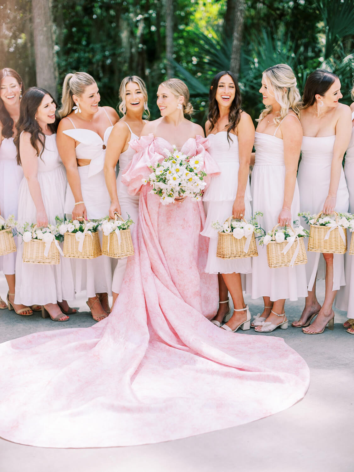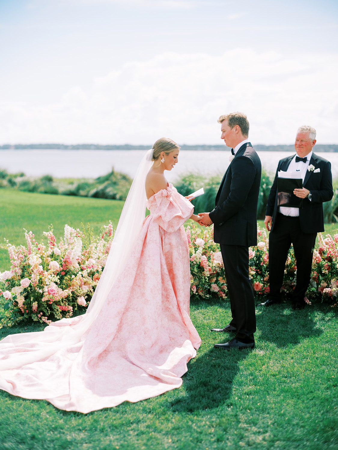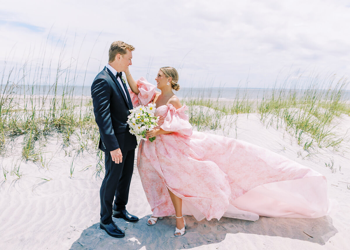 We love it when a couple flips the script, and that’s exactly what our bride Marisa did by outfitting her bridesmaids in white and donning (an absolutely gorgeous, show-stopping) pink wedding dress herself. Très chic! They worked with Grit & Grace Inc to bring a happy summer vibe to their luxe Hilton Head wedding venue Sea Pines—a beachside resort, golf course, and ballroom—achieving a relaxed elegance rarely done so well. Lots of images and pretty details below, captured by Perry Vaile Photography!