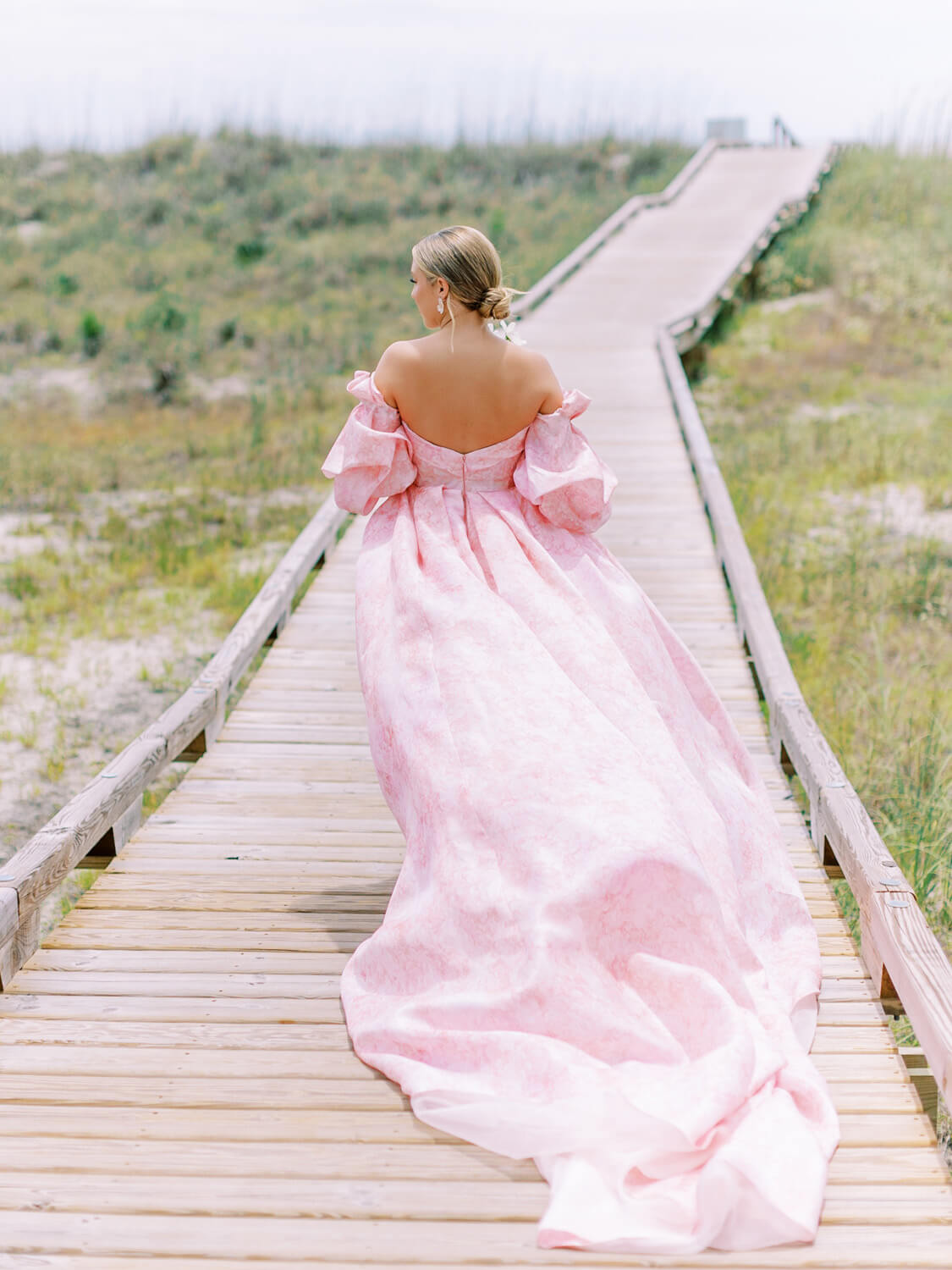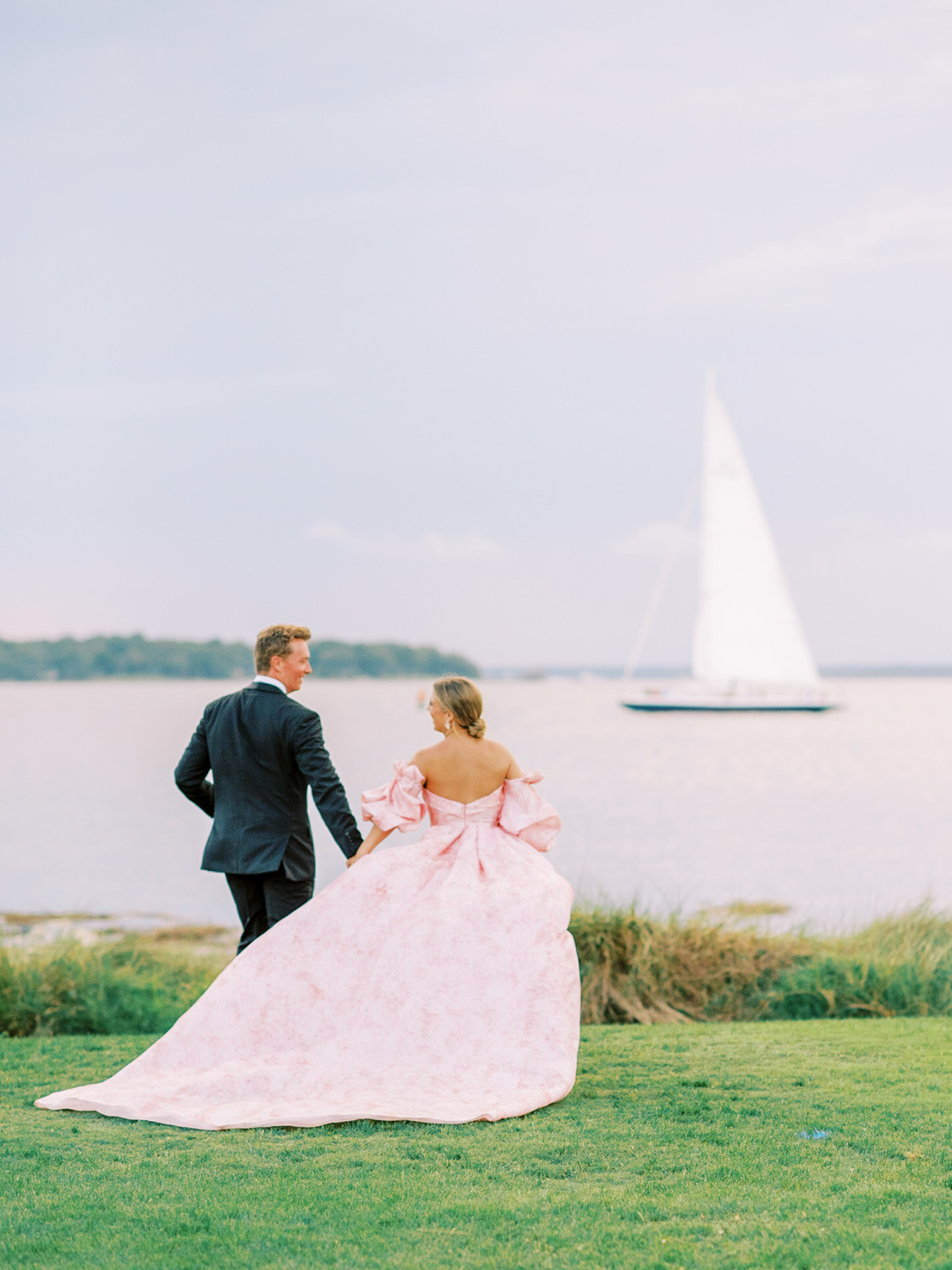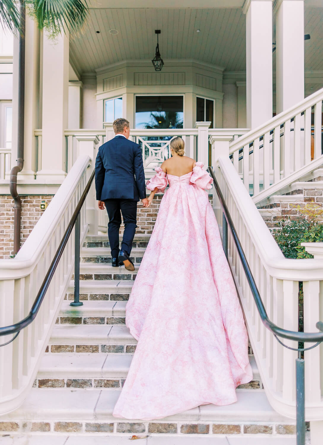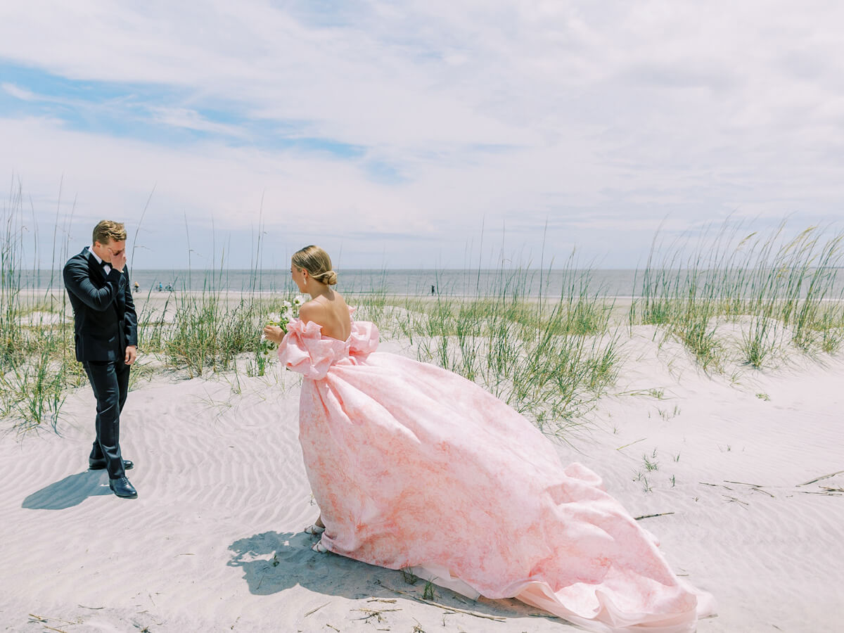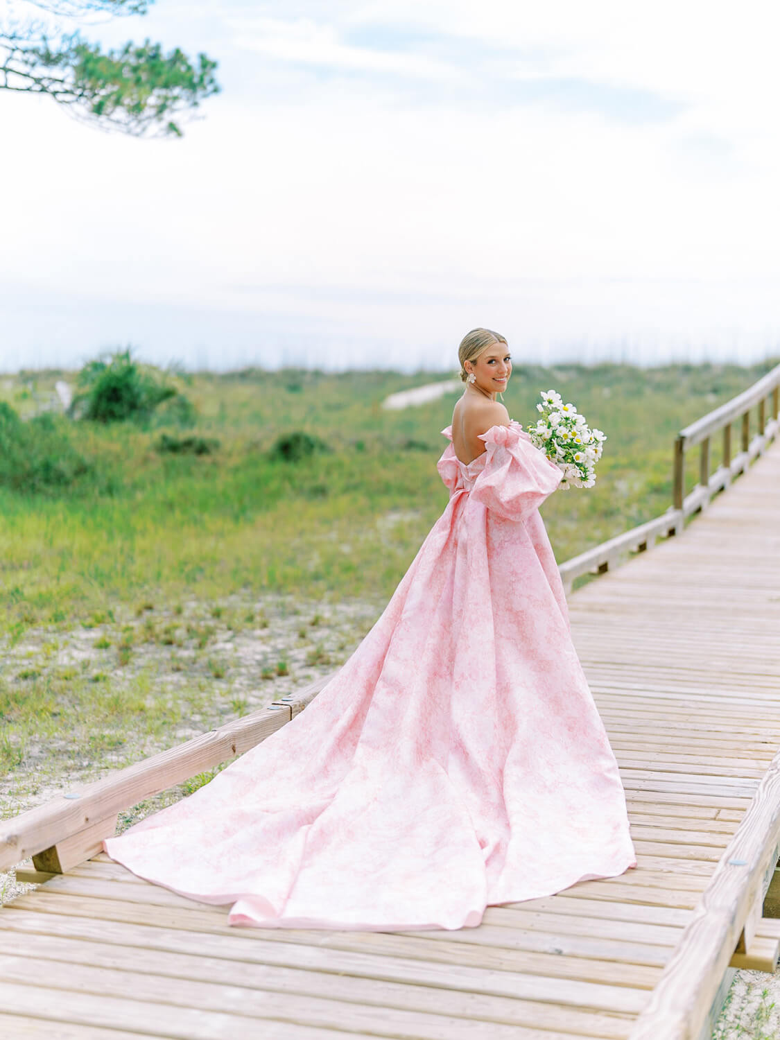 We love it when a couple flips the script, and that’s exactly what our bride Marisa did by outfitting her bridesmaids in white and donning (an absolutely gorgeous, show-stopping) pink wedding dress herself. Très chic! They worked with Grit & Grace Inc to bring a happy summer vibe to their luxe Hilton Head wedding venue Sea Pines—a beachside resort, golf course, and ballroom—achieving a relaxed elegance rarely done so well. Lots of images and pretty details below, captured by Perry Vaile Photography!