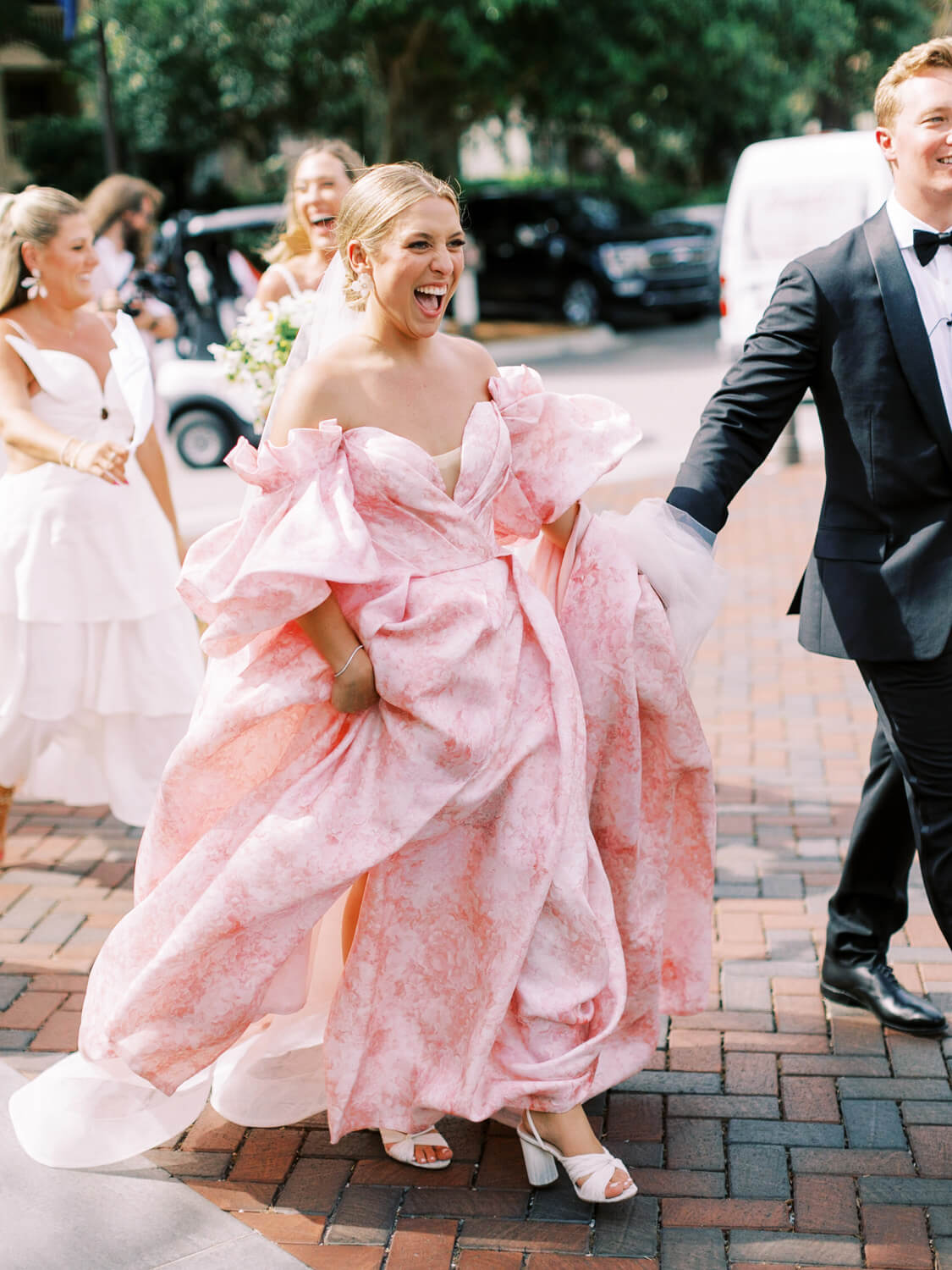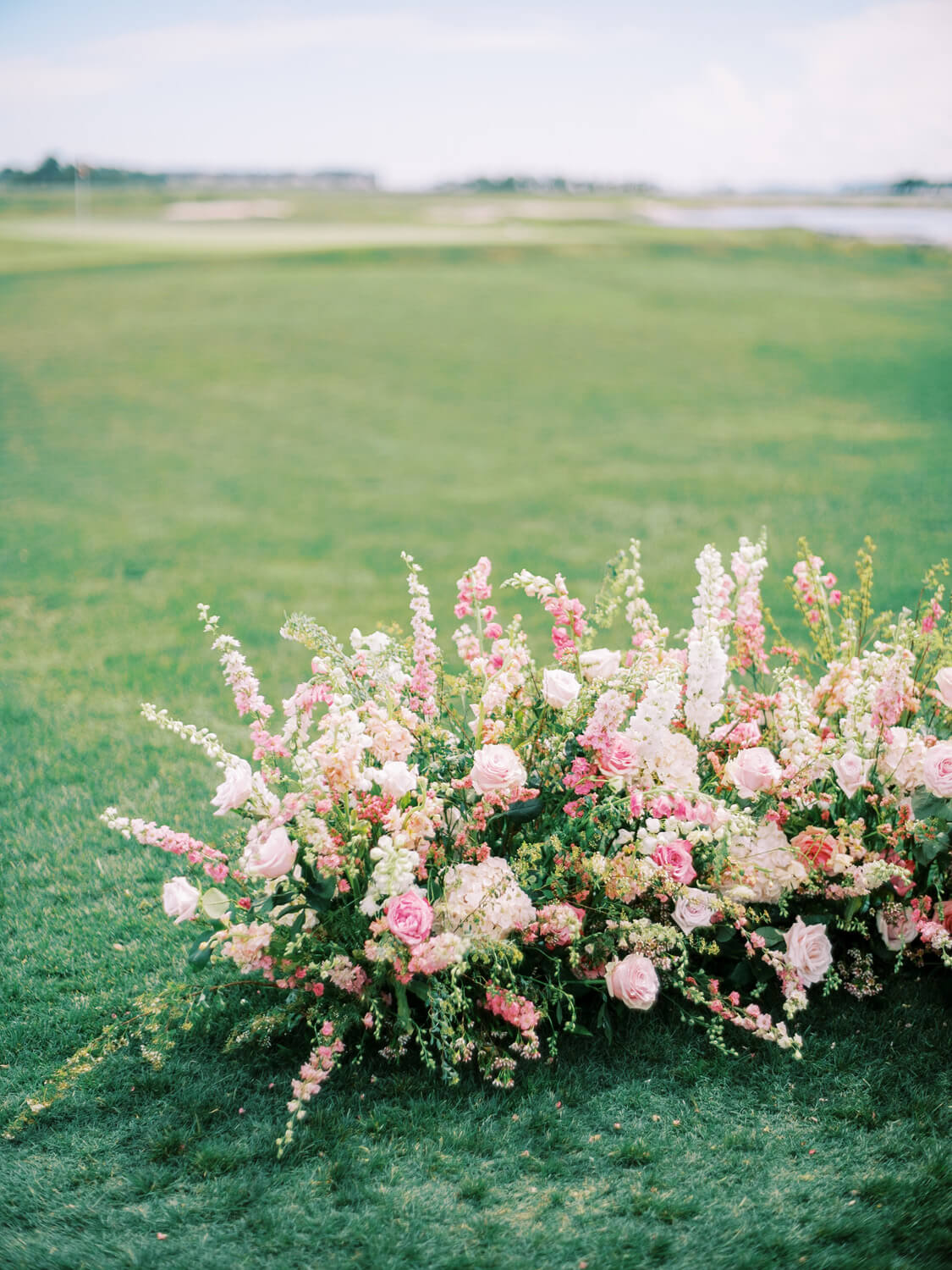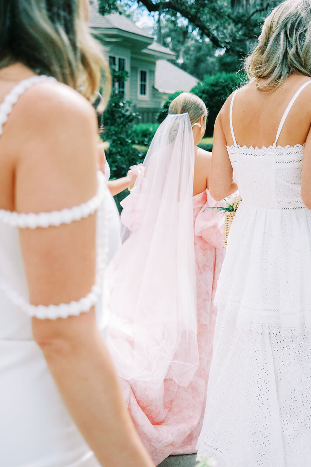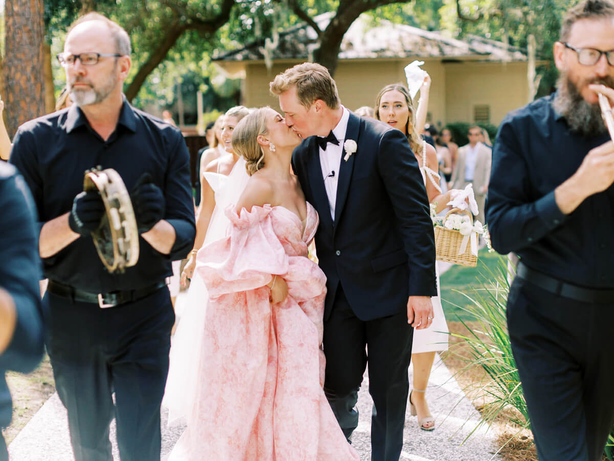 We love it when a couple flips the script, and that’s exactly what our bride Marisa did by outfitting her bridesmaids in white and donning (an absolutely gorgeous, show-stopping) pink wedding dress herself. Très chic! They worked with Grit & Grace Inc to bring a happy summer vibe to their luxe Hilton Head wedding venue Sea Pines—a beachside resort, golf course, and ballroom—achieving a relaxed elegance rarely done so well. Lots of images and pretty details below, captured by Perry Vaile Photography!