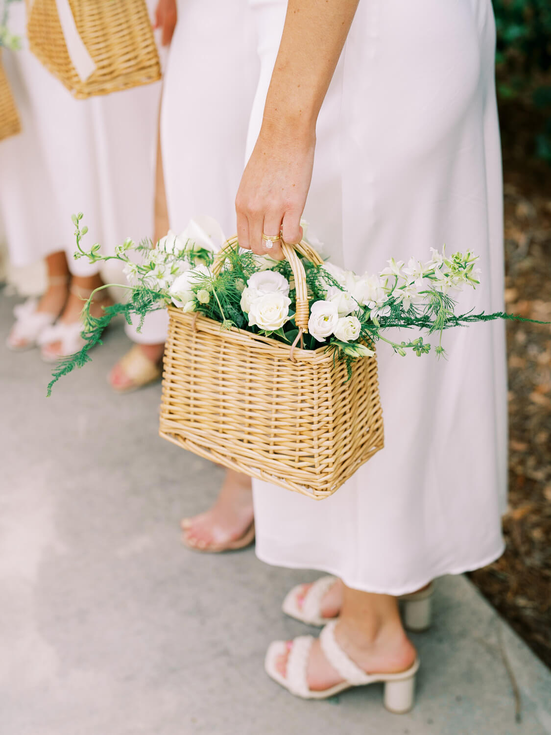 Bridesmaids all chose their own white sundresses, each with its own charming details. The idea to have them carry rattan basket purses with white flowers was a last minute addition, and ended up being so perfect for the day!