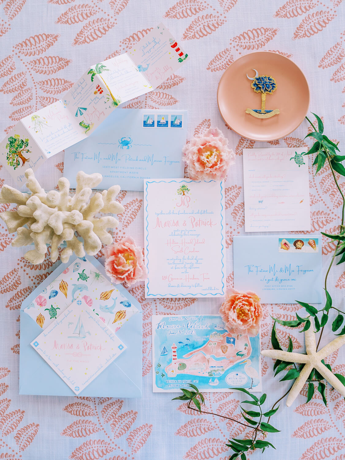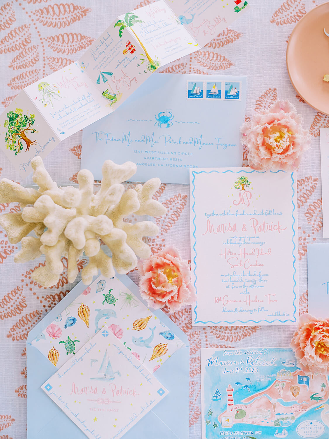 Their custom watercolor wedding invitations by Laura Lines Calligraphy set the tone for a playful beachside wedding, with cute coastal creatures, a map of the island, and adorably illustrated schedule of events.