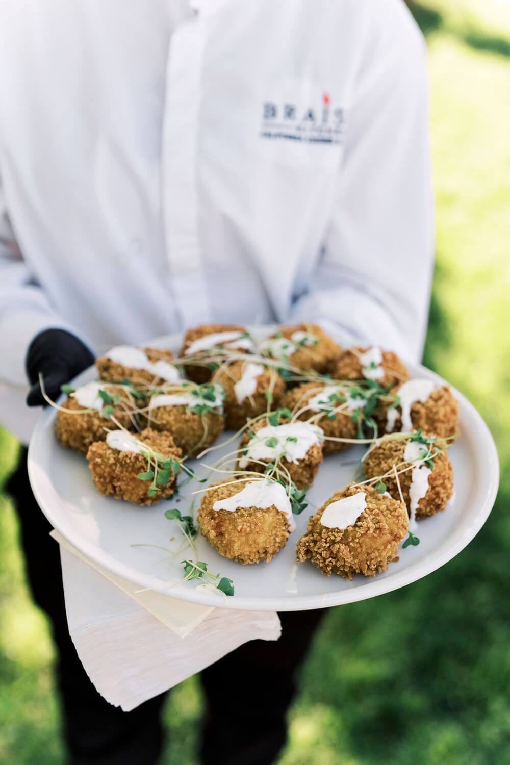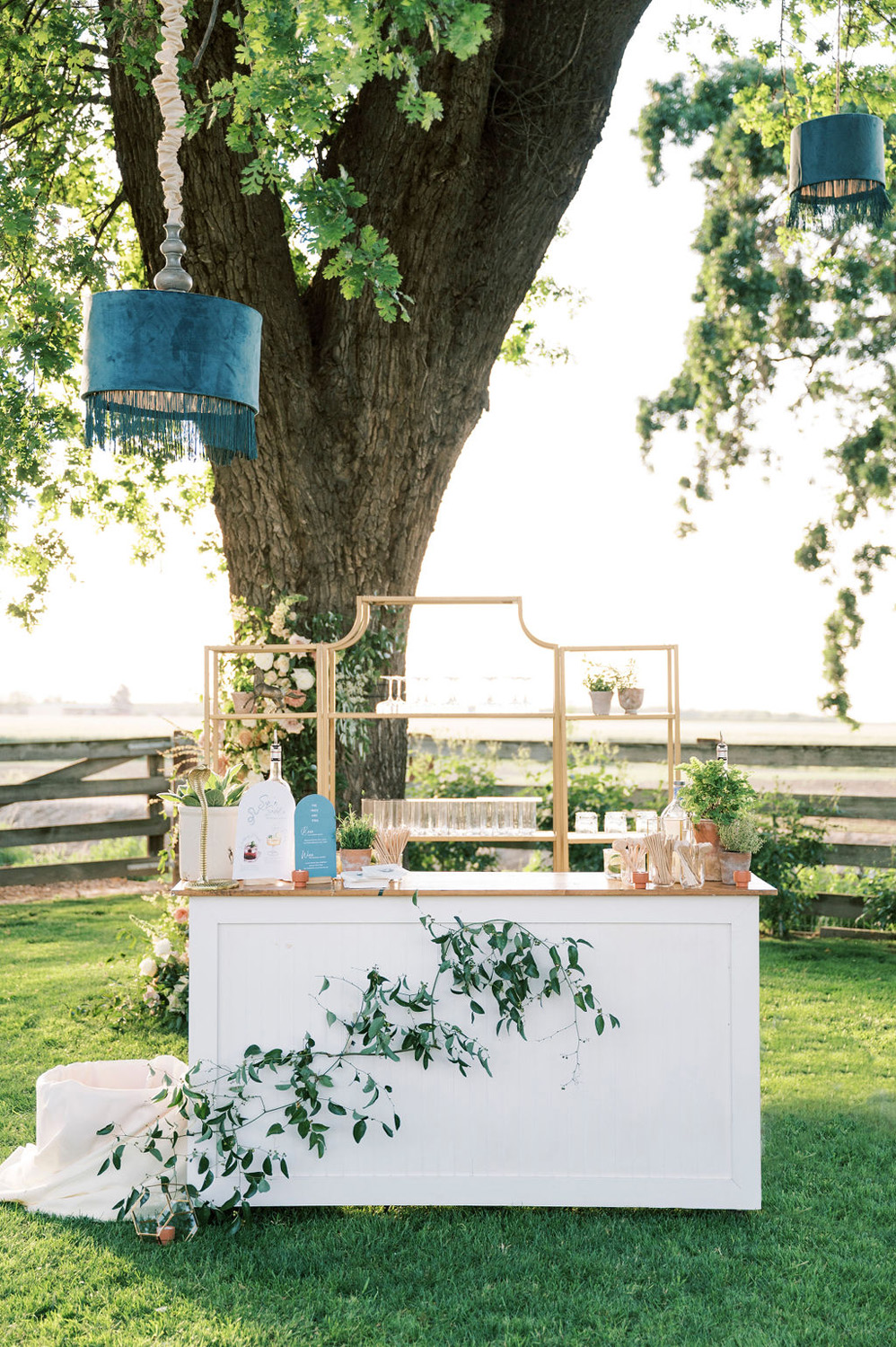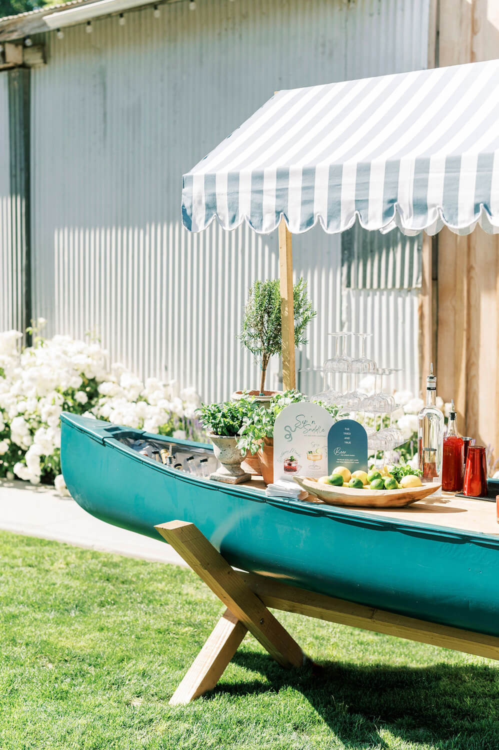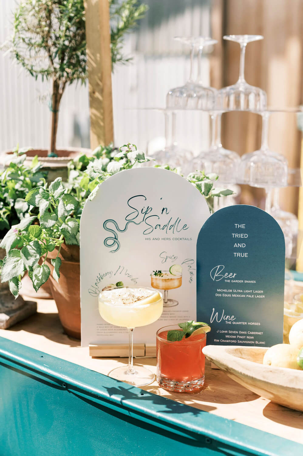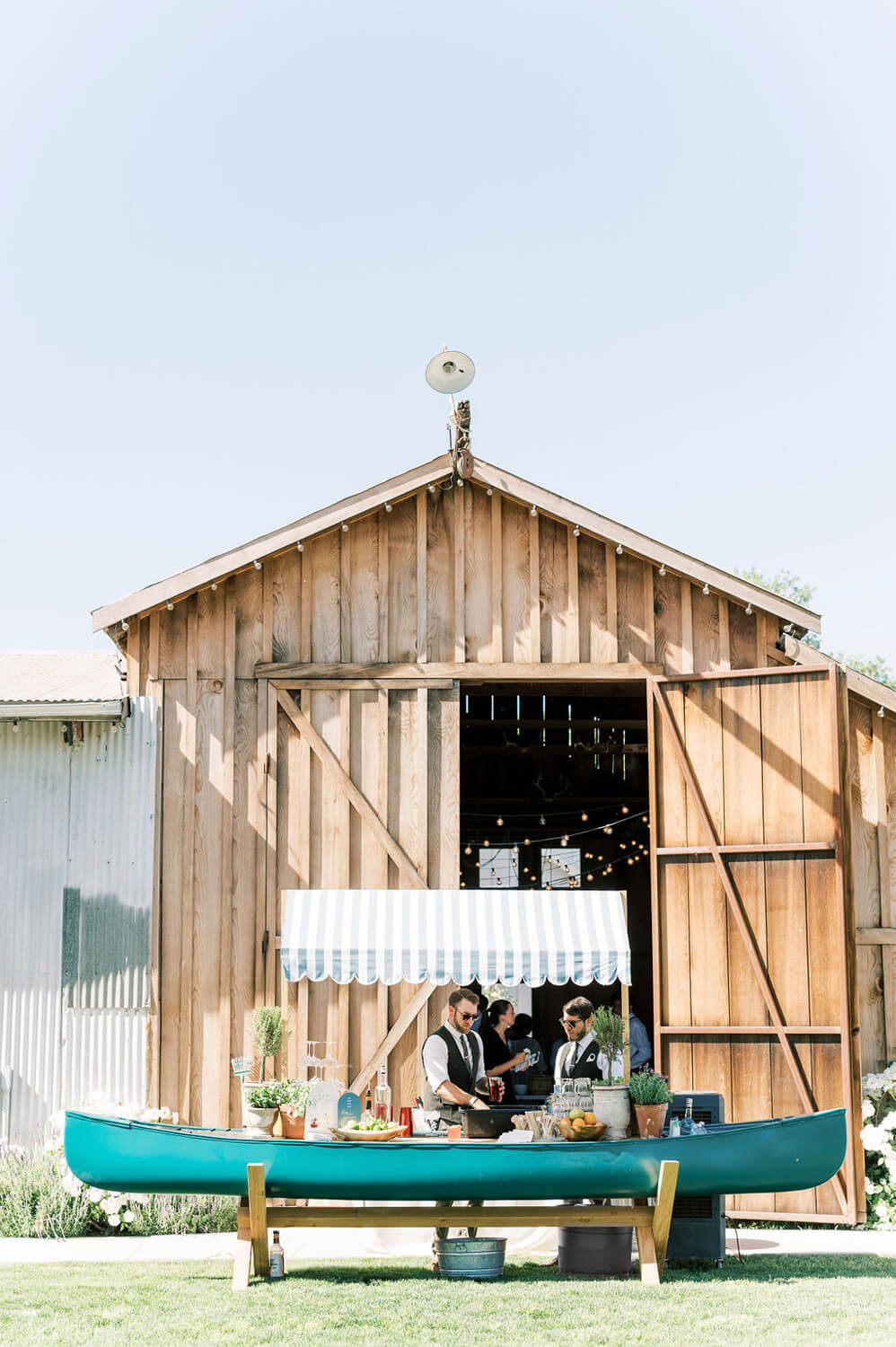 To continue the outdoor adventure theme, the couple offered each guest a paleta-infused agua fresca to sip and wooden placard ornament favors to keep as they found their way to their seats. Guests were greeted with custom appetizers featuring the bride and groom’s favorites—mac and cheese and chicken + waffles—and sipped on a his and hers cocktail aptly named, “Spicy Peach Palomino” after a horse and, “The Blackberry Mamba” after a snake… All served on a custom made canoe bar to represent a favorite activity of the bride and groom!