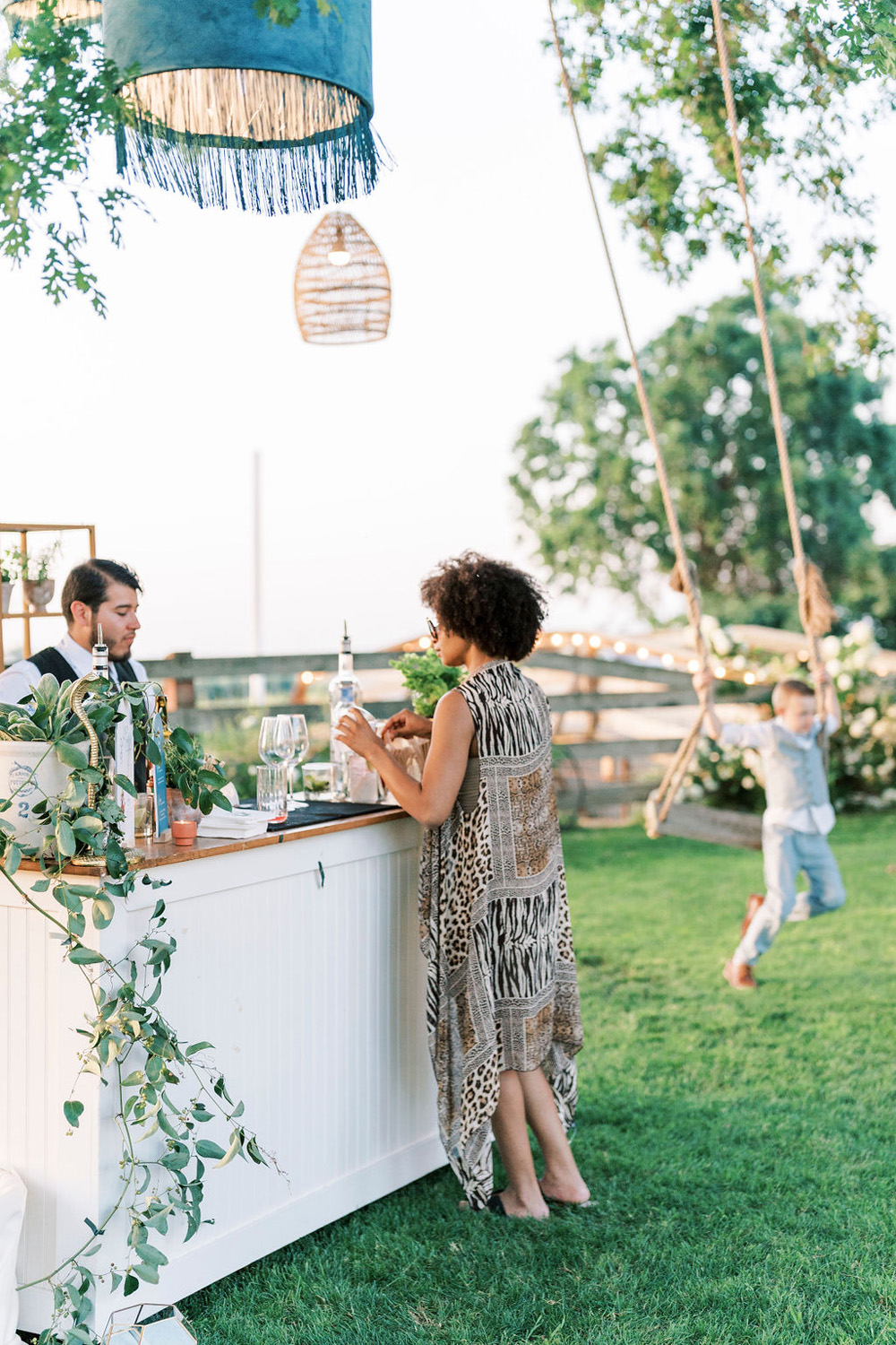 The couple also crafted a wishing wall showcasing photos of their love story as well as honored family members who had passed. Guests could record well wishes for the couple on cards as they lounged among the rustic garden setting. The wall even featured hand-carved horses made by the bride’s grandfather.