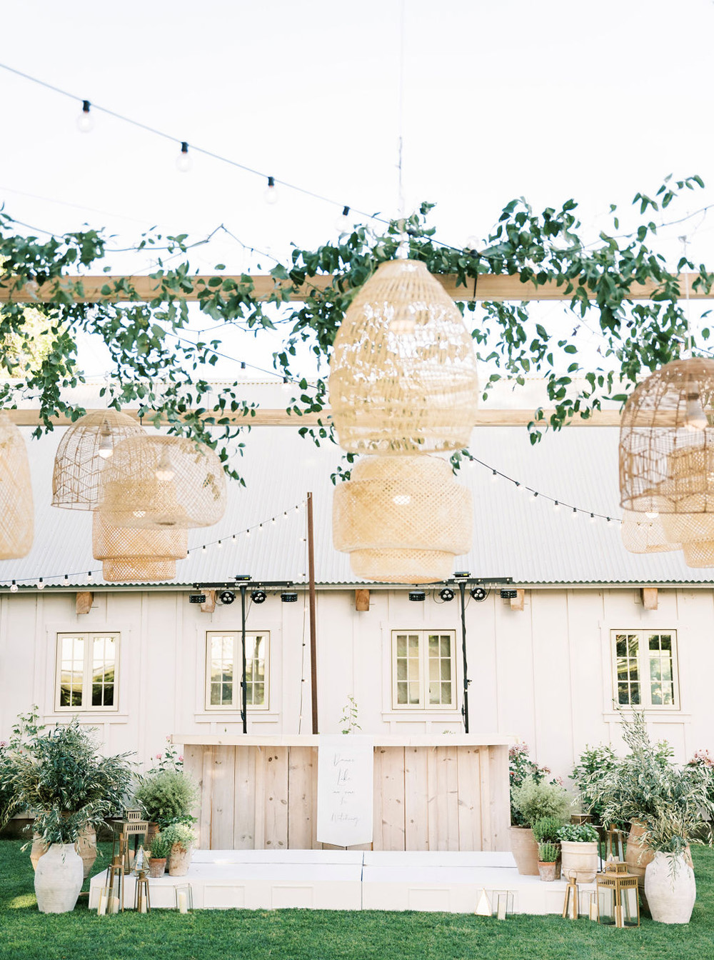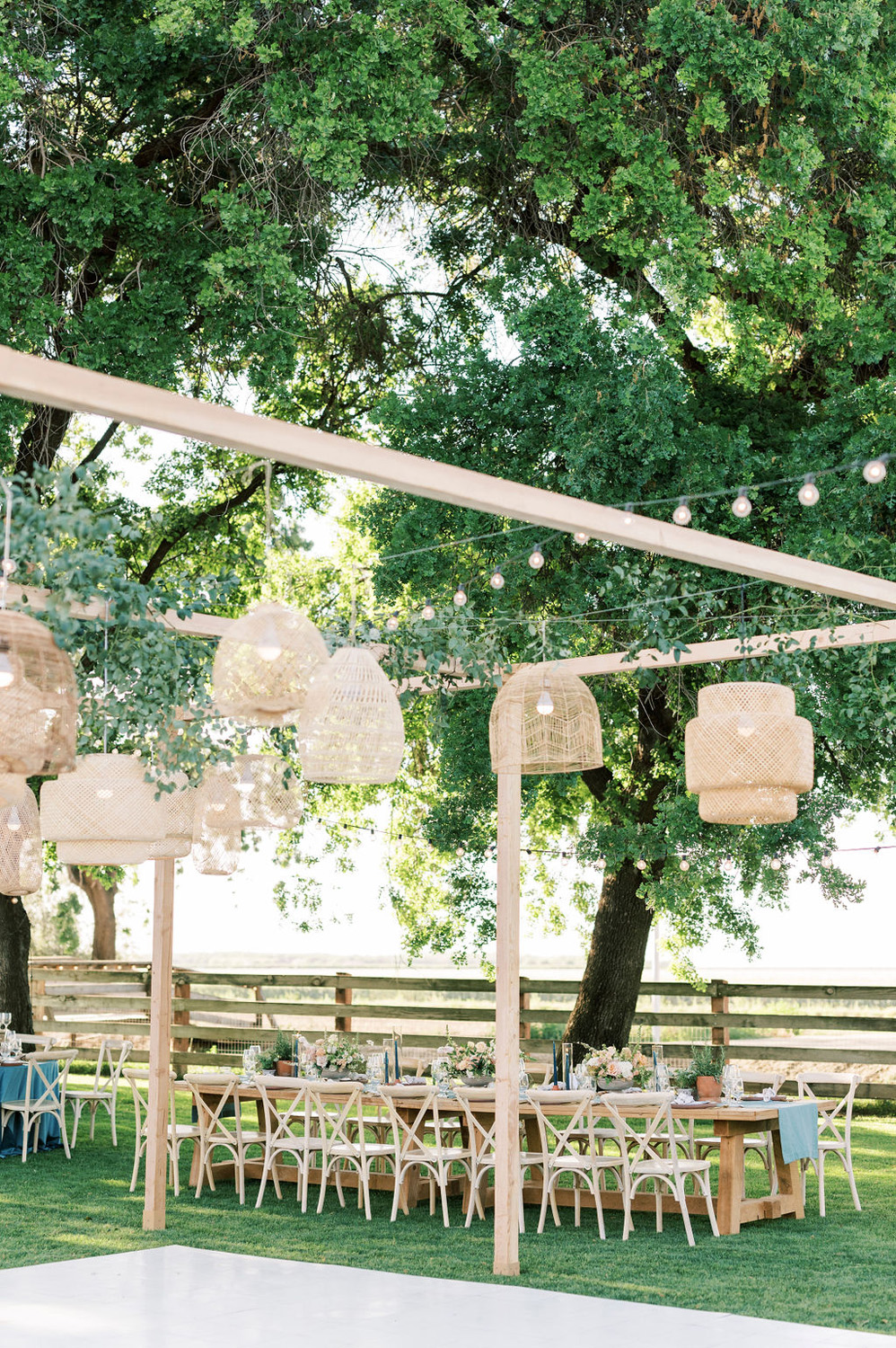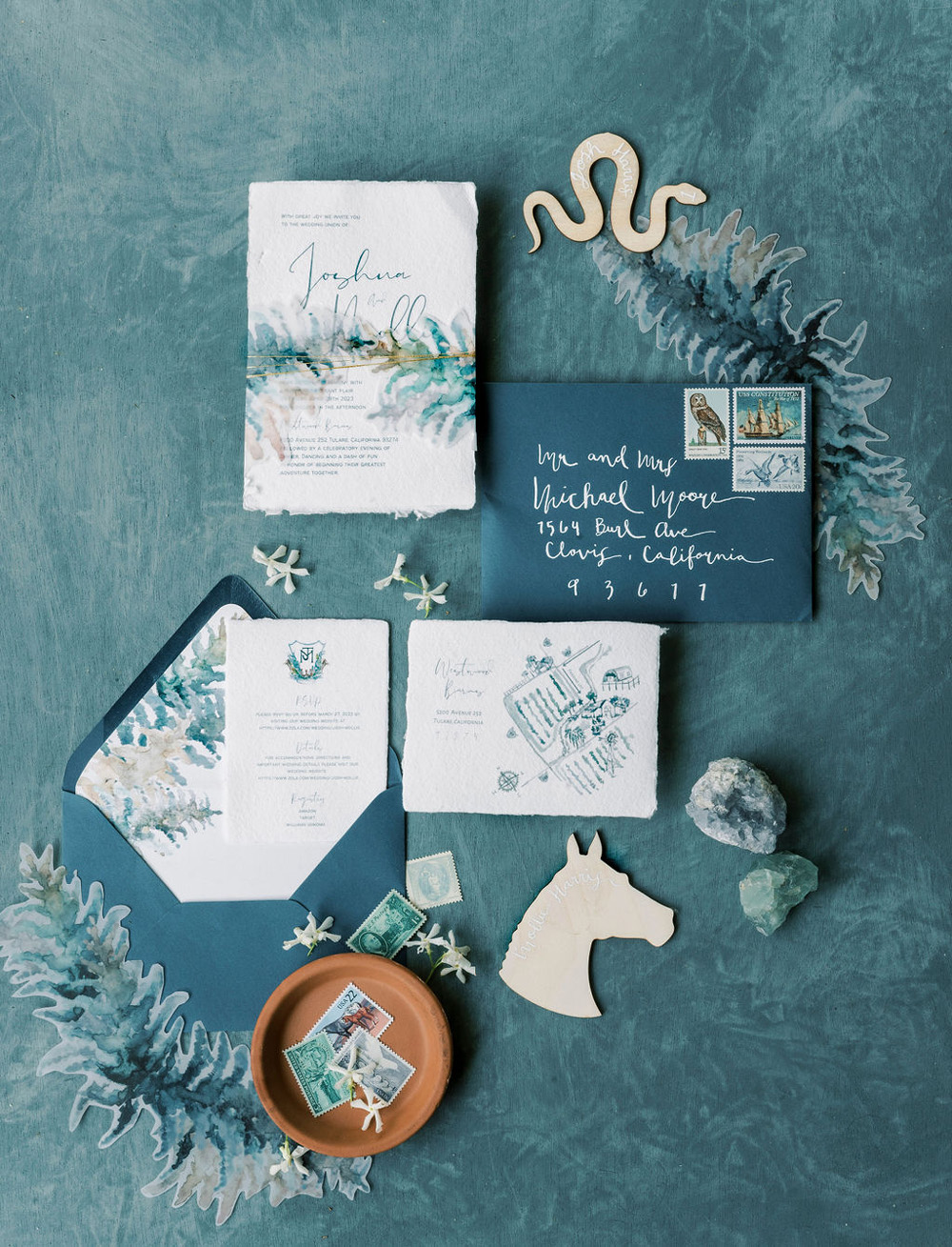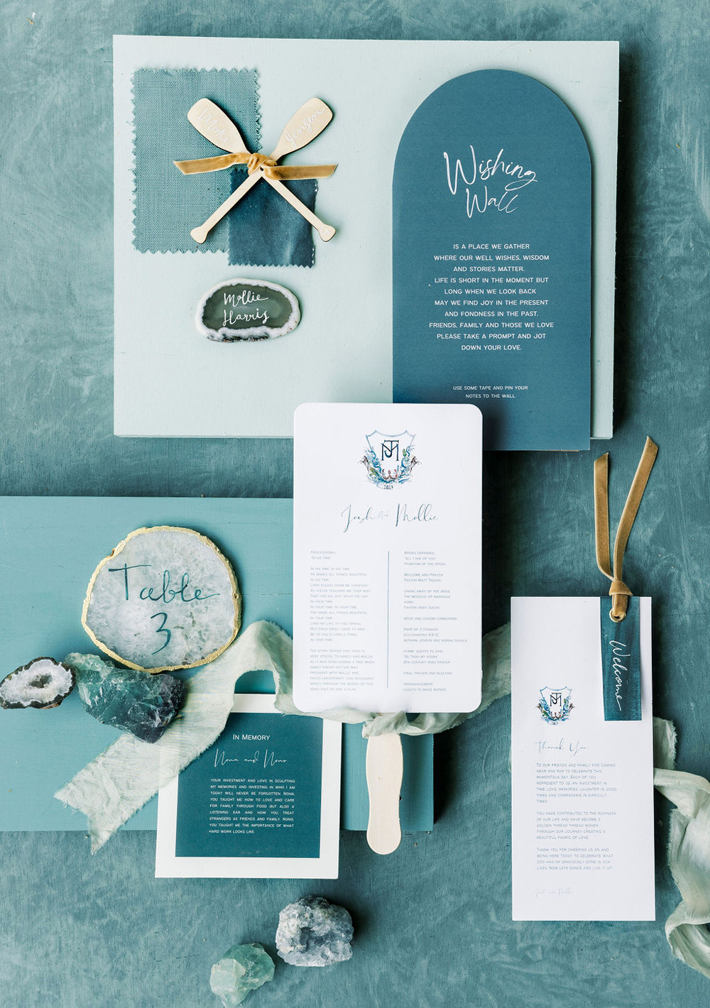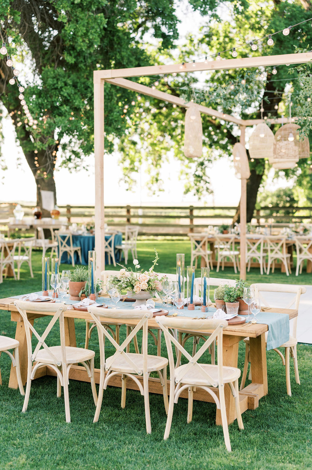 Every detail of Josh and Mollie’s rustic garden wedding had a special meaning for themselves and their love story, including nods to their love of the outdoors. Mollie spent years as a volunteer for an equine horse therapy program in the Central Valley and the groom is an avid reptile enthusiast, so they went with horse and snake motifs throughout. A custom crest (also by Kelly) featured these elements along with messages highlighting the symbolism of each motif. Lastly, their blue color palette and custom details (like a canoe bar, seating chart with spring drinks, and a wishing wall) brought everything together.