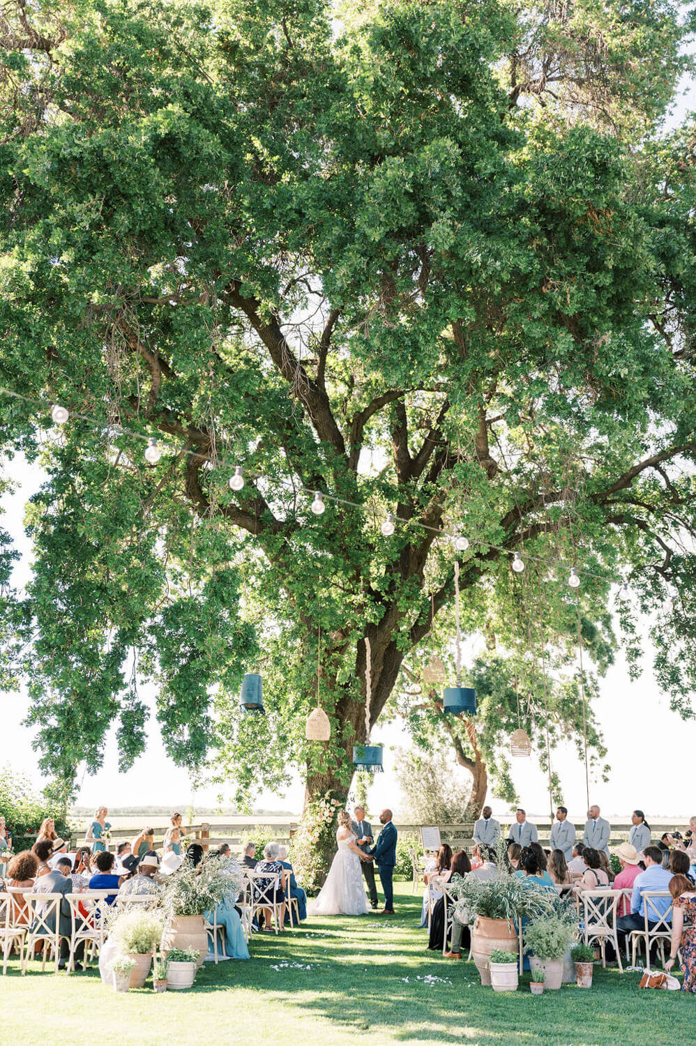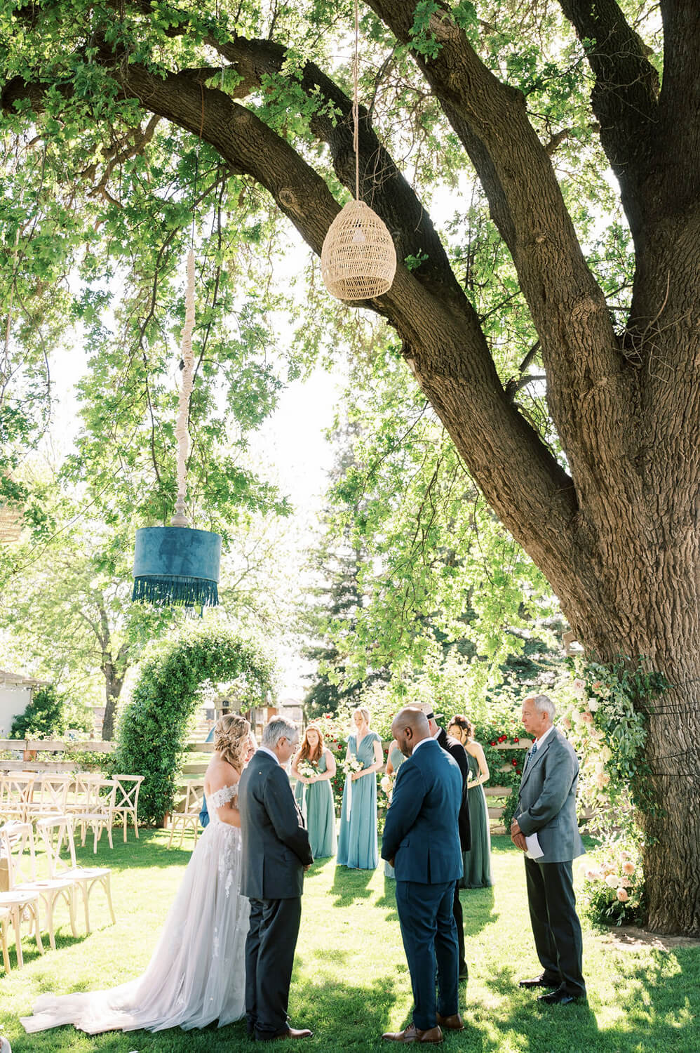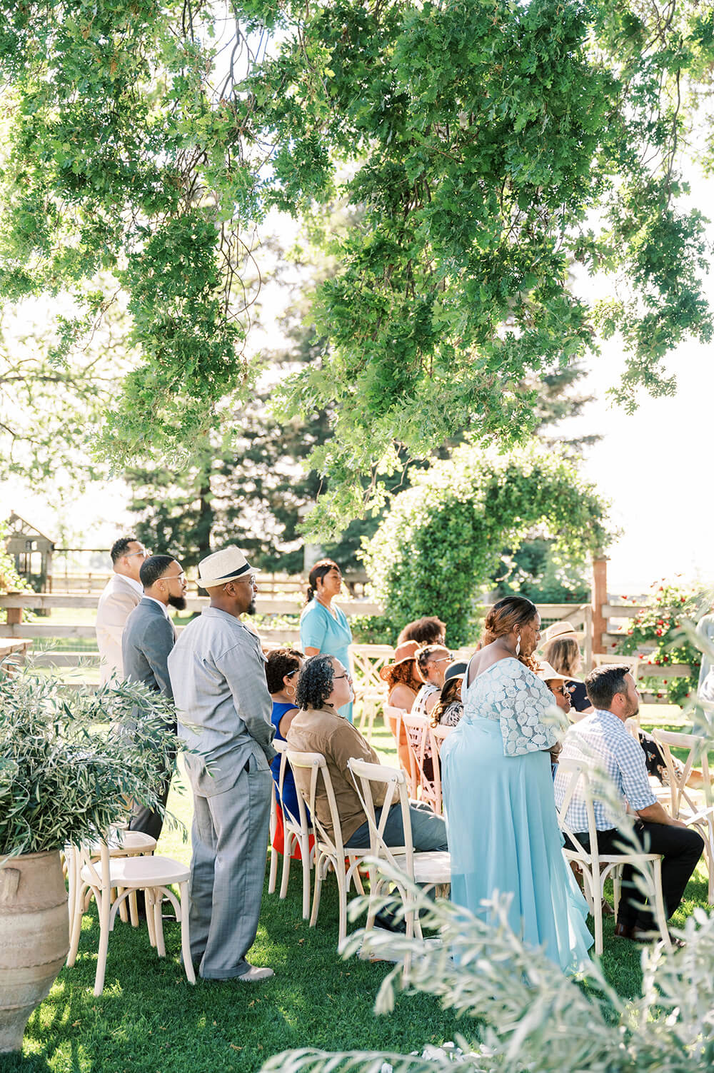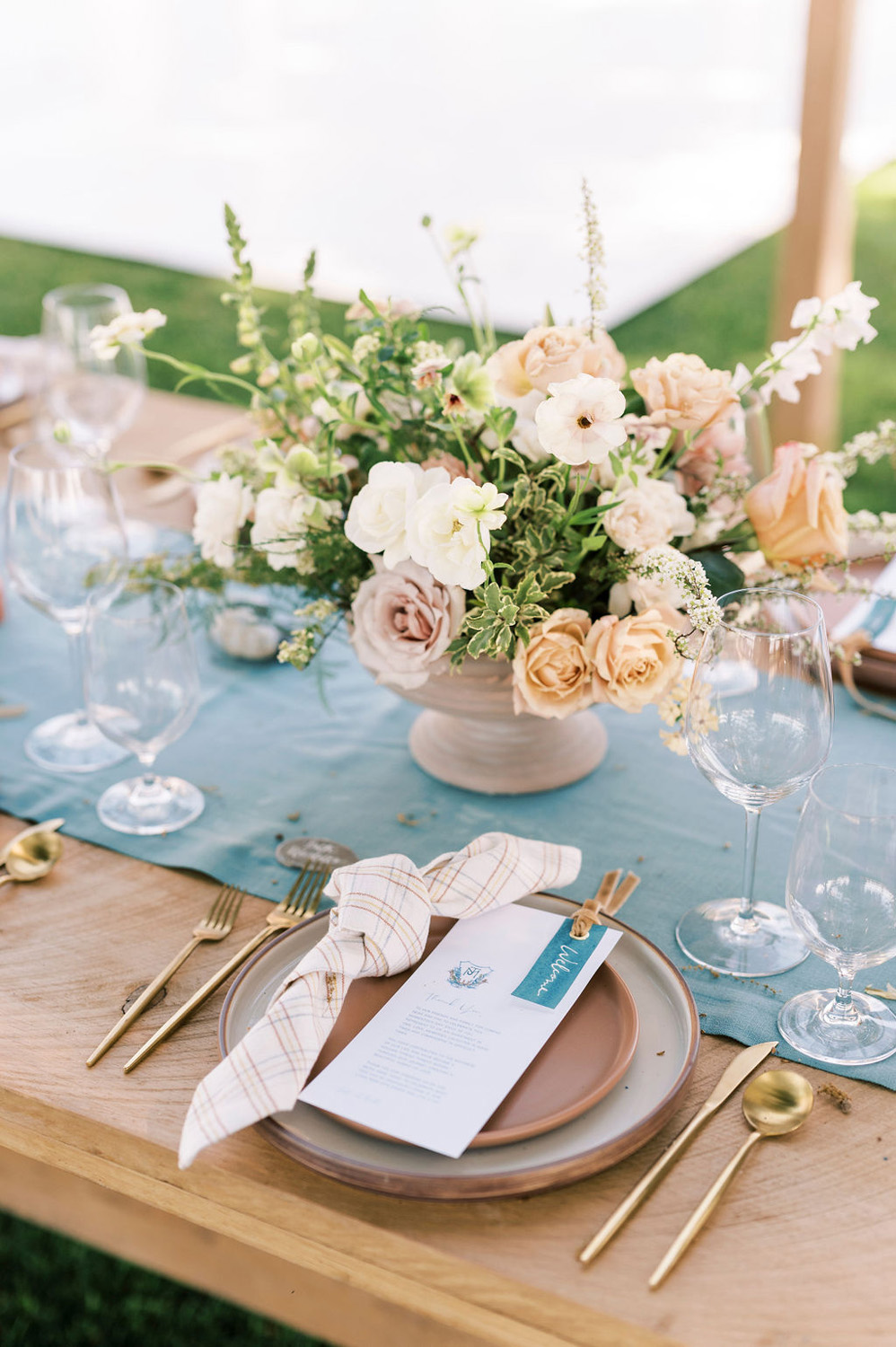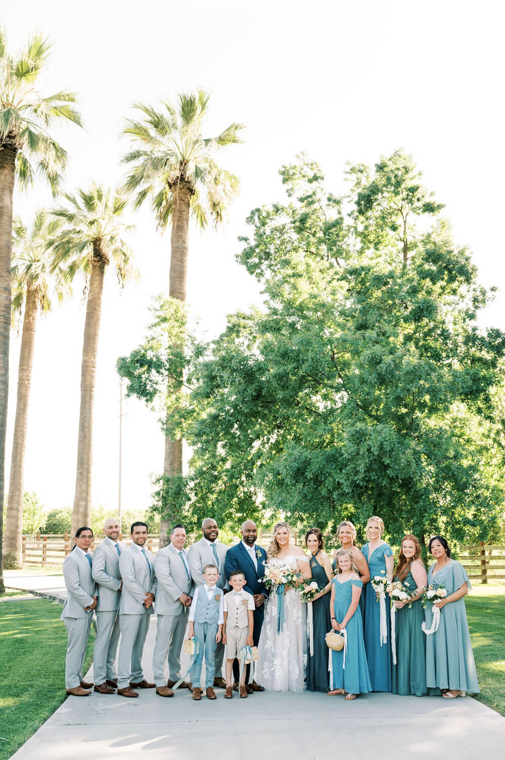 Every detail of Josh and Mollie’s rustic garden wedding had a special meaning for themselves and their love story, including nods to their love of the outdoors. Mollie spent years as a volunteer for an equine horse therapy program in the Central Valley and the groom is an avid reptile enthusiast, so they went with horse and snake motifs throughout. A custom crest (also by Kelly) featured these elements along with messages highlighting the symbolism of each motif. Lastly, their blue color palette and custom details (like a canoe bar, seating chart with spring drinks, and a wishing wall) brought everything together.