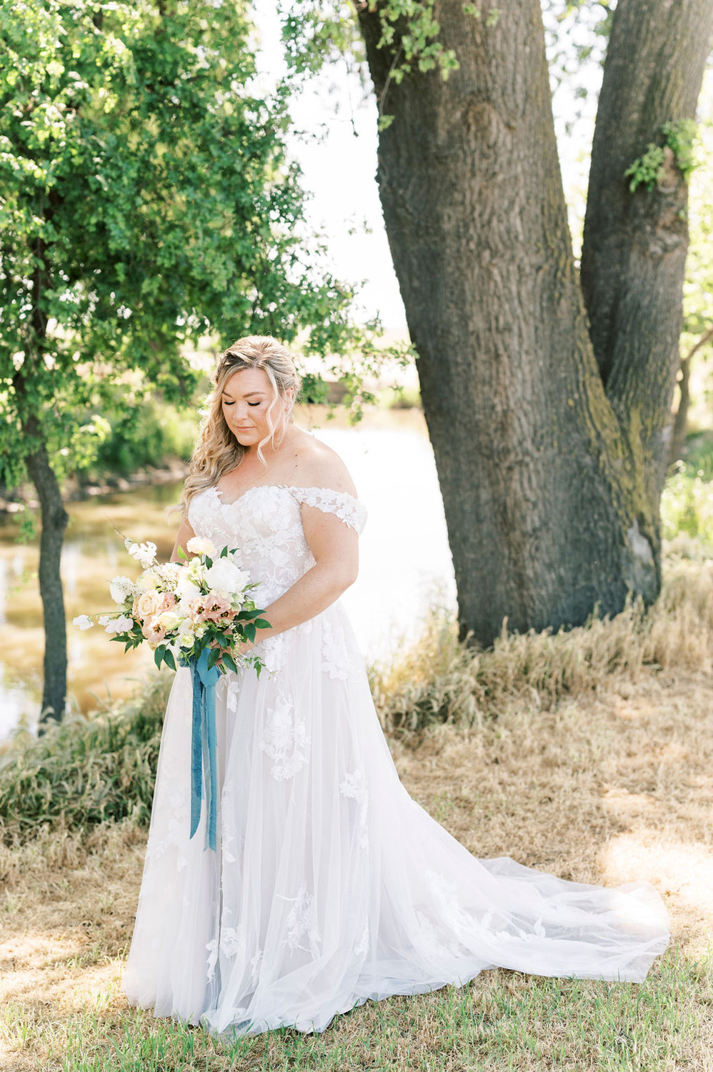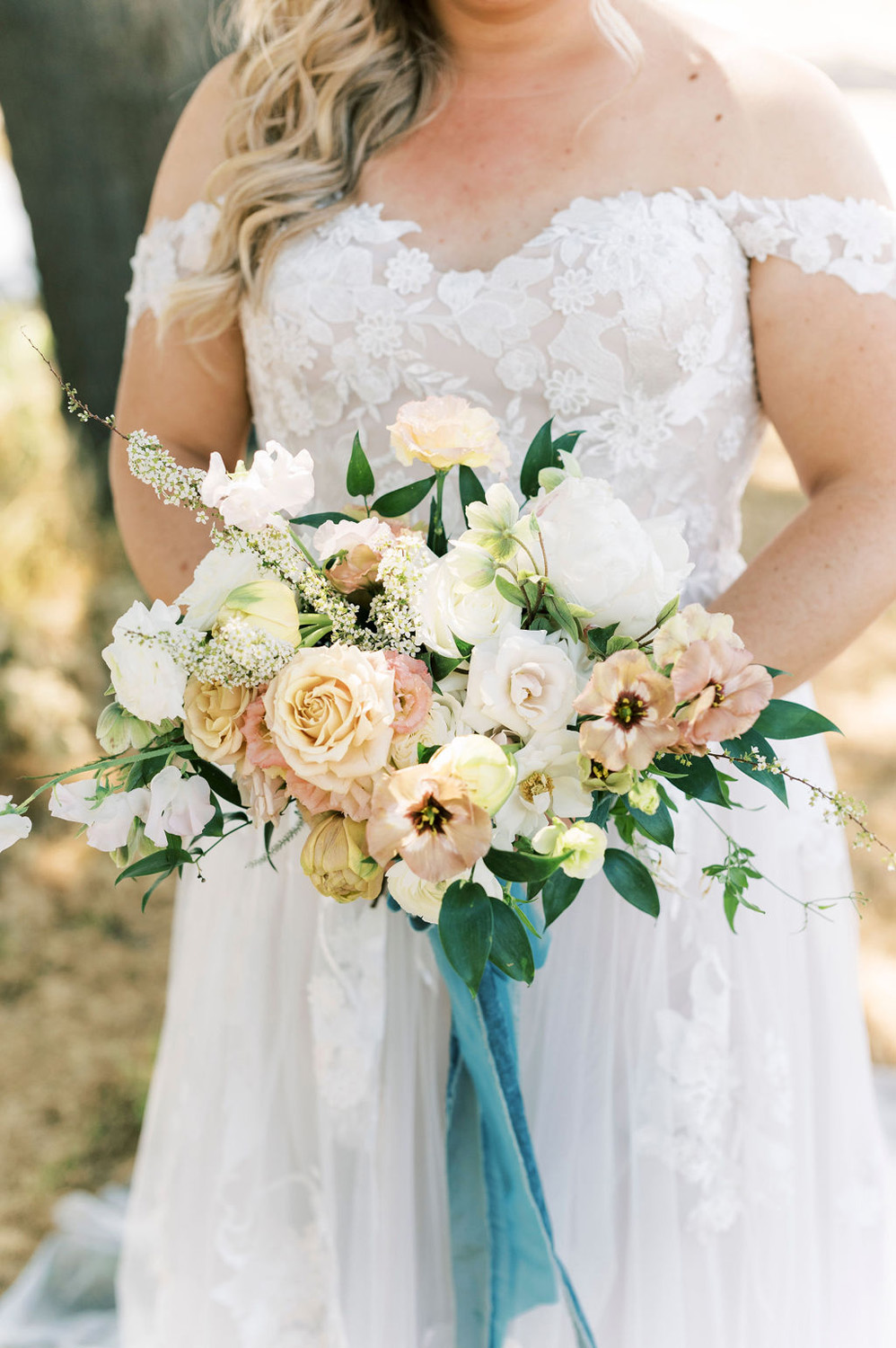 Their spring wedding flowers by Emerald Grace Floral Design resembled fresh-picked bouquets that contained specific flowers as a tribute to the bride’s mom and grandmother. Love the romantic blue velvet ribbon!