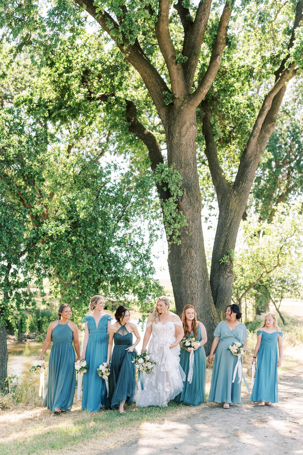 Blue bridesmaid dresses in different tones brought the rustic garden theme together while repping their love of the ocean.