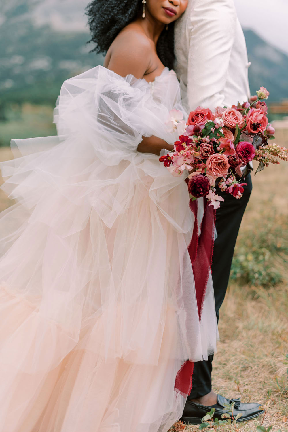 Add red and black to your burgundy and blush palette to take the romance up a notch, as seen in these gorgeous portraits here.
