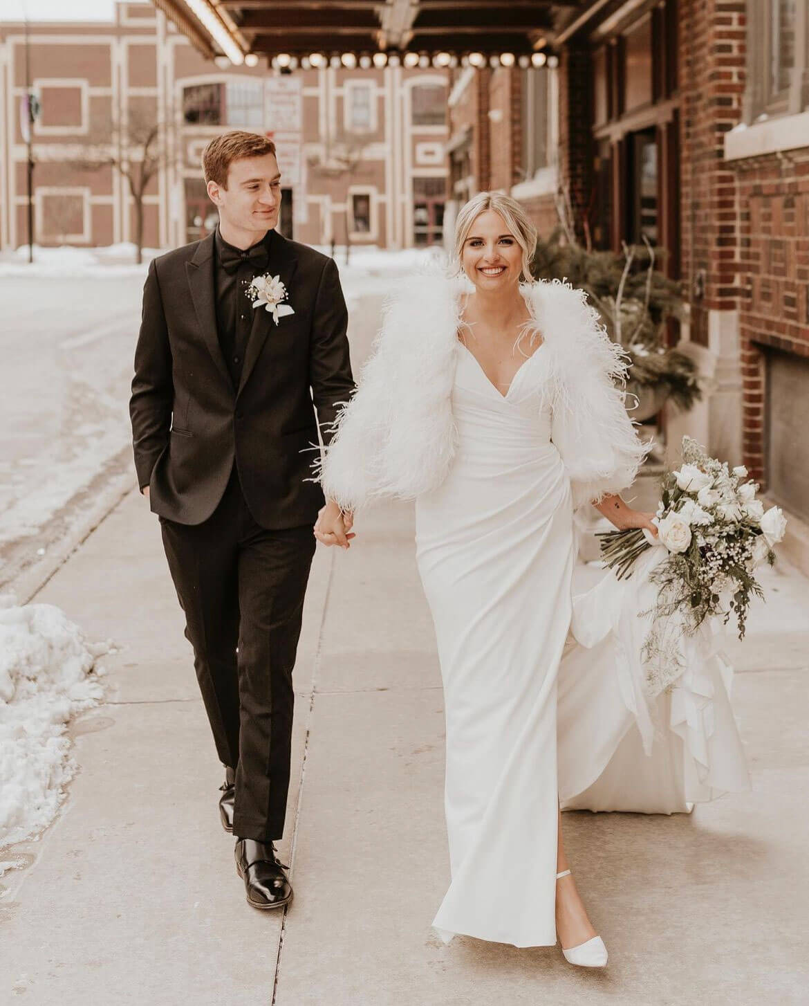 Another way to give a black and white color scheme a more festive vibe is to add fresh greenery. Love the bride’s feather coat too, obvs!