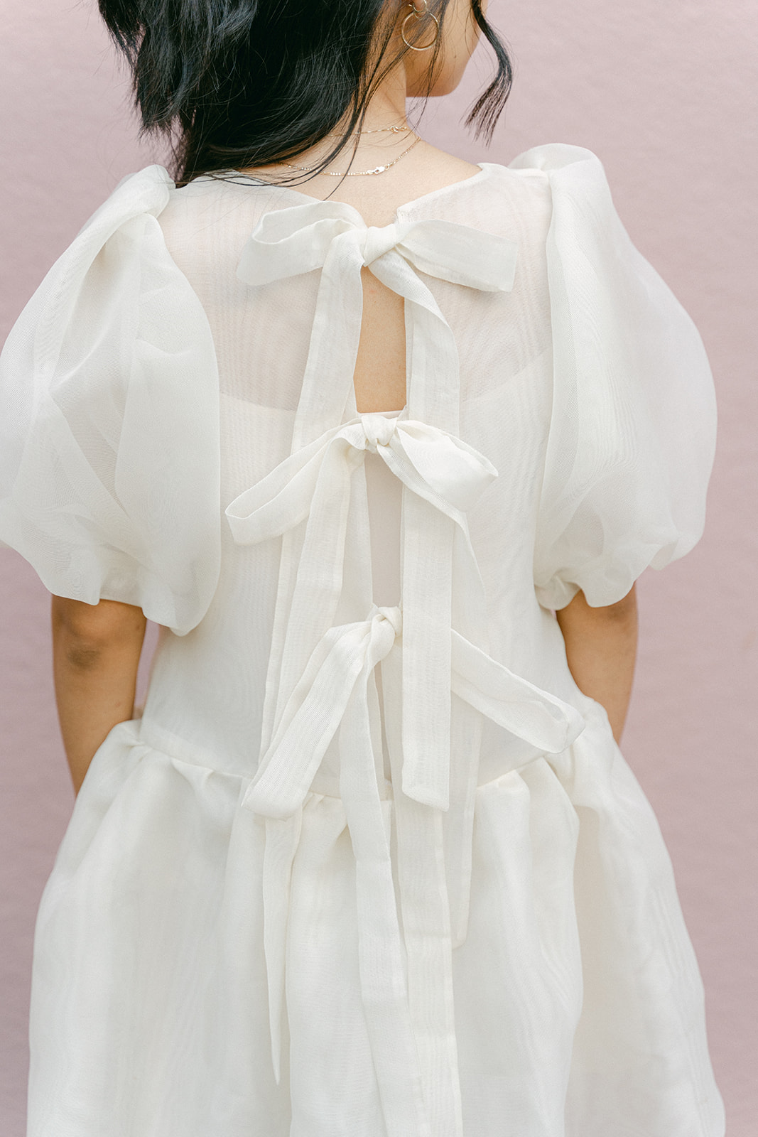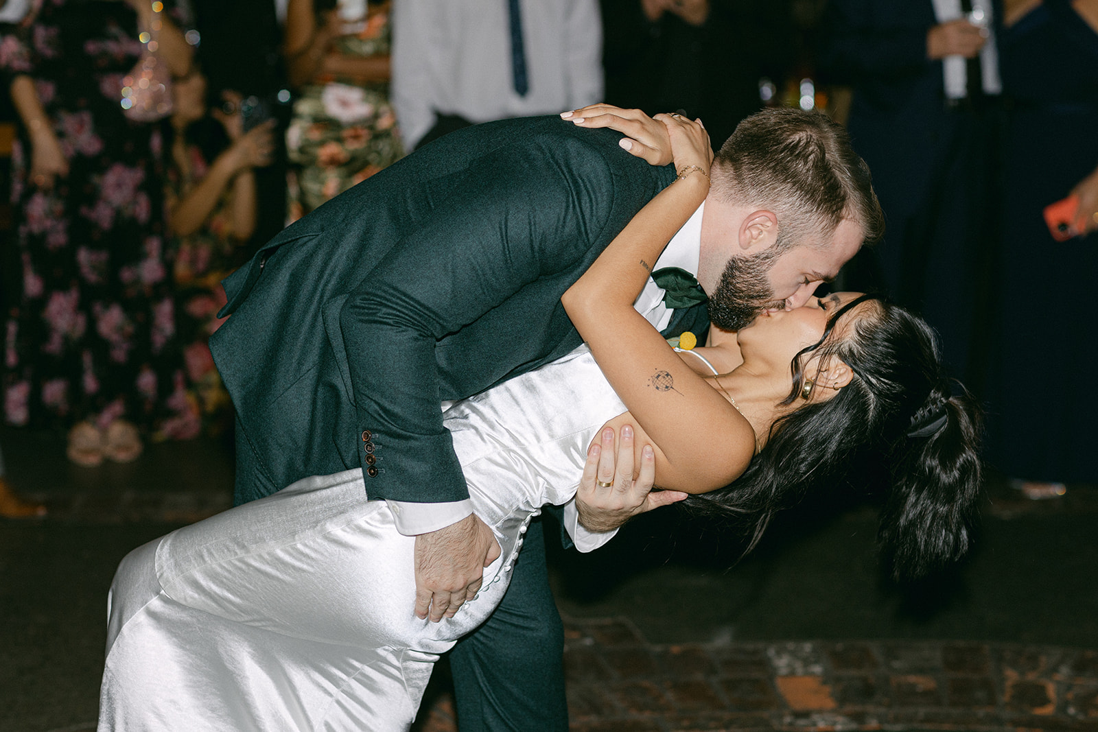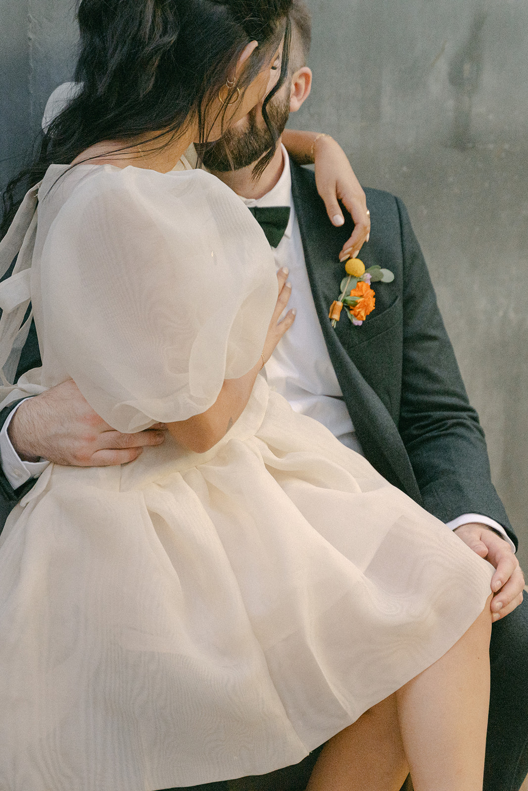 Let’s start with Kate’s bridal style. Such a cute wedding dress, right? She wanted to honor her Filipino roots with her wedding dress pick, so she chose a custom made, puff-sleeved and bow-adorned short dress from Studio Vania Romoff. At first she was a bit hesitant about opting for a short wedding dress, but she knew it would add a playful element to the day. She made the right choice, if you ask us!