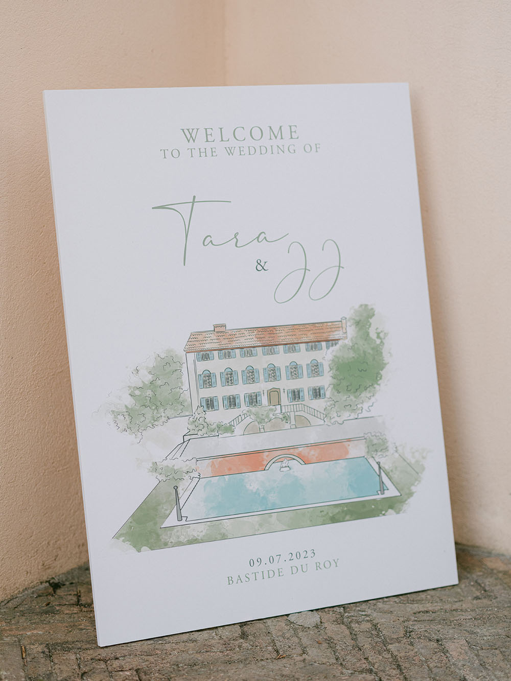 The couple welcomed guests to their destination wedding with custom totes illustrating the location along the French Riviera.