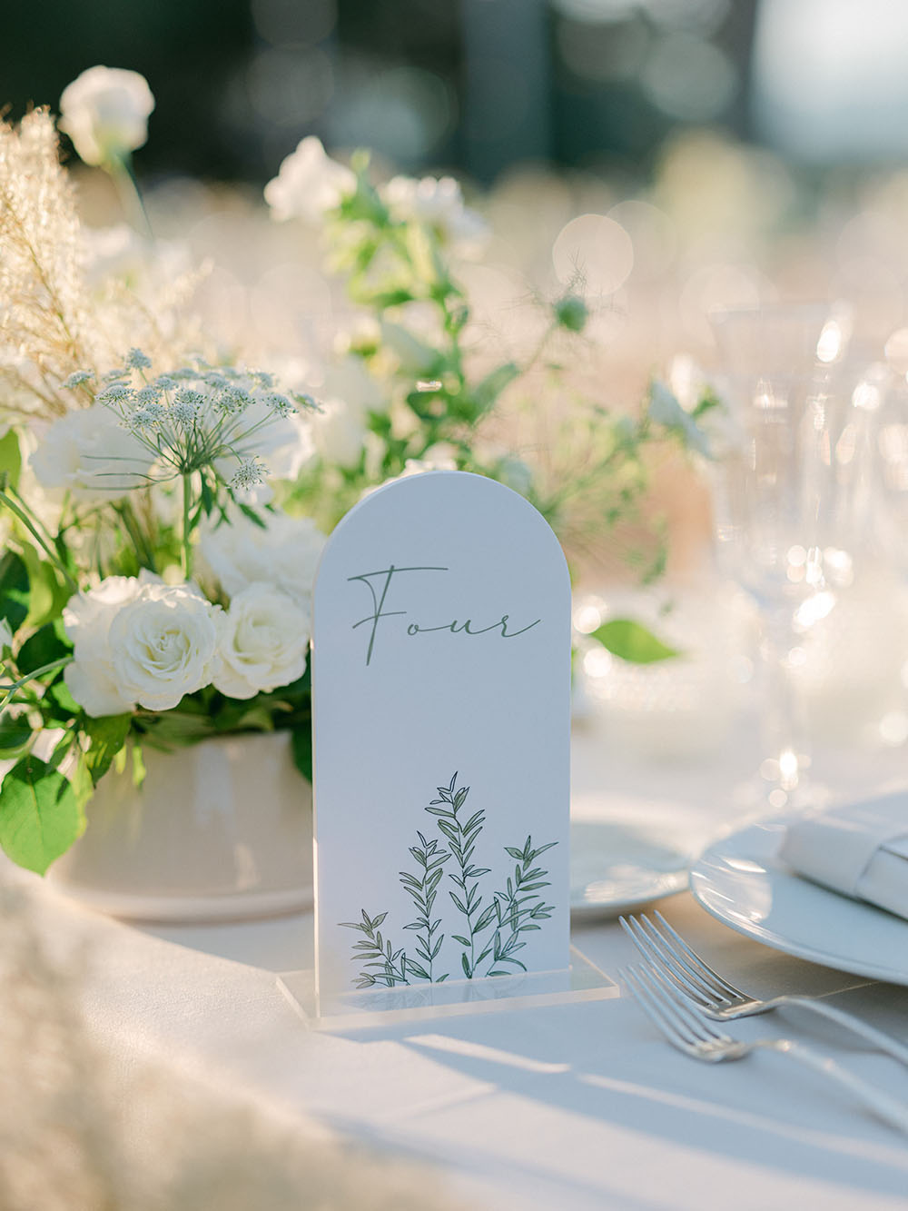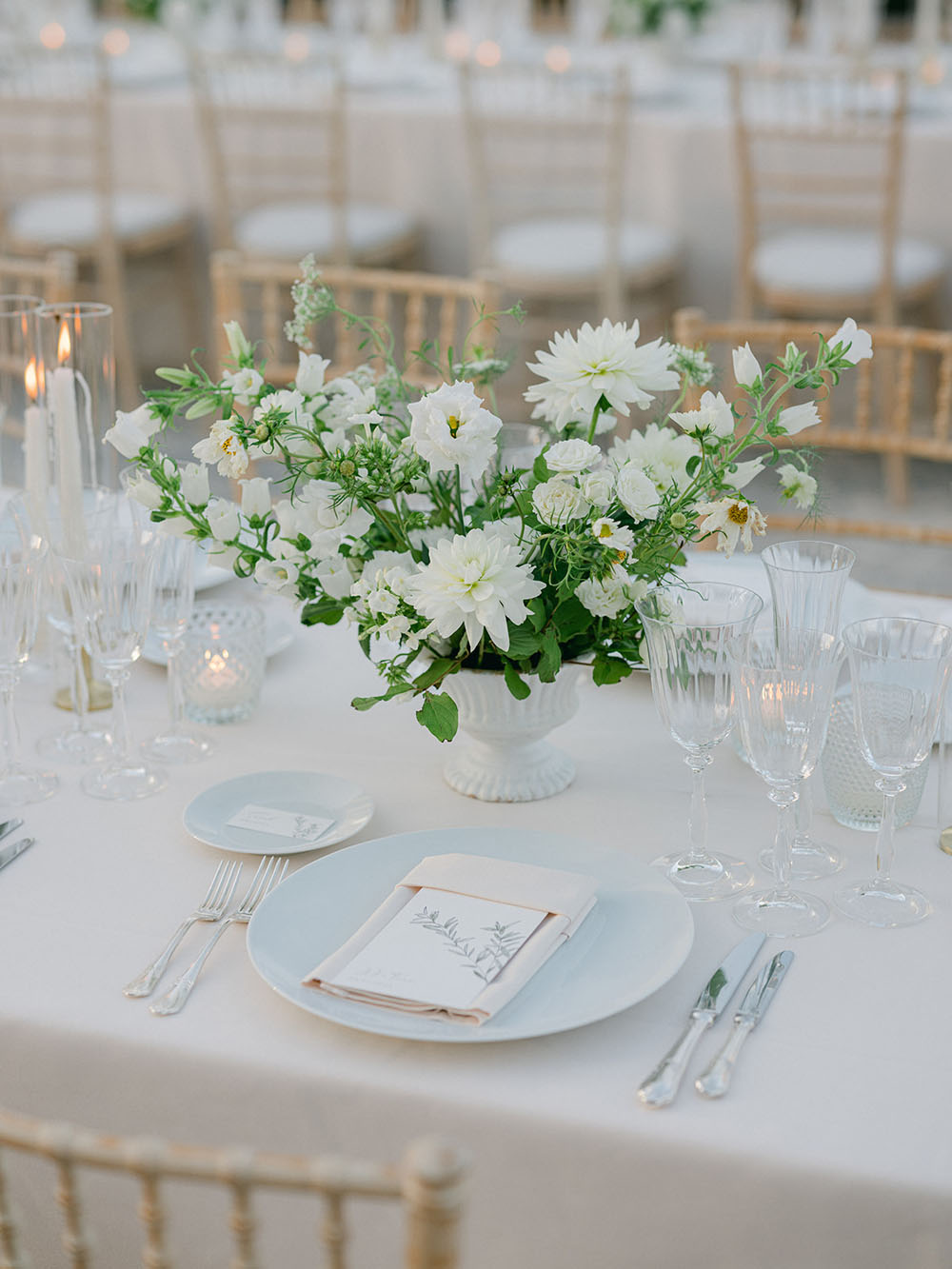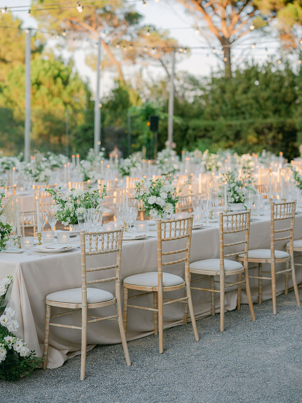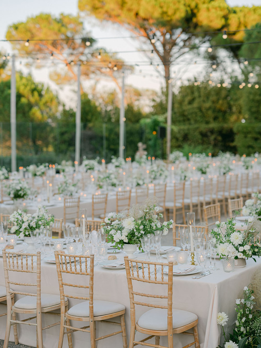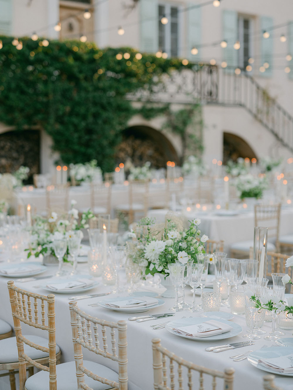 Green, white and cream tablescapes felt right at home in this magical French garden setting.
