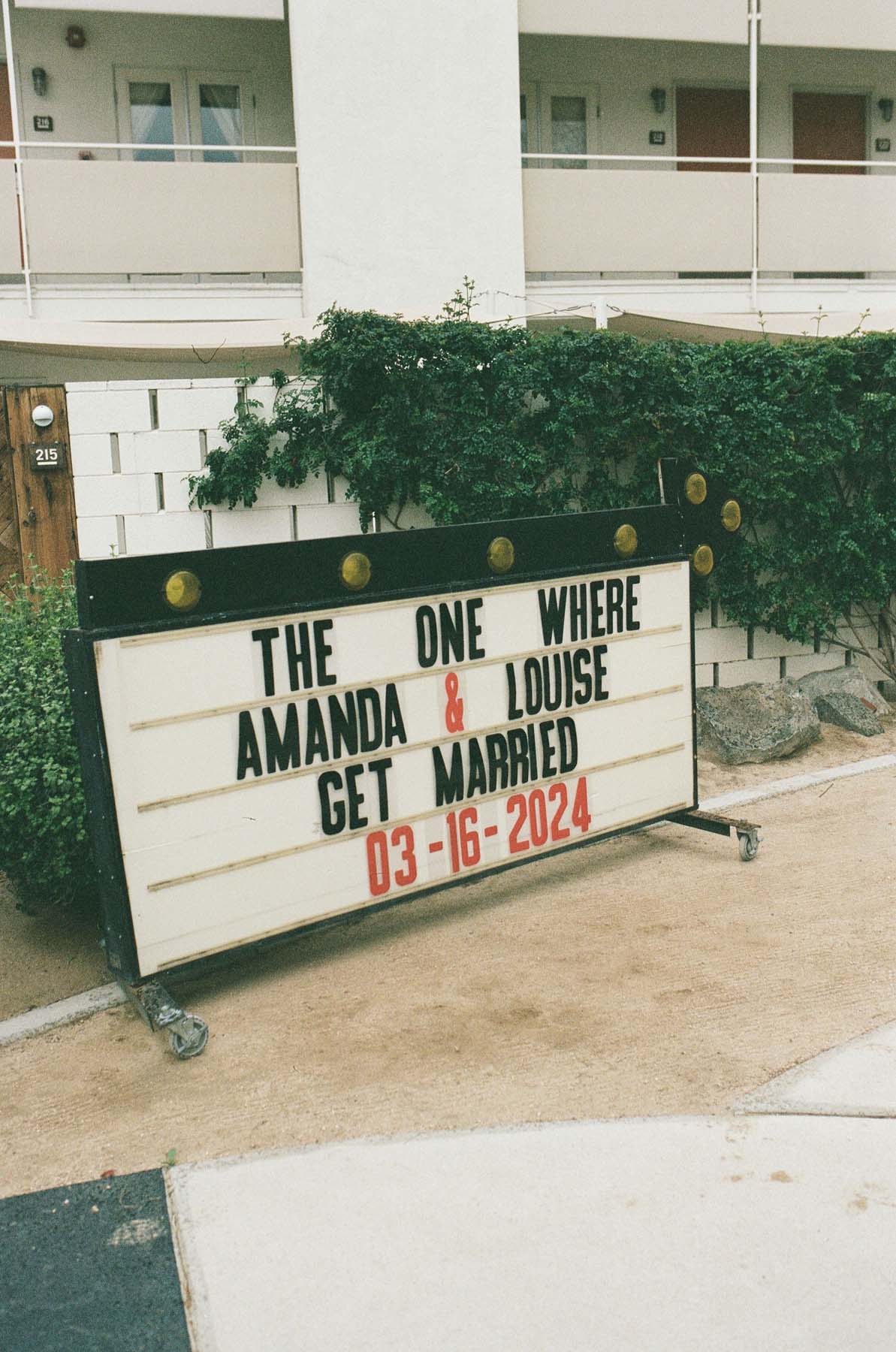 The Ace included tables, chairs, and other necessary items that venues typically require you to rent from an outside vendor. We also used a lot of local, Palm Springs vendors instead of booking vendors from elsewhere, which saved us money AND felt like a way to give back to the community. Lastly we tried not to go crazy when it came to signage – you don’t need a sign for every little thing, like pointing out where the bathrooms are – people can figure it out! We did splurge on a few things – like Louise’s custom dress and Amanda’s custom lavender suit. We also went hard on details, like our funky glassware, ikebana floral arrangements, and unique drink stirrers – because in our opinion it’s the little things that leave the biggest impression.