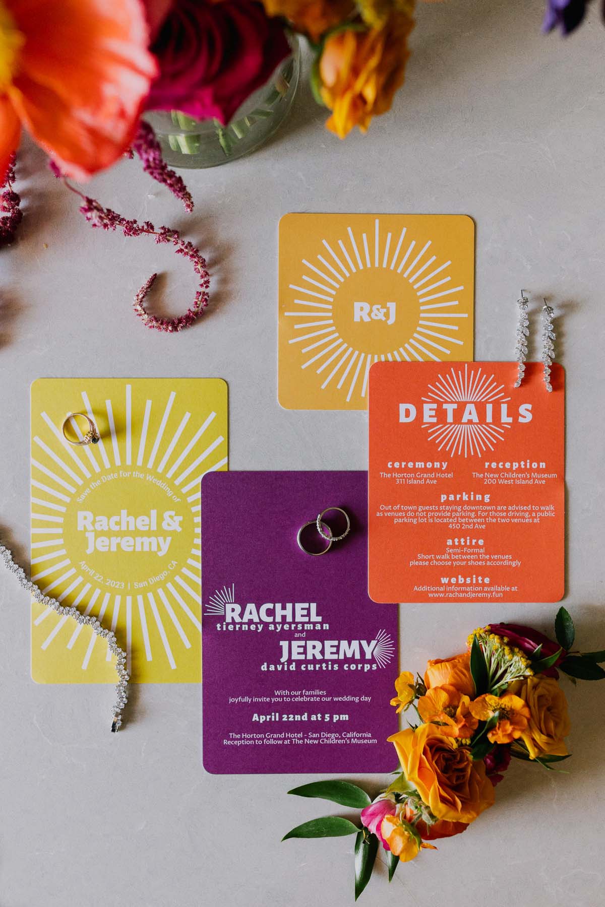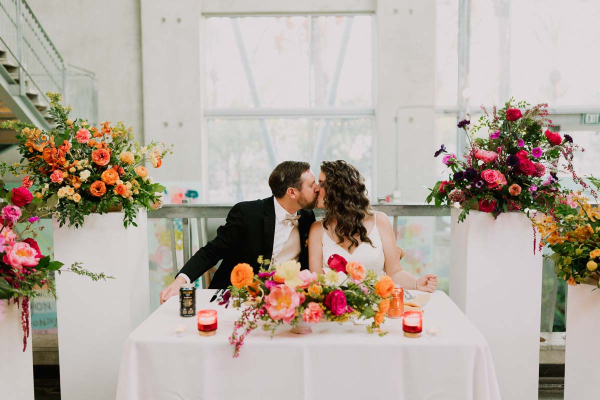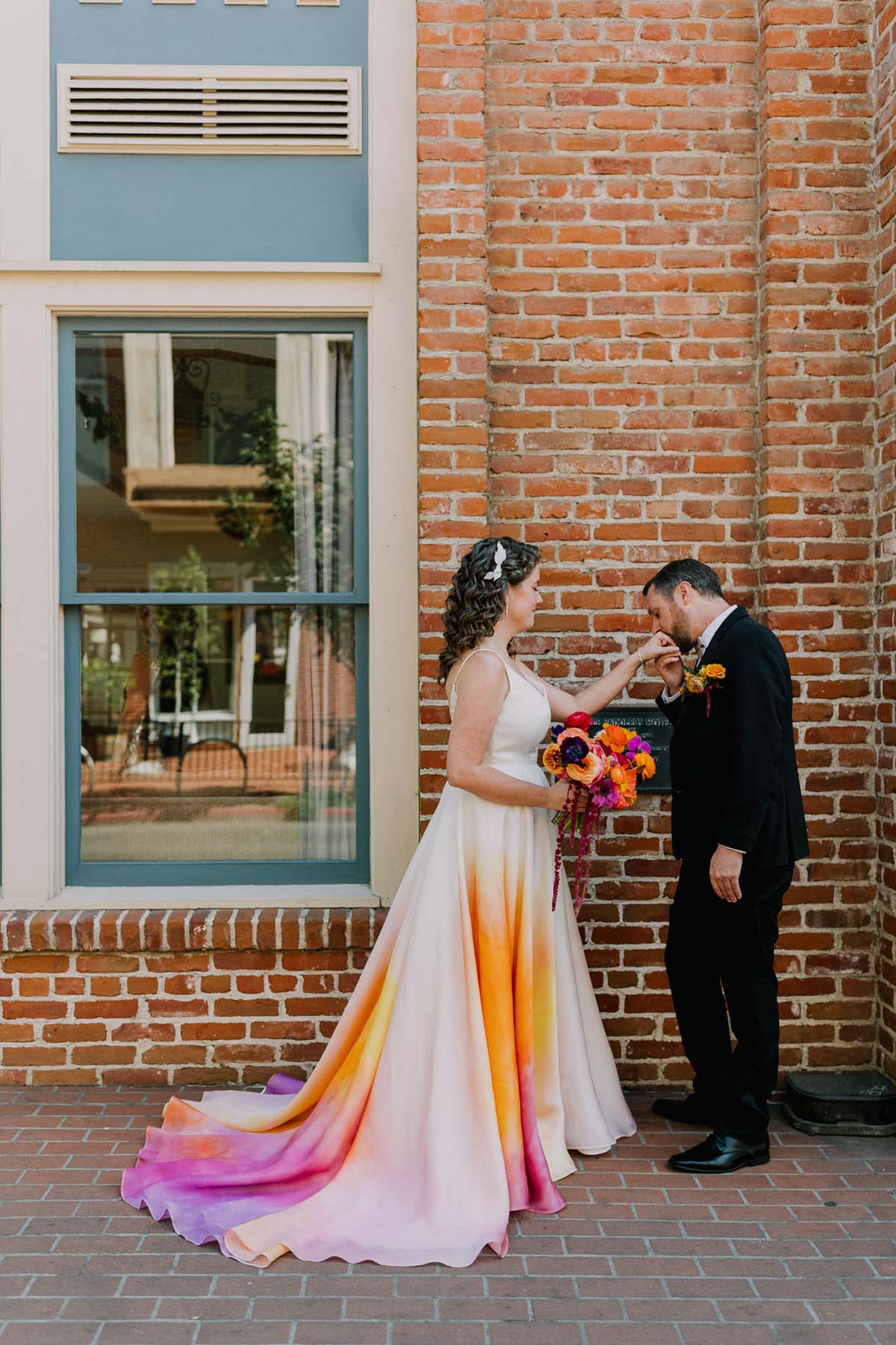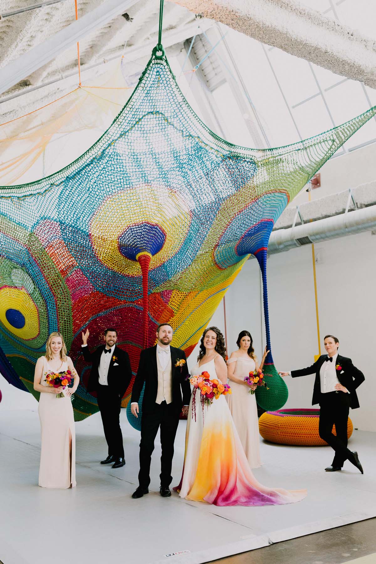 Rachel and Jeremy’s San Diego wedding at New Children’s Museum is bursting with good vibes, no doubt because they made sure everything was aligned closely with their two requirements: that their wedding be 1) colorful and 2) happy. As long as those musts were met, they knew their day would be special and guests would love it too. Details like a custom colorful wedding dress, rainbow tablescapes, a second line with their brass band were just some of the ways they made that happen. 100LC vendor guide member, the talented Lets Frolic Together, was behind the lens for this most joyful bash, and Horton Grand Hotel made for the perfect, intimate downtown spot to say I Do before parading on over to the museum.