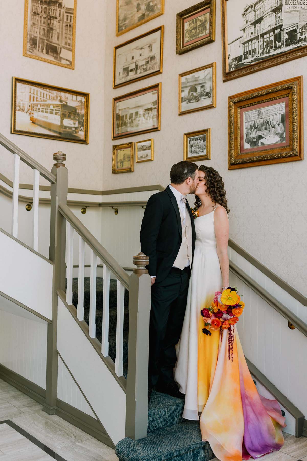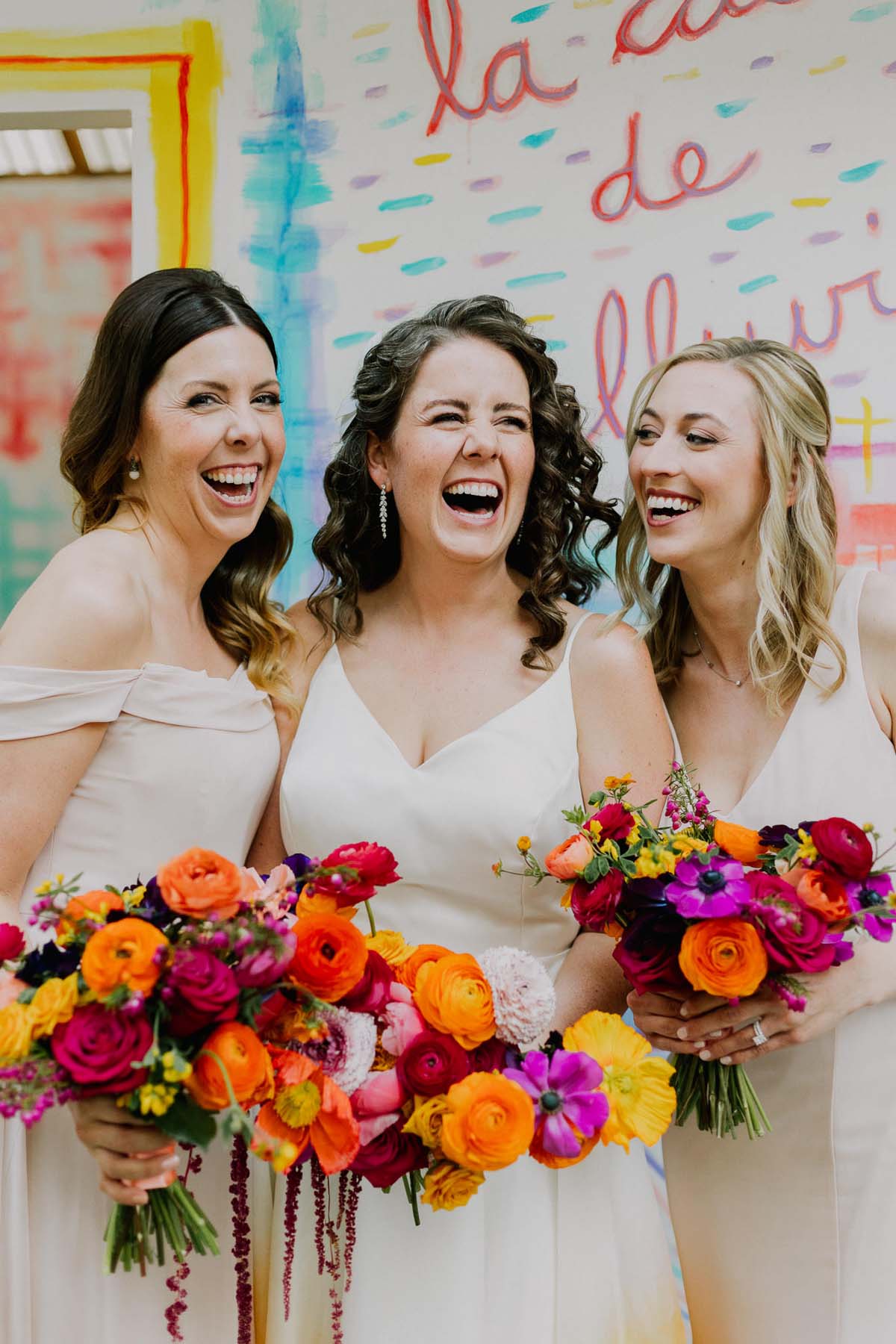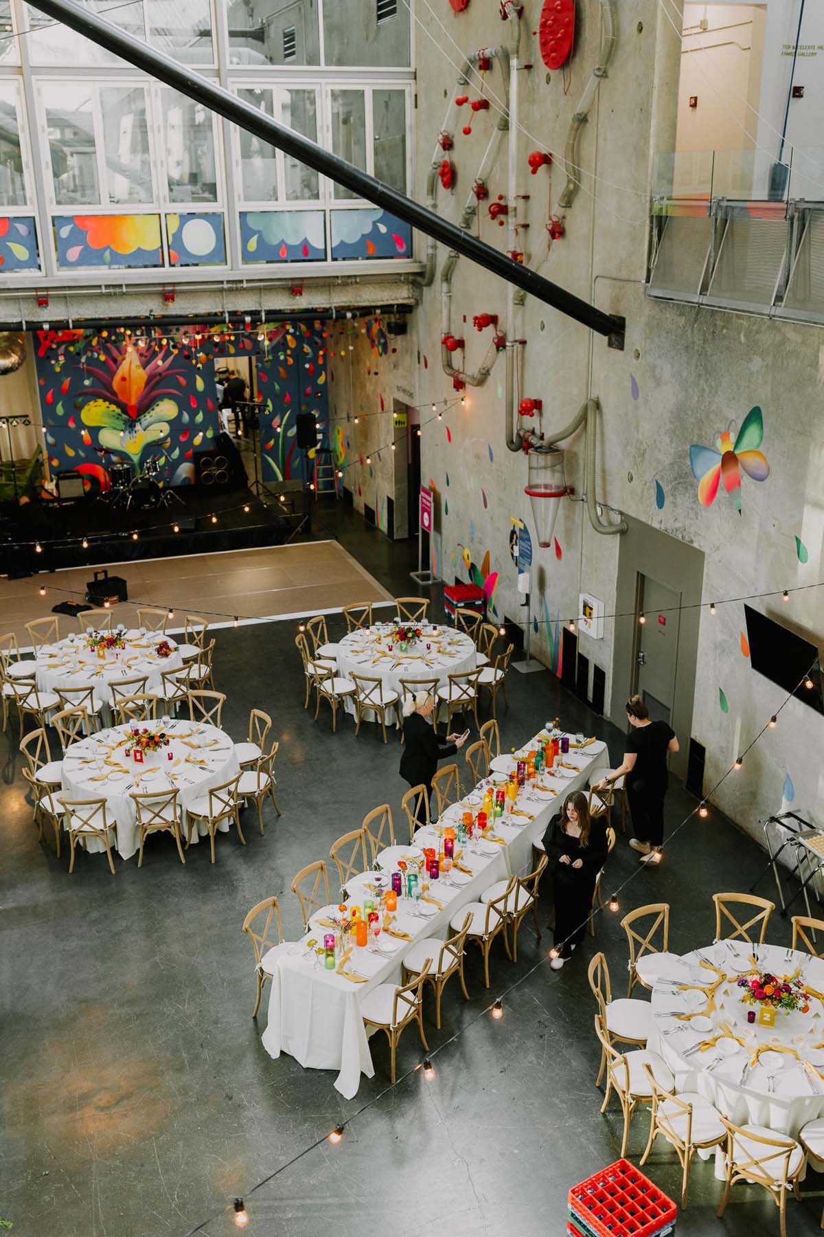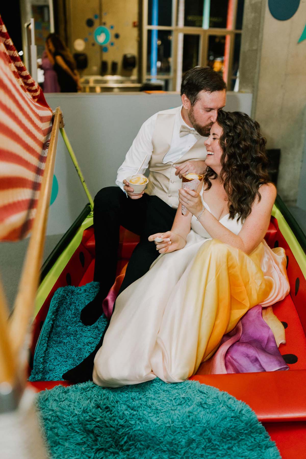 Rachel and Jeremy’s San Diego wedding at New Children’s Museum is bursting with good vibes, no doubt because they made sure everything was aligned closely with their two requirements: that their wedding be 1) colorful and 2) happy. As long as those musts were met, they knew their day would be special and guests would love it too. Details like a custom colorful wedding dress, rainbow tablescapes, a second line with their brass band were just some of the ways they made that happen. 100LC vendor guide member, the talented Lets Frolic Together, was behind the lens for this most joyful bash, and Horton Grand Hotel made for the perfect, intimate downtown spot to say I Do before parading on over to the museum.