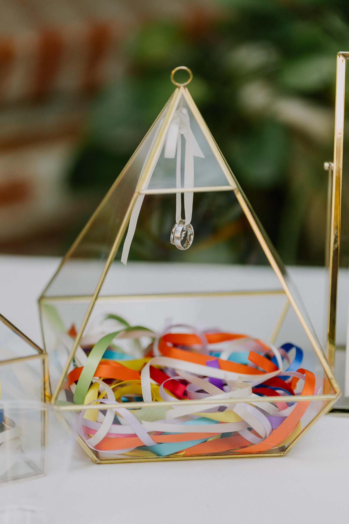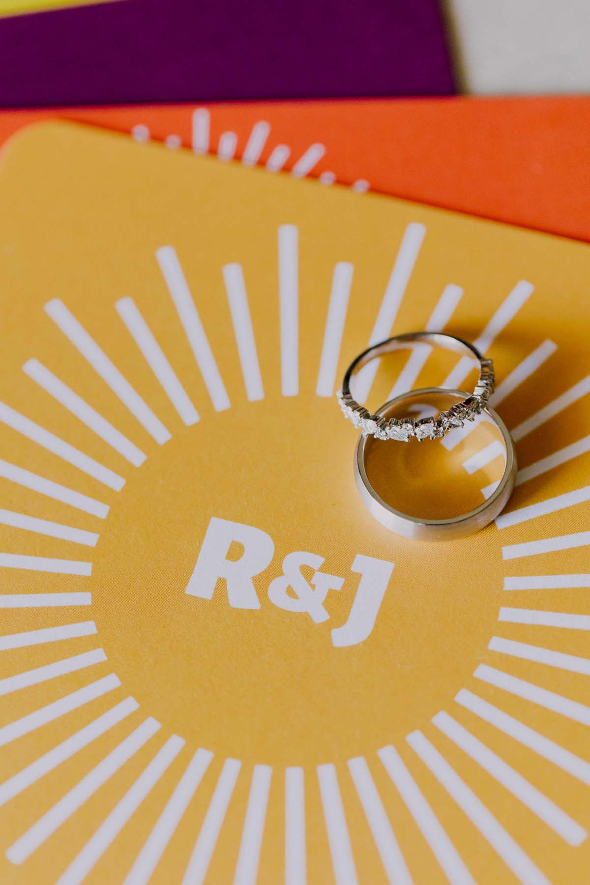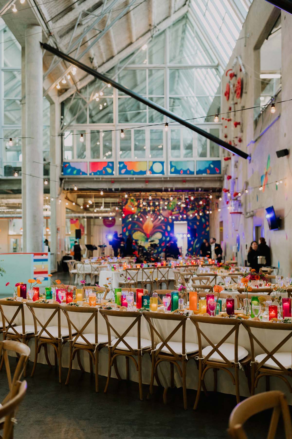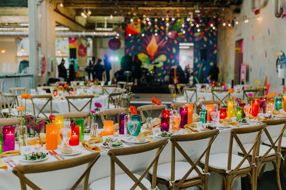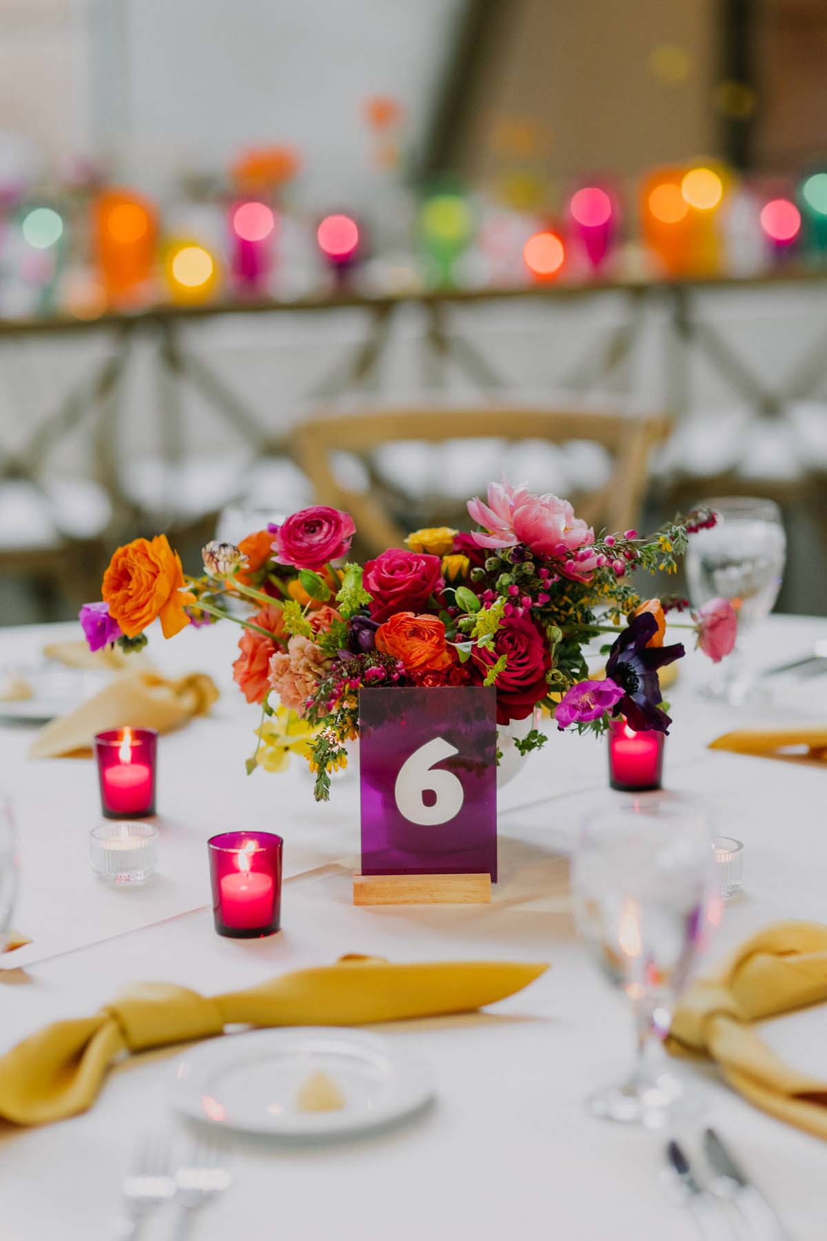 How fun are these electric-hued glass candle holders? When R + J couldn’t find the type of decor they wanted to make their tables pop, they opted to go the DIY route and add colored window film to clear hurricane glasses. They also wanted all of their wedding signage, paper goods, and website to be bright and fun, so to keep the design consistent, they did that themselves, too. So creative and clearly a success!