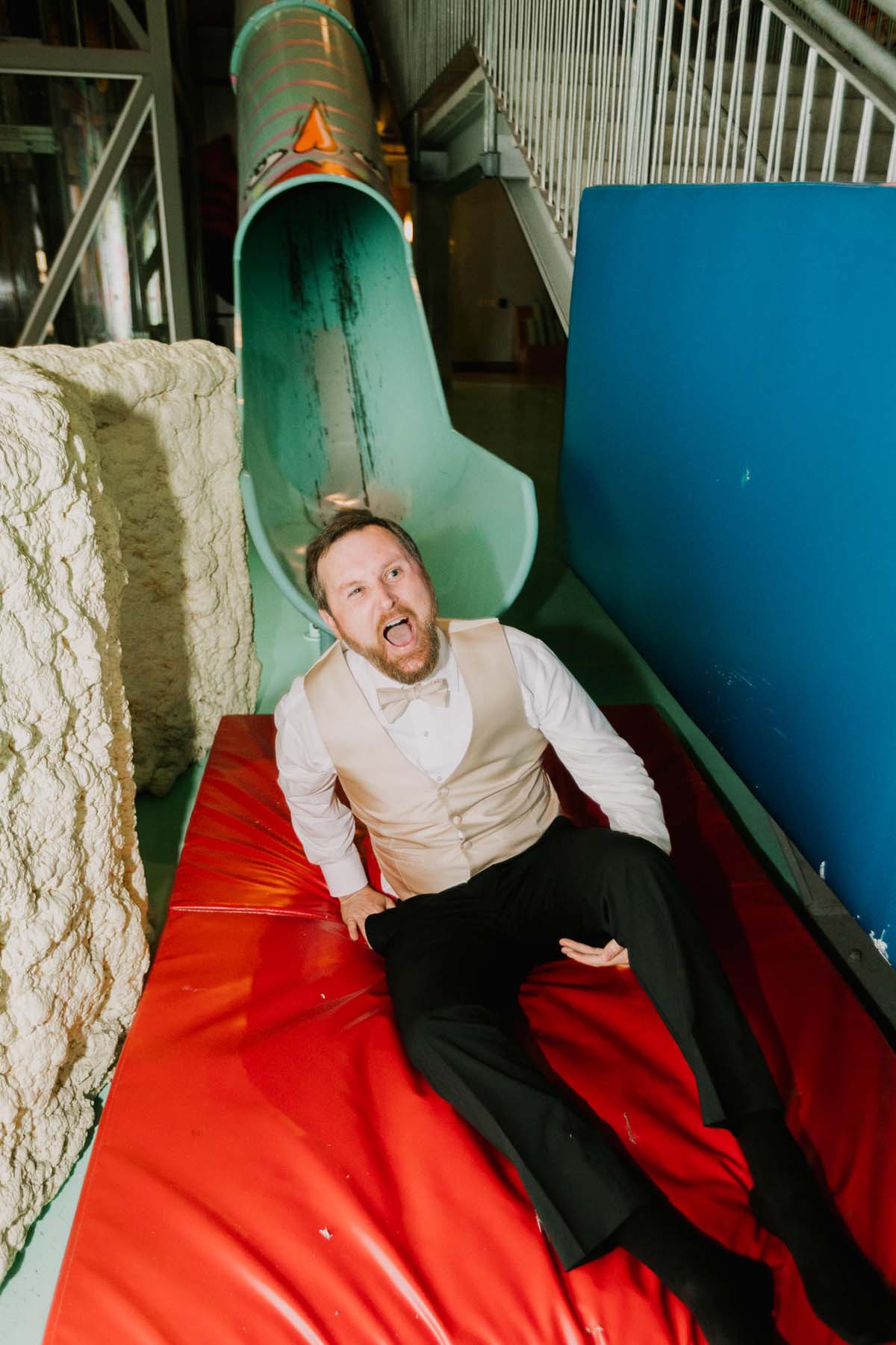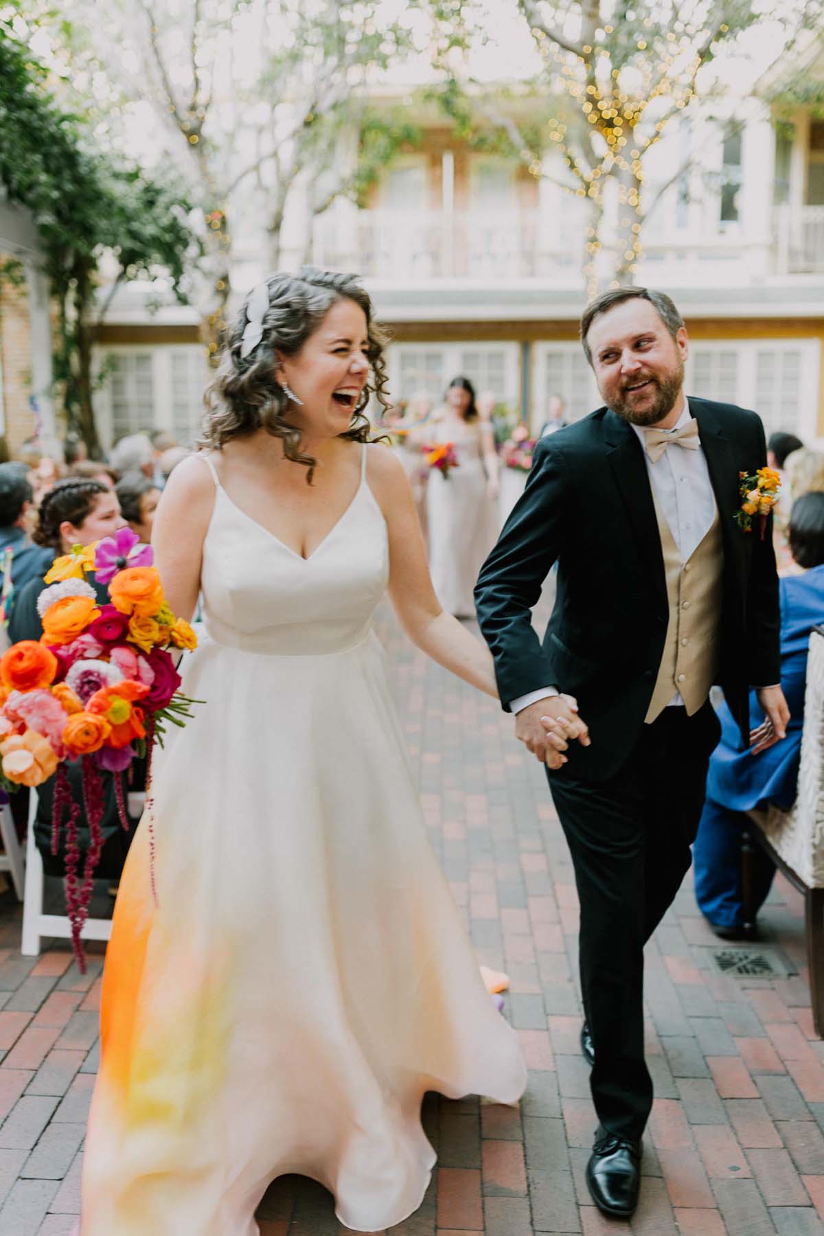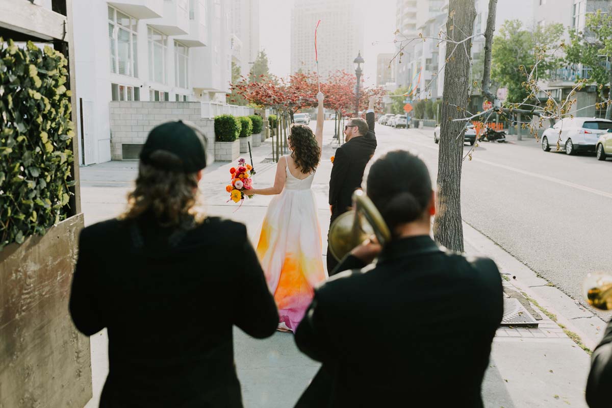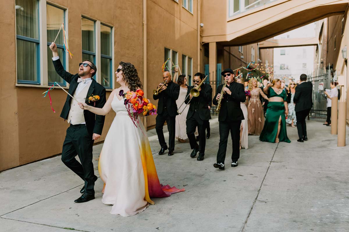 The New Children’s Museum in San Diego is a modern art museum for children. Walking into the venue it just felt unique, interesting, and, most importantly, happy. We thought all the colors on the walls would only be a perfect backdrop for all of our colorful attire and the opportunity to slide down a two story slide on our wedding day was a big plus. For our ceremony location we were excited to find the Horton Grand, which was only a few blocks away from the reception venue. We had already booked a band with brass instruments, so a New Orleans second line seemed like the perfect way to get our guests from the ceremony to the reception. We also wanted the ceremony to still have soul and significance before moving on to the craziness and fun of the reception. Having all of our guests parade down the street with brass horns playing was the perfect transition.