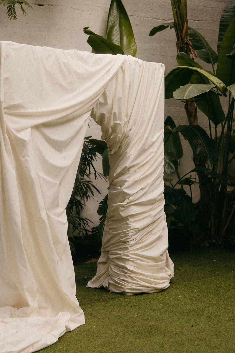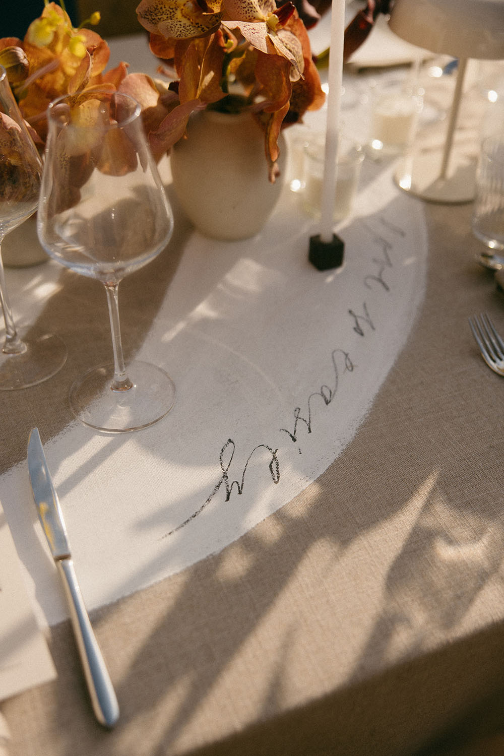 Better & Co. created their modern stationery and signage, and hand-painted this cream tablecloth with swaths of white and romantic calligraphed messages.