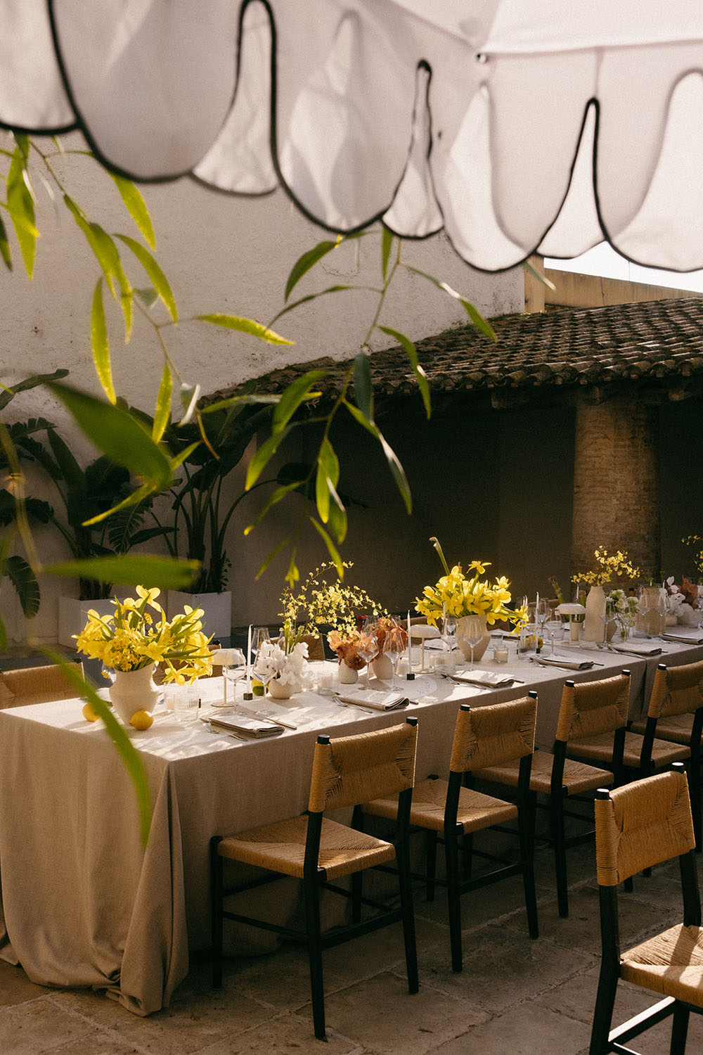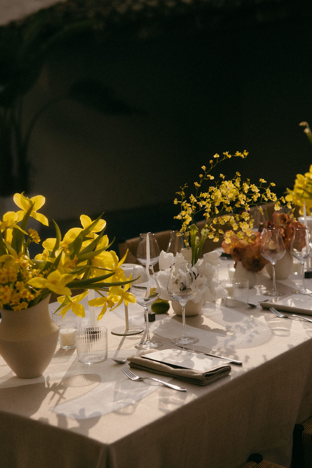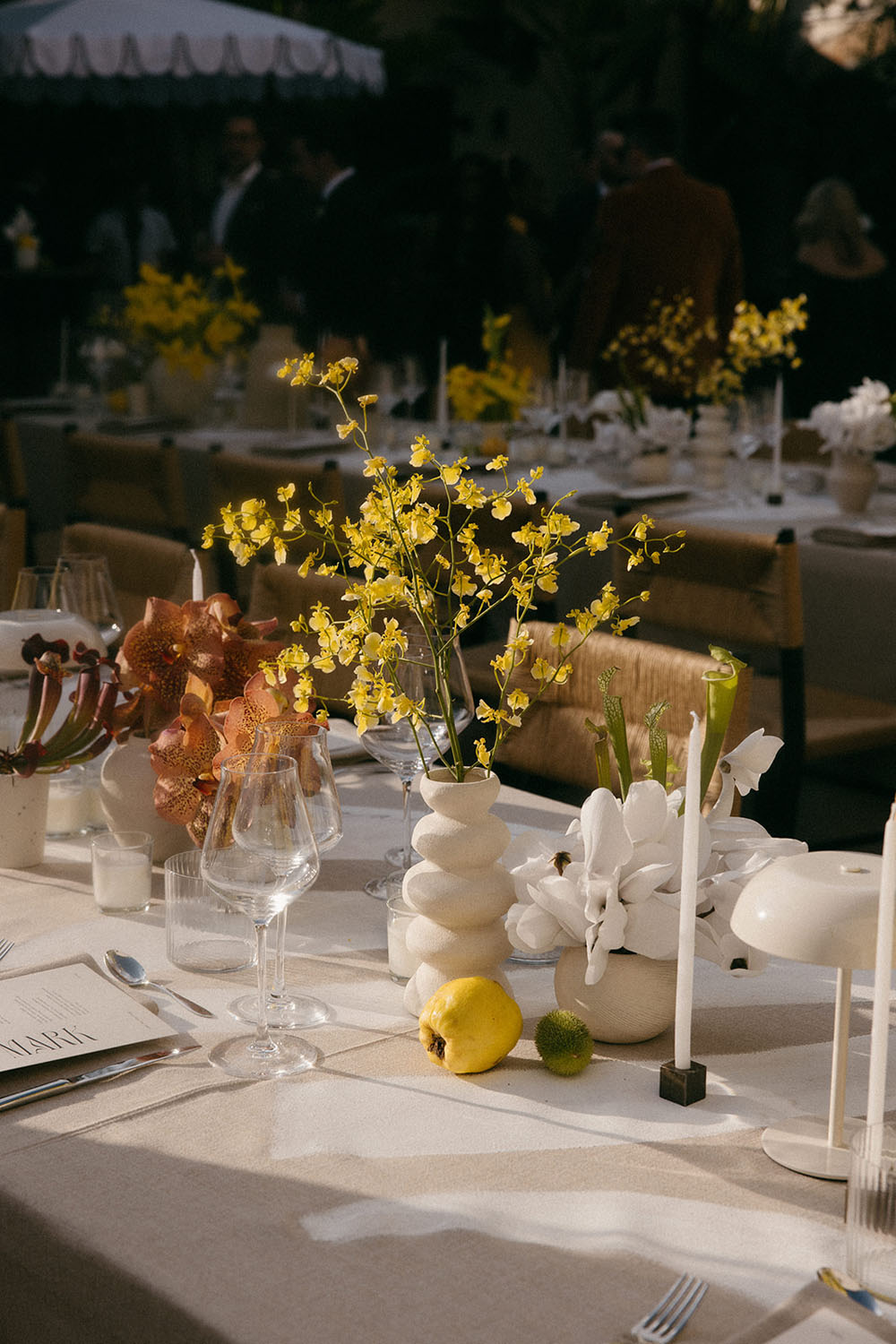 Fresh lemons, yellow flowers, ceramic vases, and modern lamps made up this chic tablescape design.