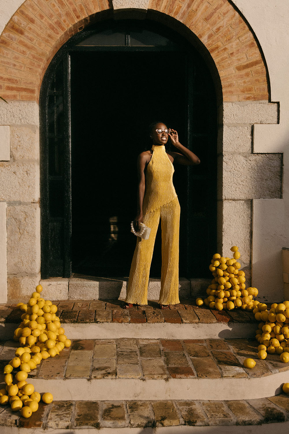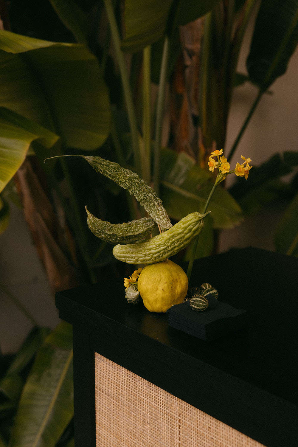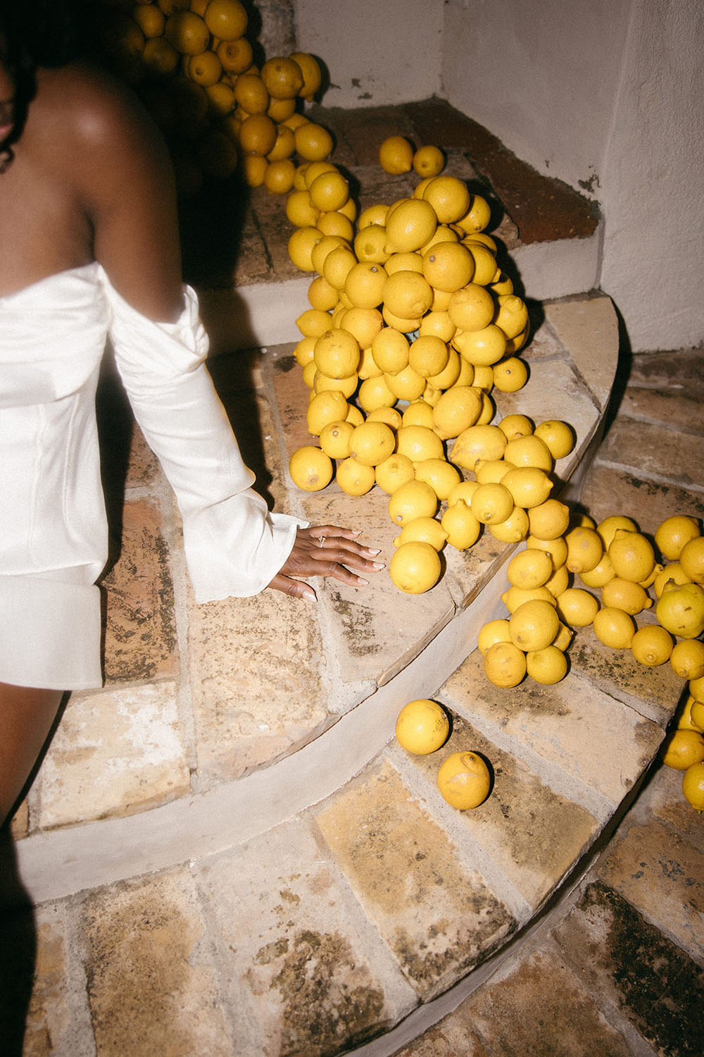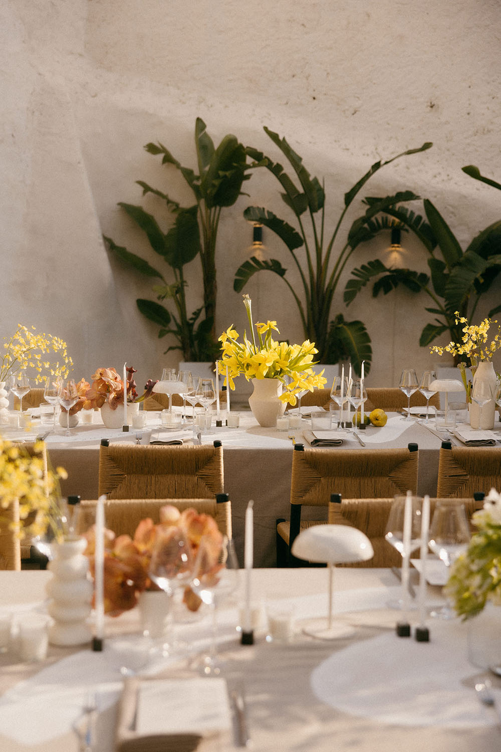Fresh lemons, yellow flowers, ceramic vases, and modern lamps made up this chic tablescape design.