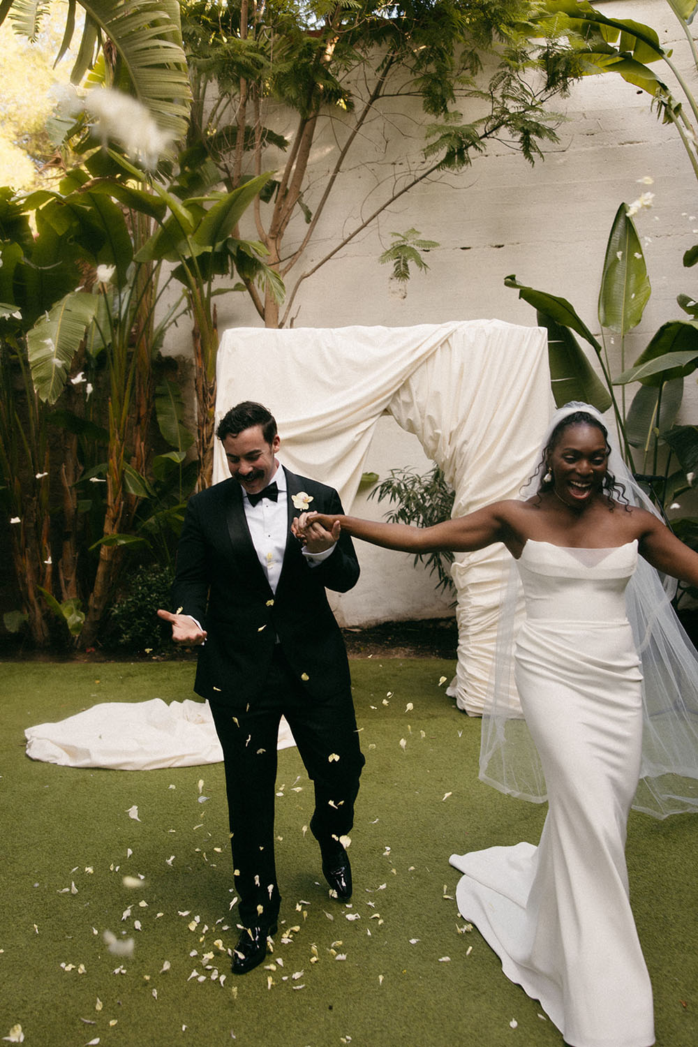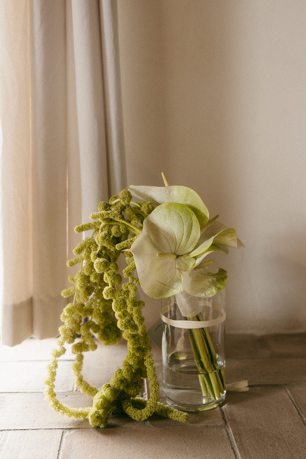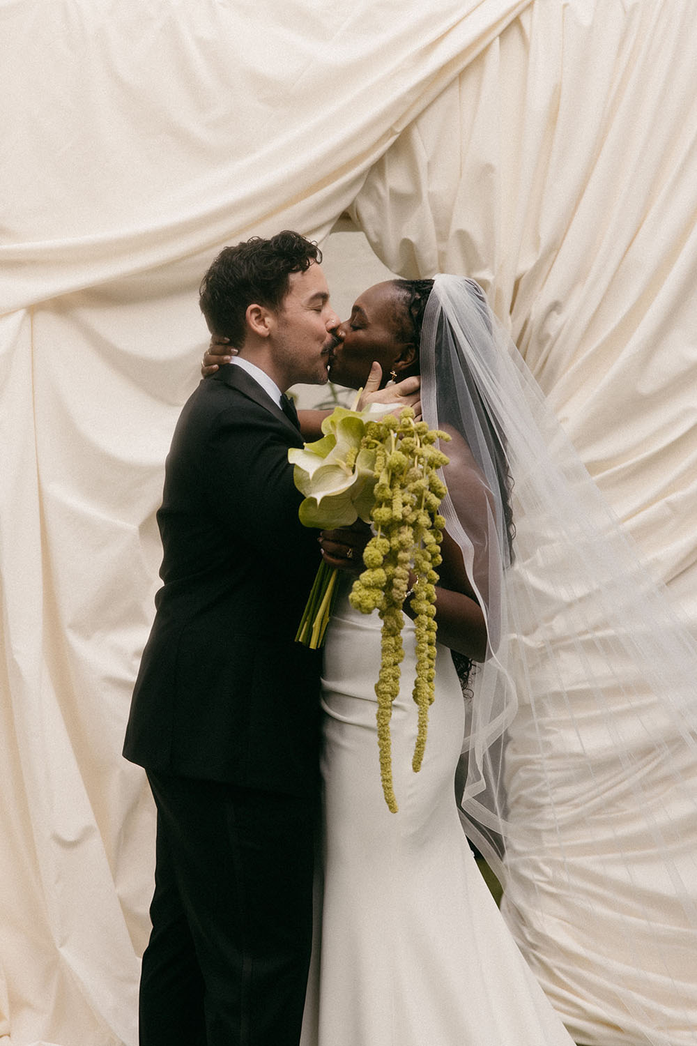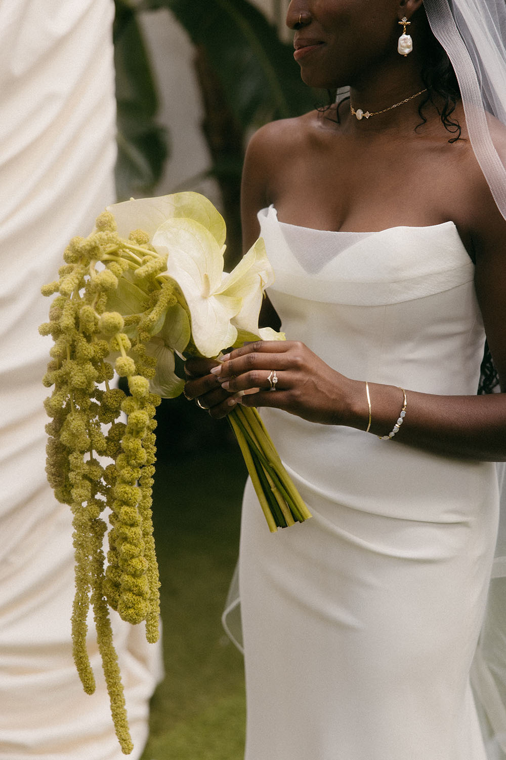 The bride complemented her modern wedding gown with a minimalist but sculptural green bouquet.