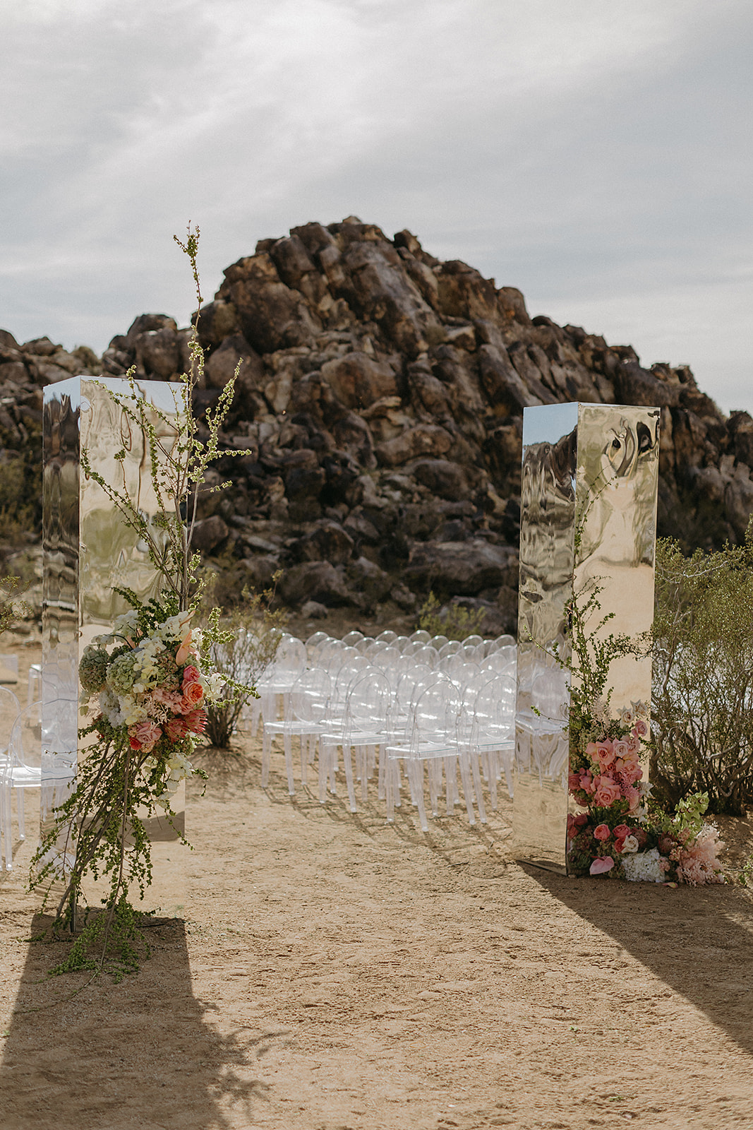 Their refined yet organic wedding theme really took off when Ciara happened upon a photo of DJ Tiësto’s wedding to model Annika Backes in the Utah desert, which featured a fully mirrored ceremony arch that reflected the beauty of the surrounding landscape. She says, “We built out this idea of a mirage in the desert since we had to essentially build this event from the ground up being in such a remote area like Joshua Tree. I wanted something that felt very refined, but organic, and my husband is more rugged so I spent a lot of time trying to find a venue that felt like the both of us. I loved the idea of having a black-tie event in an environment that doesn’t necessarily seem to fit that aesthetic. The juxtaposition of an upscale event in the dirt felt fun and unexpected.”