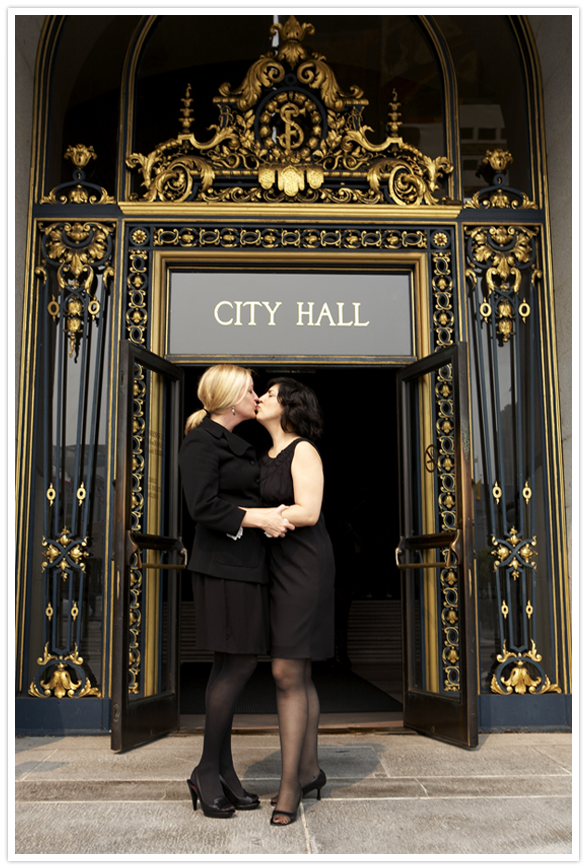 Dresses: Carmen Marc Valvo / Officiant: Sheila Kappeler sheilakappeler {at} gmail {dot} com / Venue: beautiful rented house in Berkeley with a downstairs party room and large terrace surrounded by greenery. www.36domingo.com / Photography: Laura Morton / Diana camera and photo at the courthouse: Scott Clark / Catering: Catering was Chef Adair. Absolutely delicious. Because our wedding was only 36 people, we hired a private chef instead of a large catering company. / Dessert: Kara’s Cupcakes