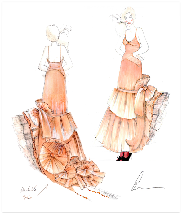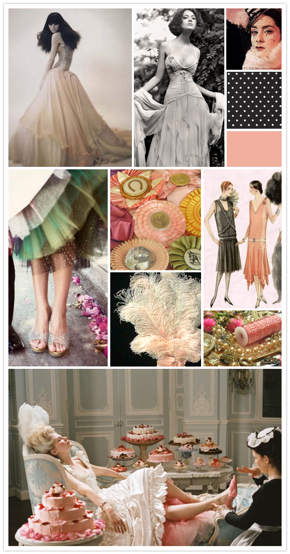 We have to say, it has been such a fun time opening the emails our friend Jenna sends us with her wedding inspiration tidbits. The latest one is insane. Ruffles, pleats, pink poofy layers, soft feather plumes and shiny prize ribbons. Jenna’s dress is being crafted as we speak by her talented sister, Sarah (hello, handmade!!), who studied fashion design at the Chicago Art Institute. Sarah is also currently working on her own line due to be finished this summer (more to come on that later). Behold – a feast of sugary delights: