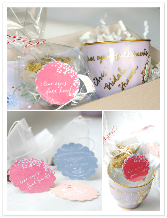 She worked with our now friend and DIY contest winner Bryn of Paperfinger (we didn’t know her when she won the contest, we swear), for the pretty calligraphy. Bryn wrote a bunch of different messages, including a quote Christina is using in her invitations, on the vintage tea cups using gold pen. And Mimi also included tea bags with little handmade tea tags in each guest gift.