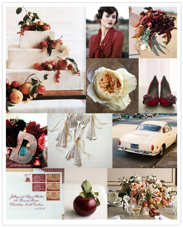 Row 4: envelope with red calligraphy and vintage stamps from Martha Stewart Weddings, red apple photo by Karen Wise, centerpiece with peach roses and pomegranates from Martha Stewart Weddings