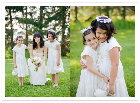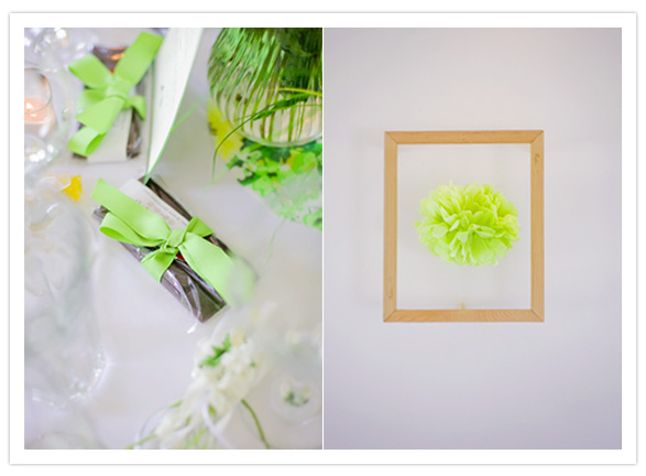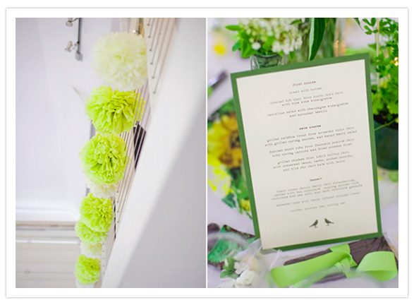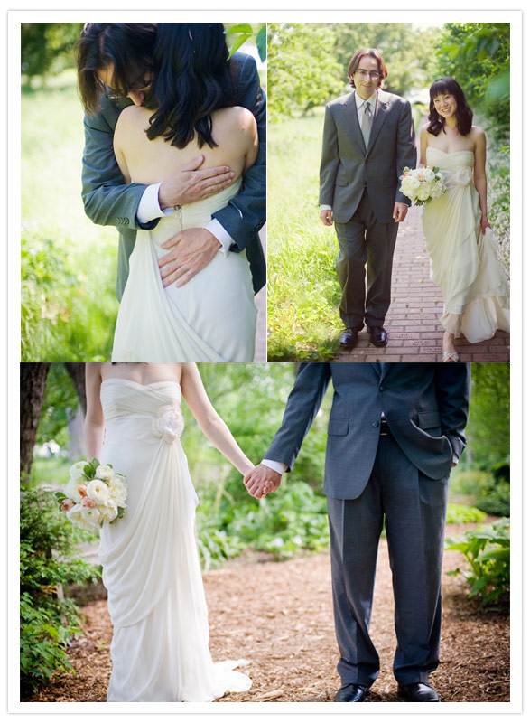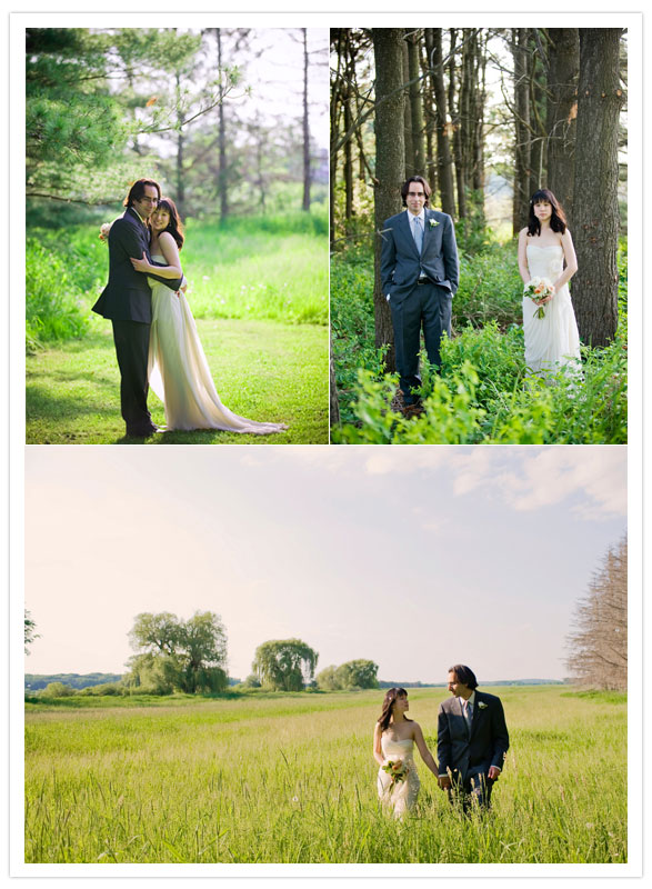 In keeping with their earth loving theme, they chose green and white as their colors. Their caterer served local, seasonal, organic food. The bouquets were made from local peonies and ranunculus, their invites printed by a green printer, and their wedding rings were made from recycled platinum and gold.