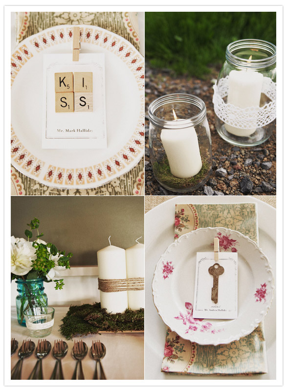 For the reception, Jillian made fun escort cards inspired by the Us Box we posted from Summer of Grey Likes Weddings. Guests picked up their escort card and then found a corresponding phrase at their seat. Christina’s said “I Heart” and “Mark”. Cute idee-er! Christina found the trinkets on Etsy.