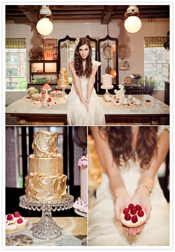 This next set is a total baker’s delight. Look at all those delicious treats…macaroons and the teensy tiny berry tarts are such a perfect option for the couple who aren’t into cake-y things. And is that a….golden frosted cake? Love it!